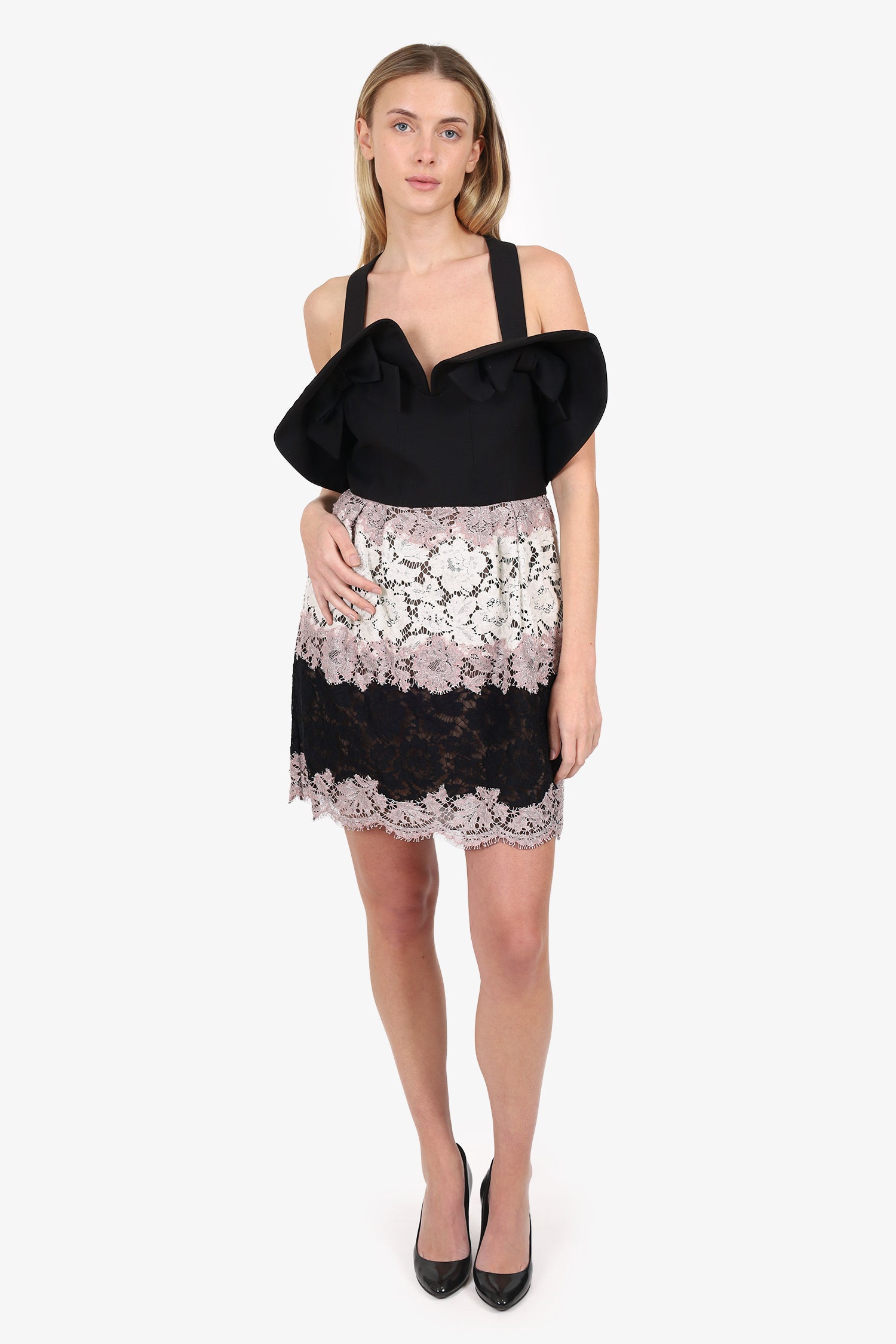 Refresh availabilityValentino Black/Pink Bow Detail Sleeveless Lace Dress. Slip-on. Sweetheart neckline. Adjustable shoulder straps with button-up closure. Rear zip with hook-up closure. Lined interior. Tonal stitching.