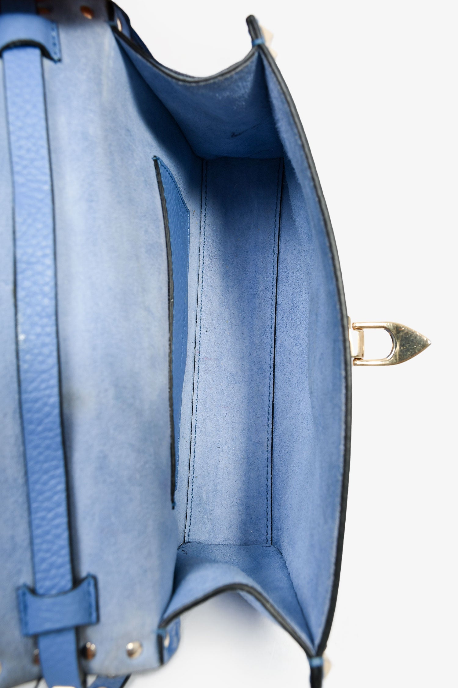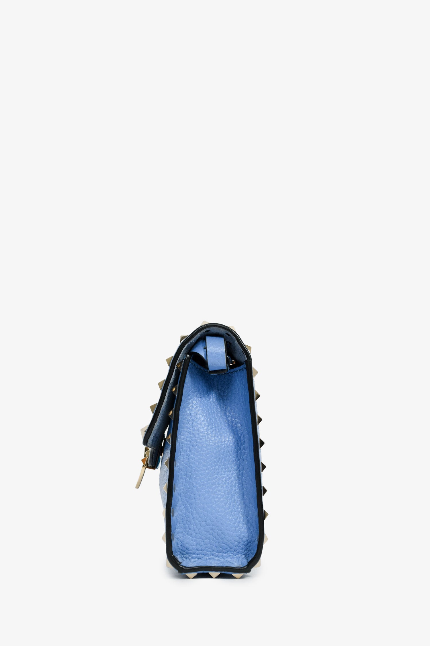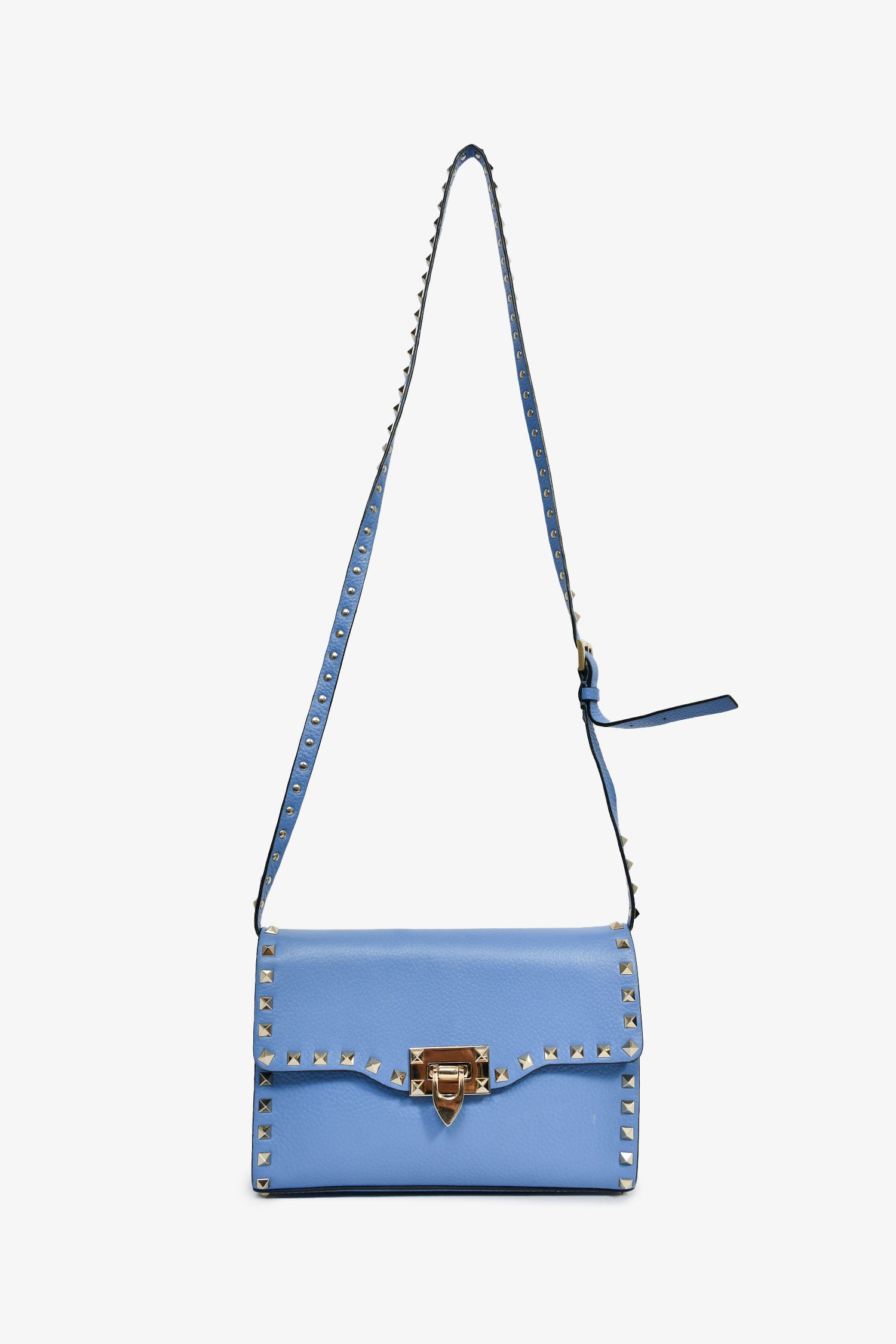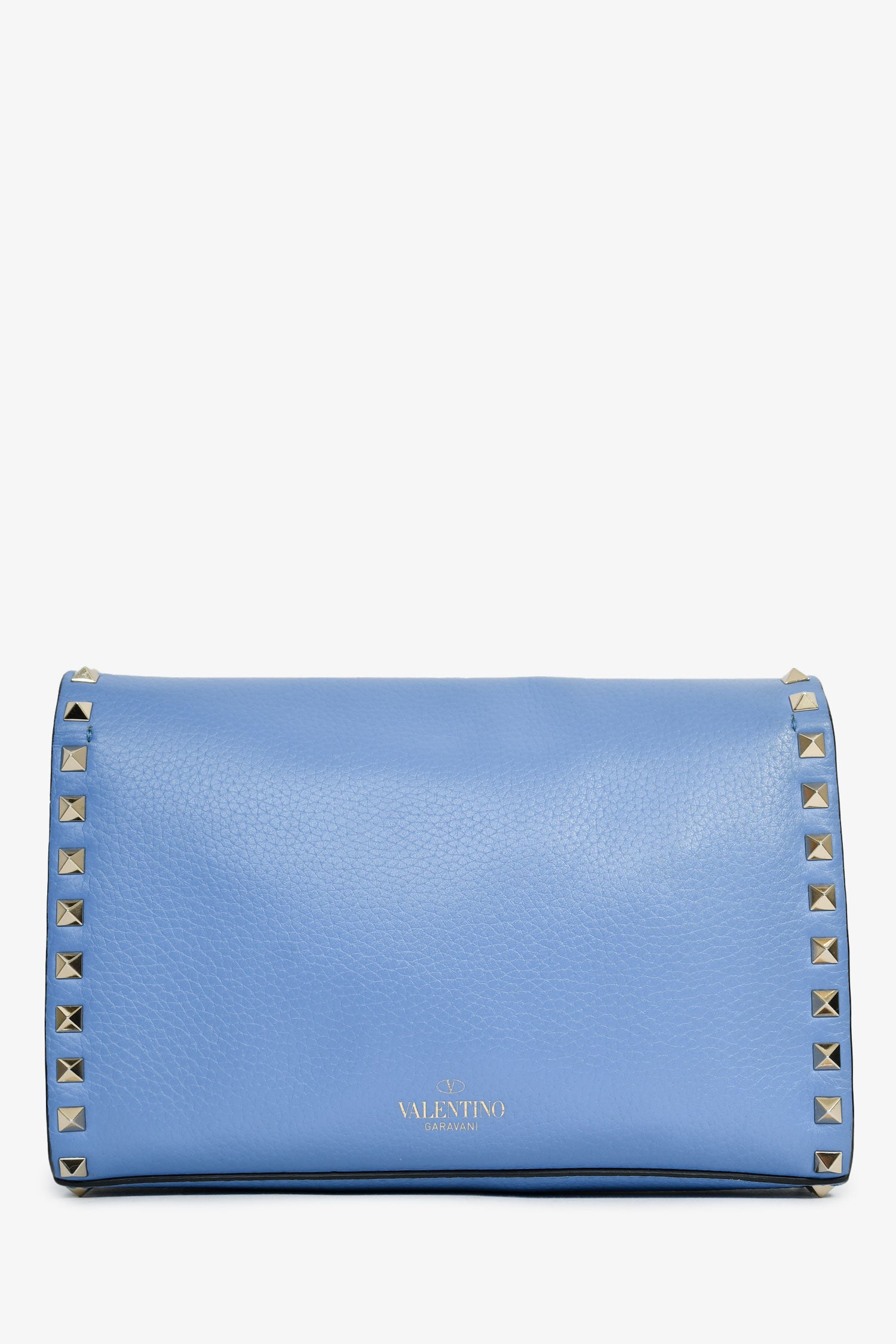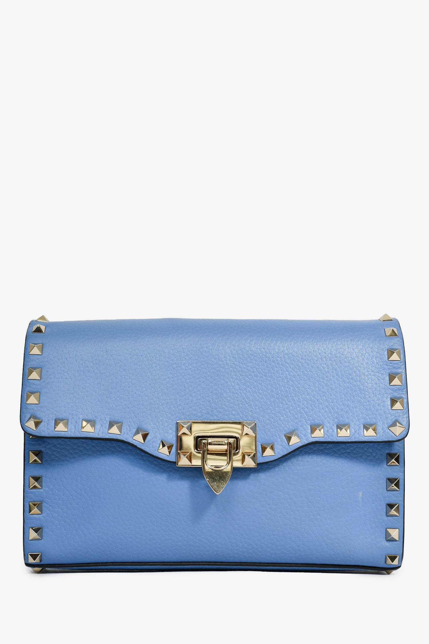Refresh availabilityValentino Blue Grained Leather Rockstud Crossbody. Front fold-over flap with a flip lock closure. Single crossbody strap. Suede-lined interior with single leather card pocket. Coated edges. Gold-tone hardware. Tonal stitching.