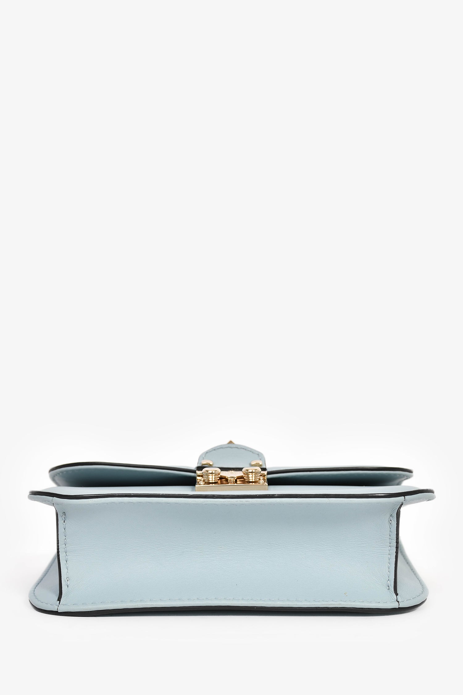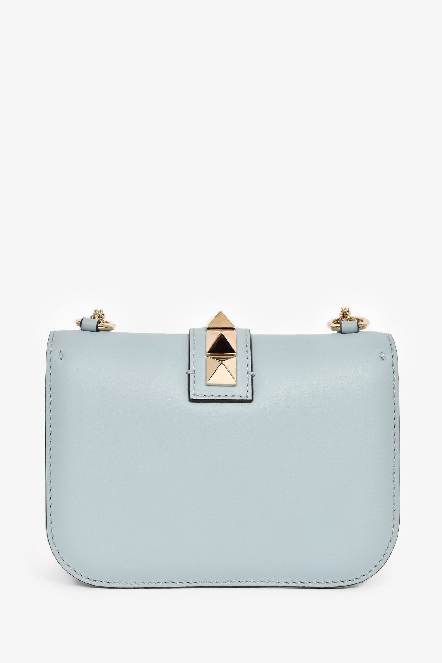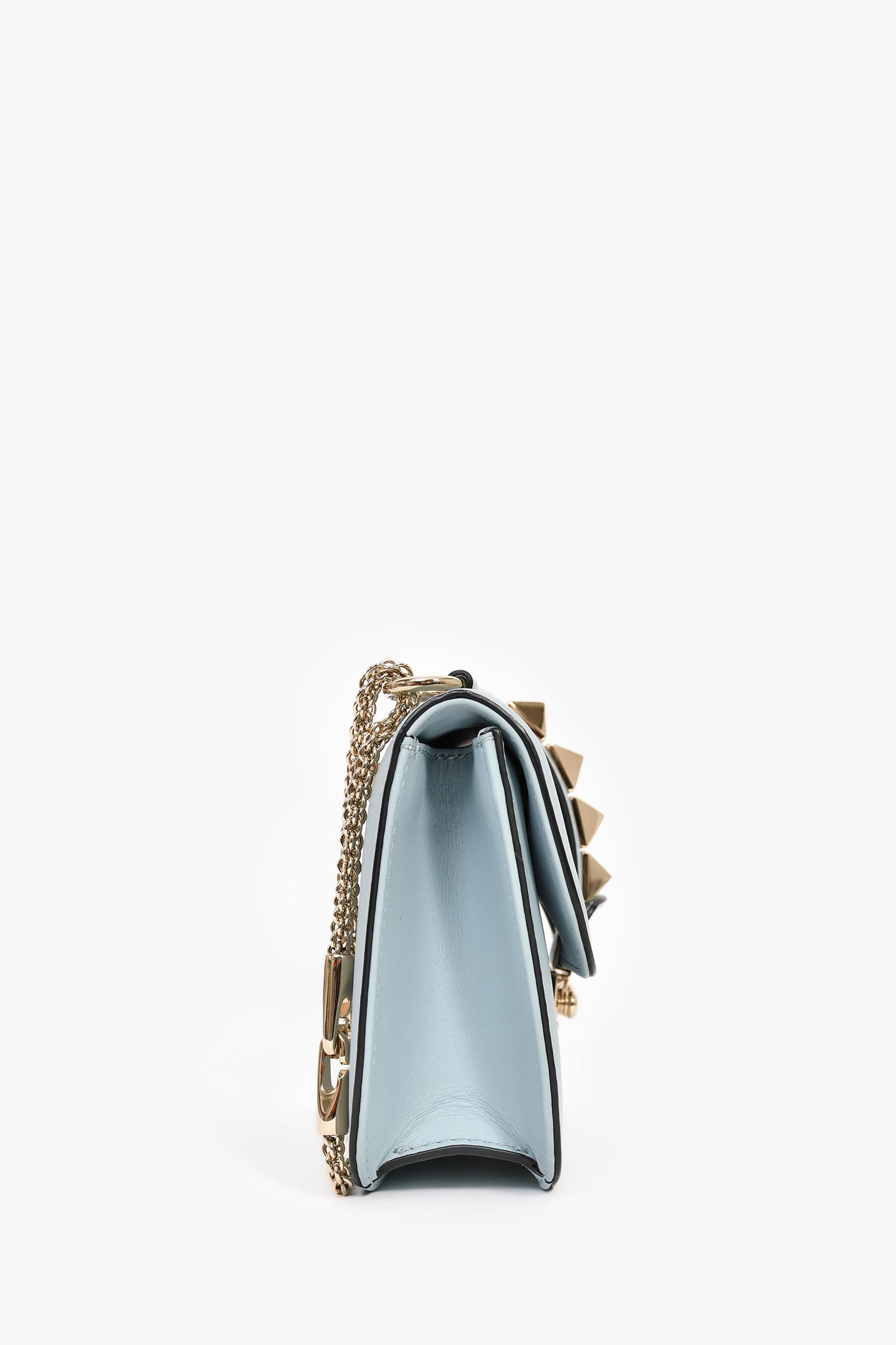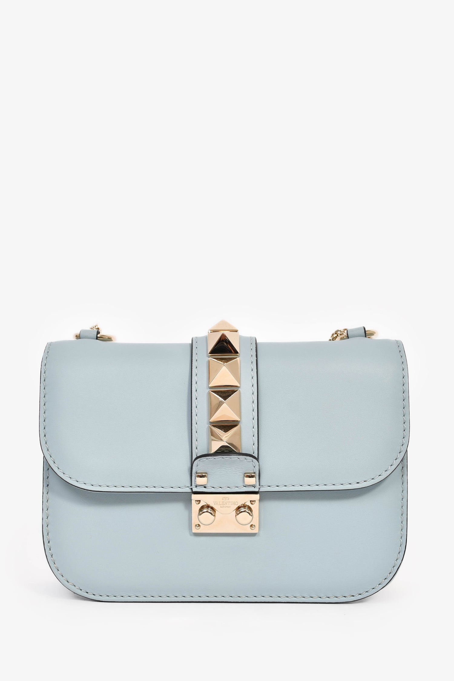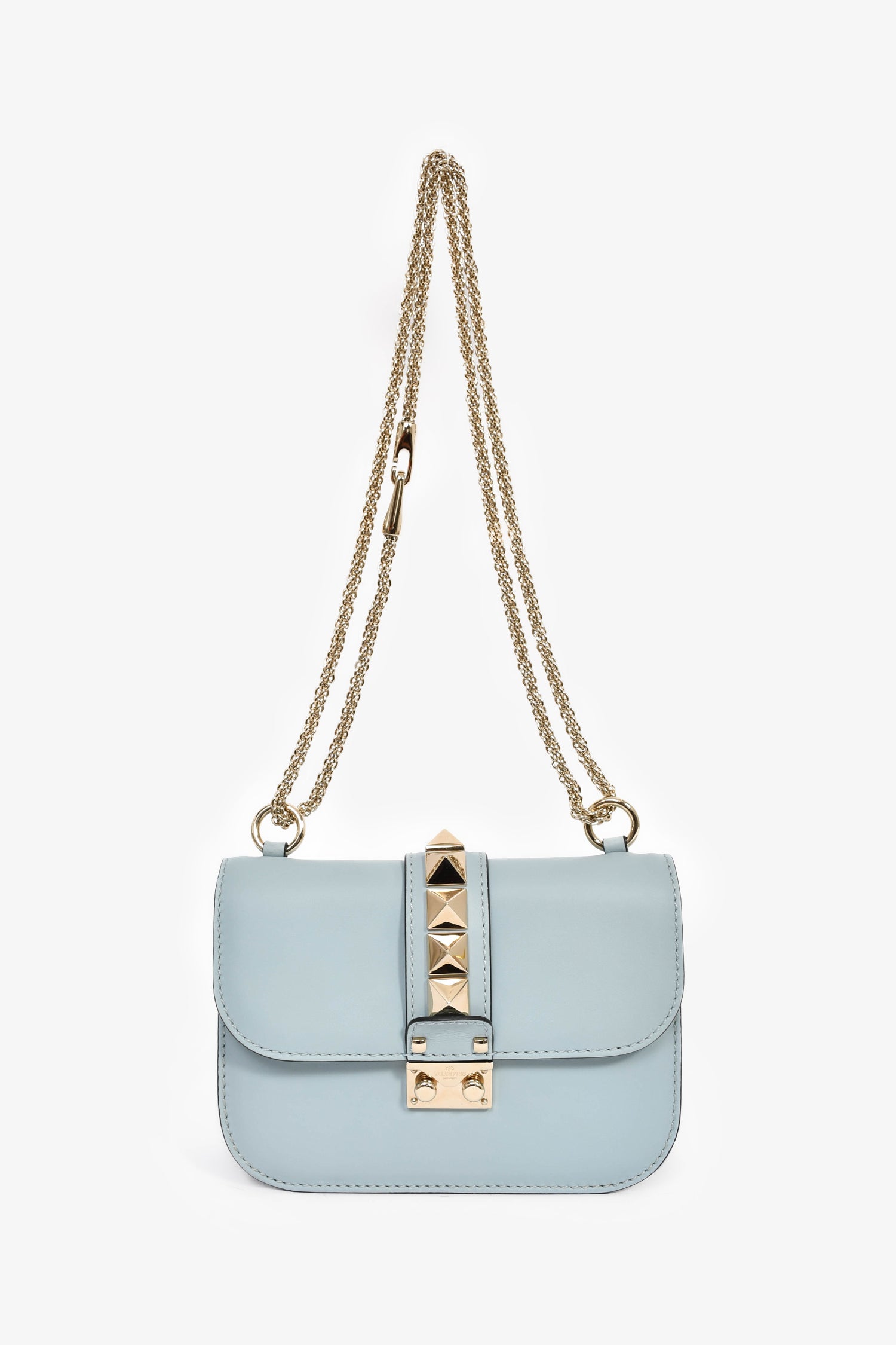 Valentino Blue Leather Roman Stud Shoulder Bag. Front fold-over flap with pinch-lock closure. Slide-around chain strap. 2 interior wall pockets; 1 slip, 1 zip. Textile-lined interior. Silver-tone hardware. Tonal stitching.
