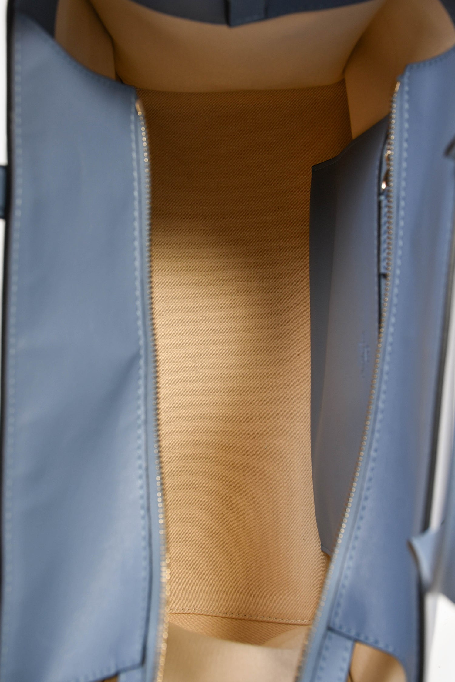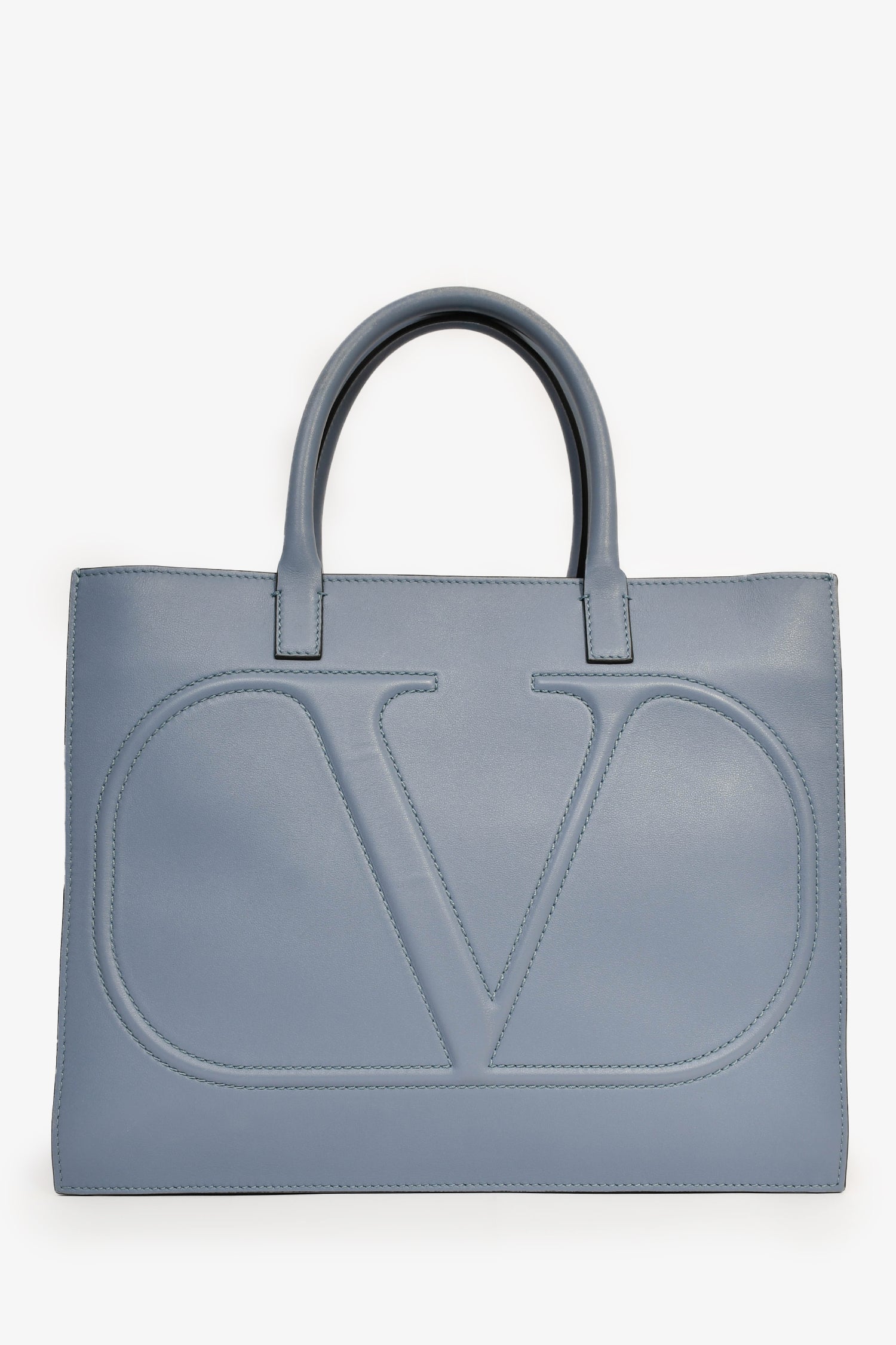 Refresh availabilityValentino Blue Smooth Leather 'V' Logo Tote. Dual handles. Top zip closure. Twin top handle. Cream textile interior lining. Single interior wall flap with zip pocket. Gold-tone hardware. Tonal stitching.