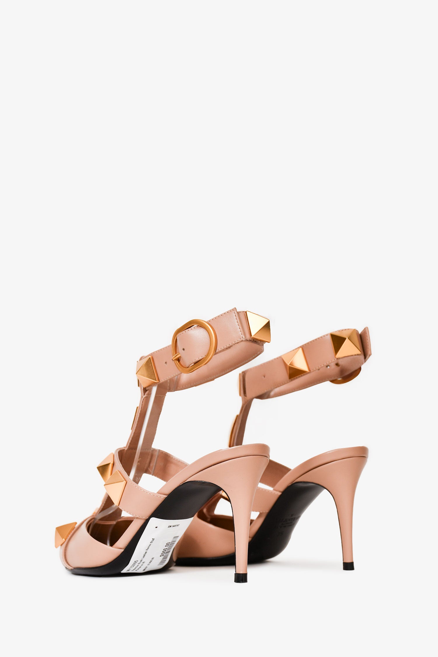 Refresh availabilityValentino Blush Leather Roman Stud Pumps. Ankle strap with buckle closure. Pointed toe. Gold-toned hardware. Tonal stitching.