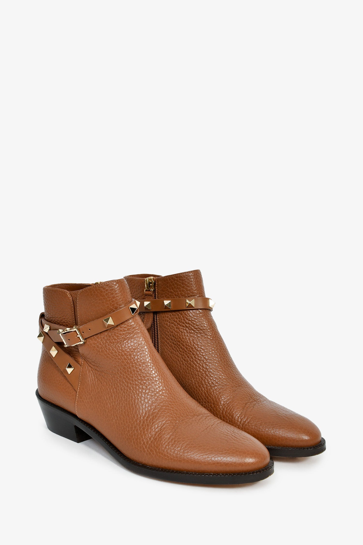 Refresh availabilityValentino Brown Grained Leather Rockstud Flat Ankle Boots. Pull-on. Almond toe. Side zipper and buckle closure. Gold-tone hardware. Tonal stitching.