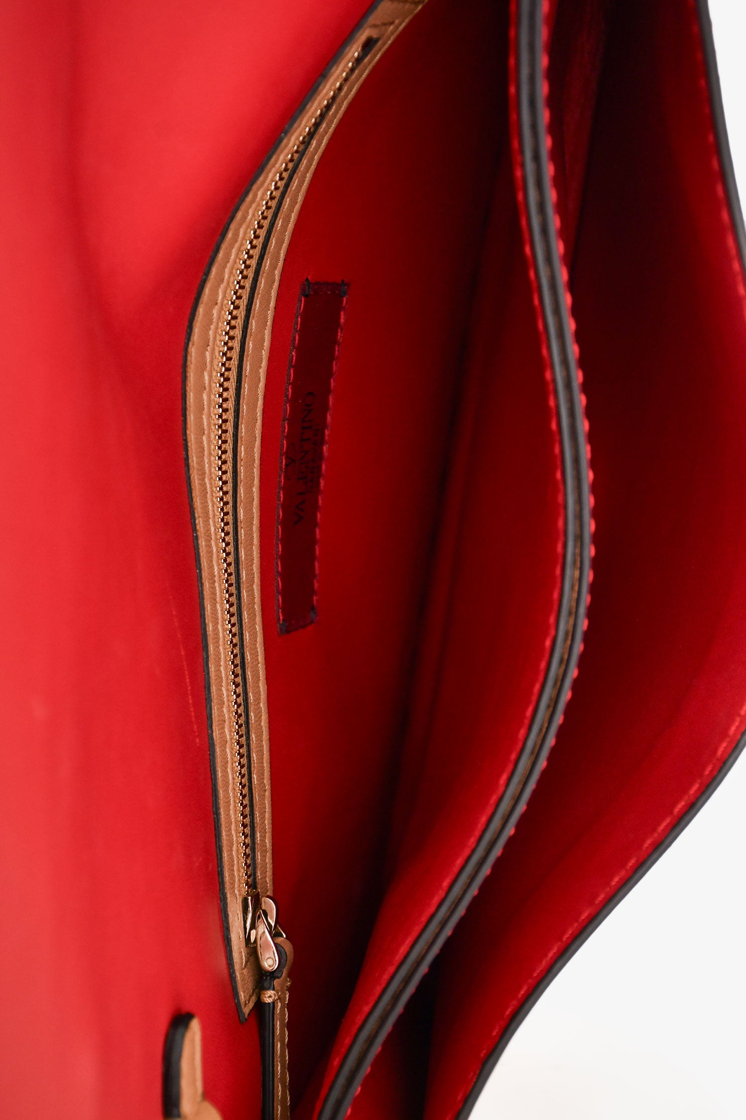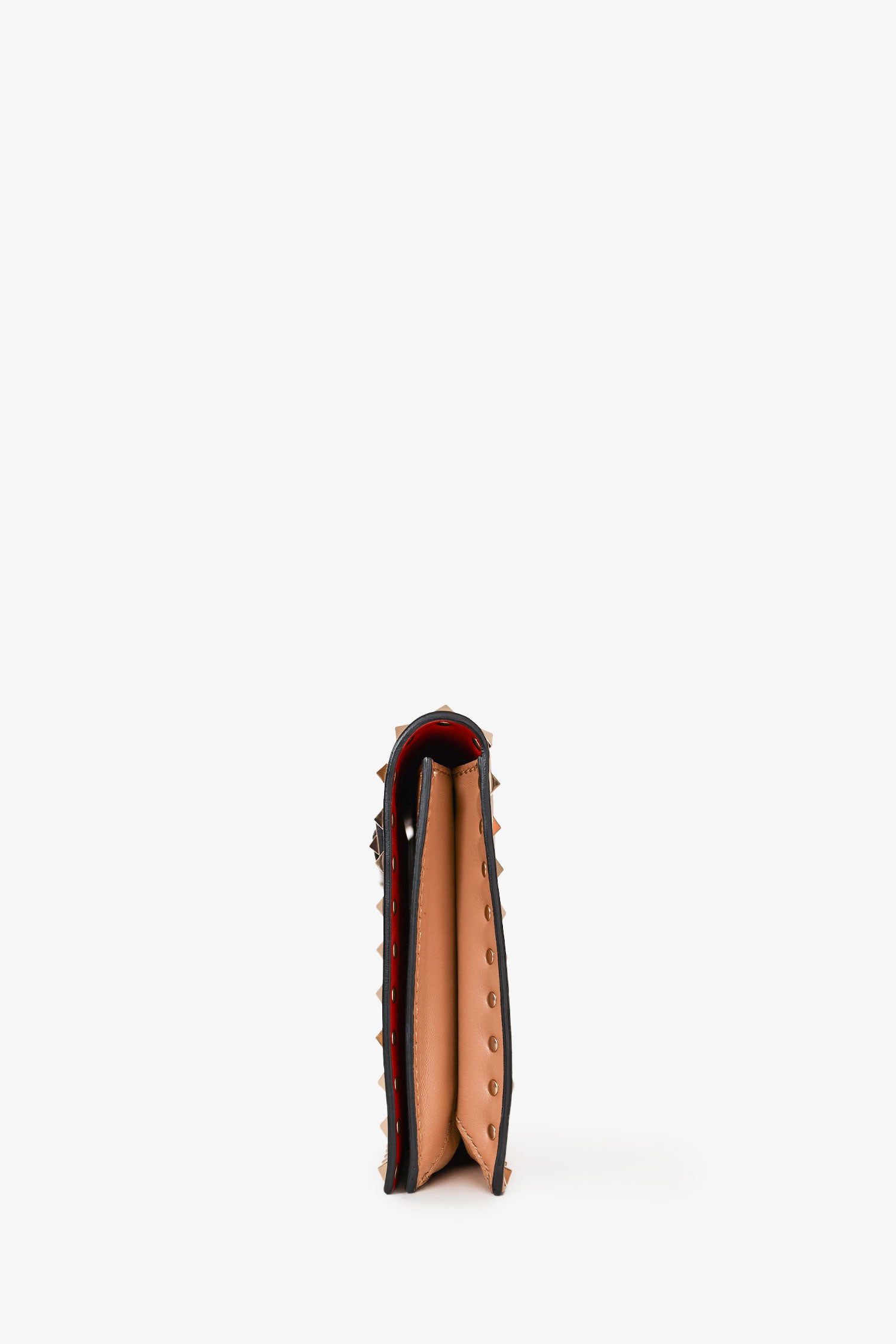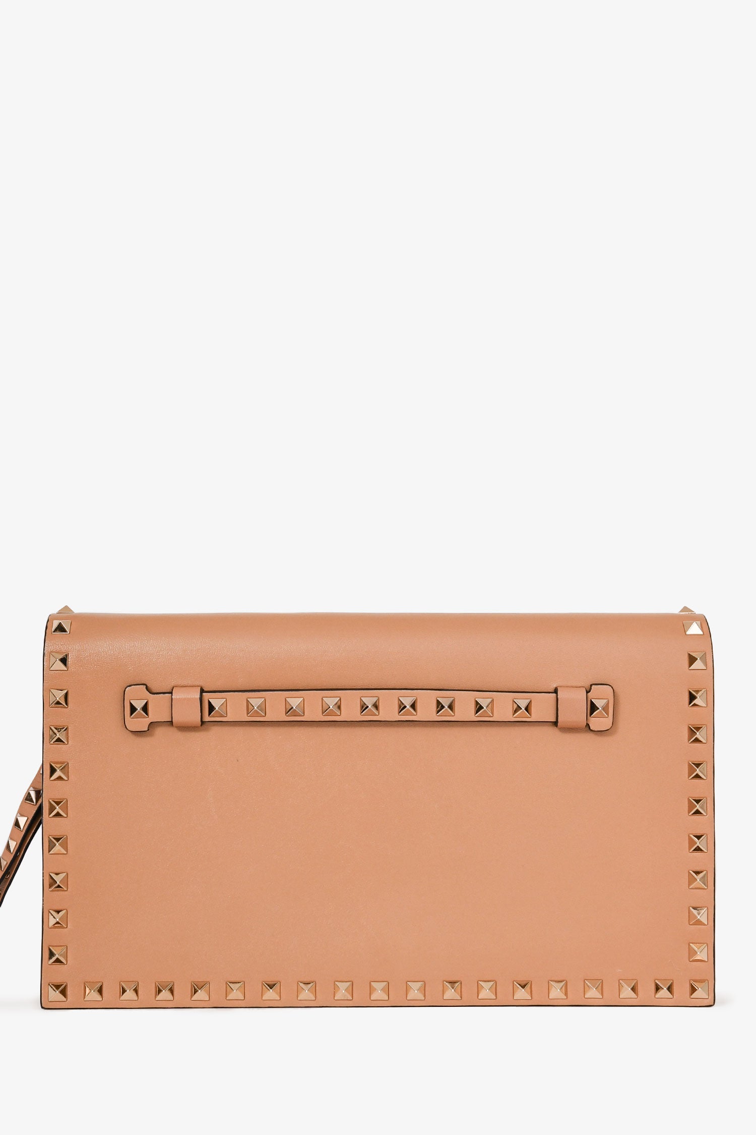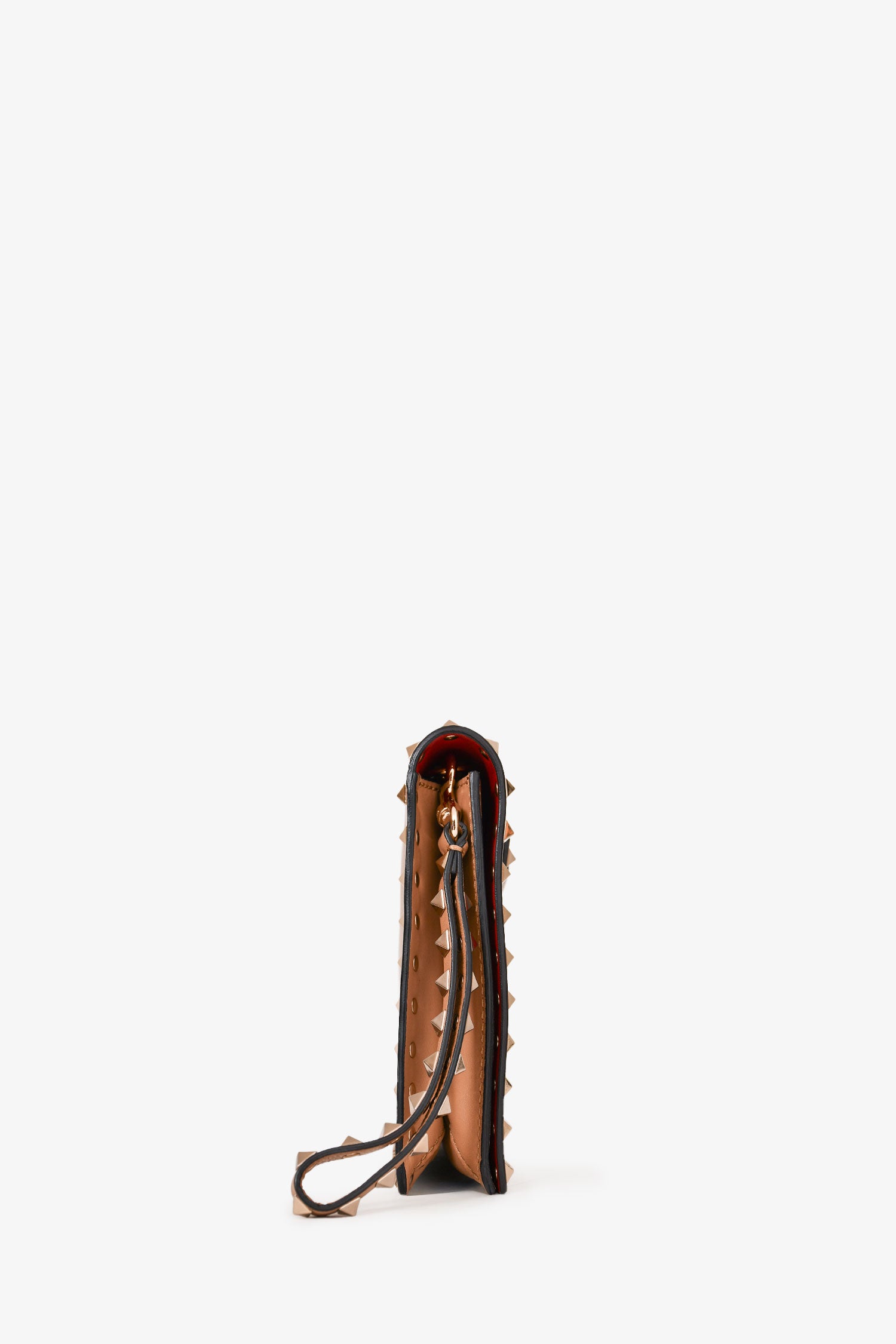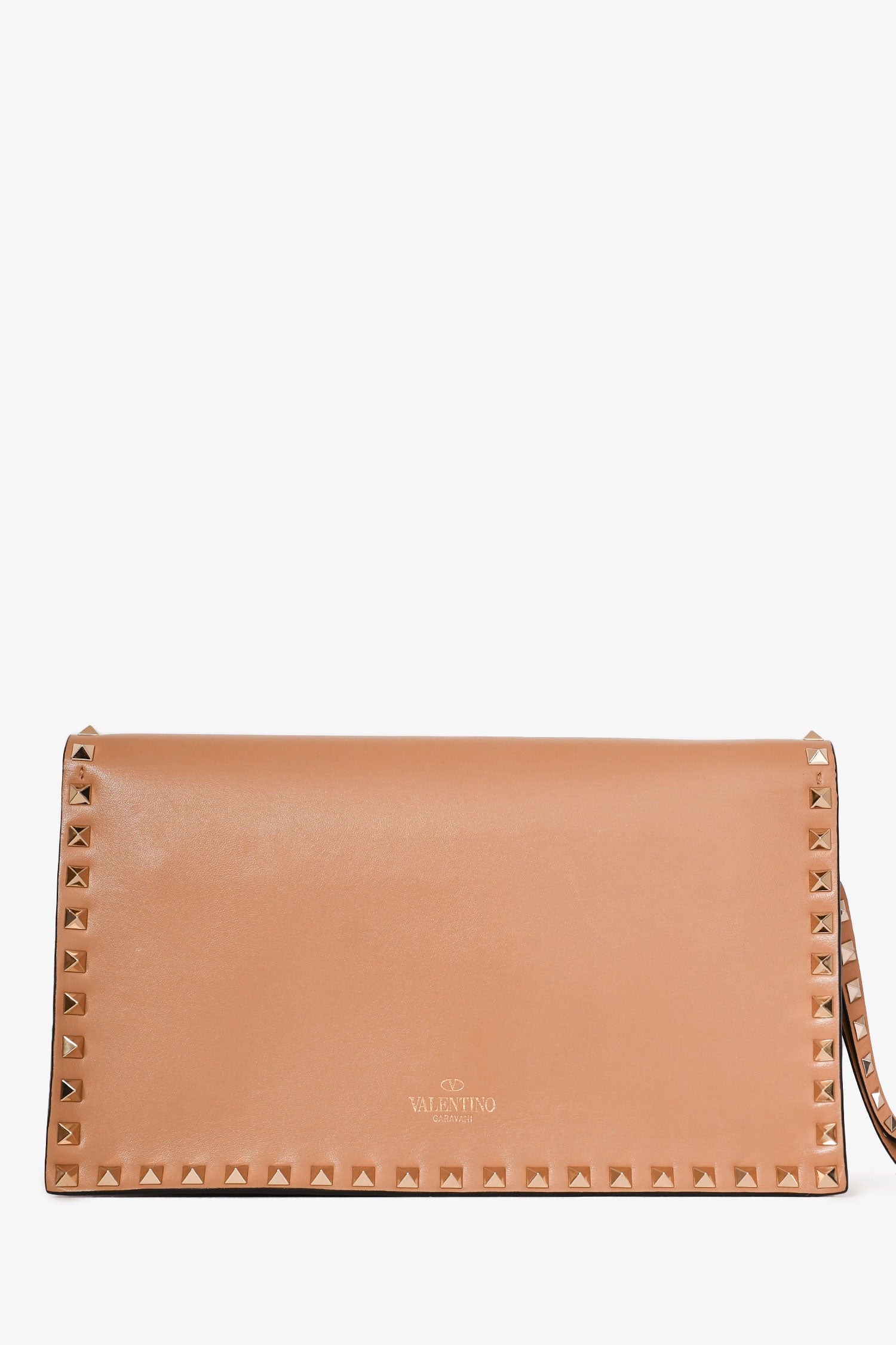 Refresh availabilityValentino Brown Leather Rockstud Clutch. Gold-tone hardware. Fold-over flap with a snap closure. Attached wristlet. 3 interior compartments. Zipped wall pouch. Coated trimming. Tonal stitching.