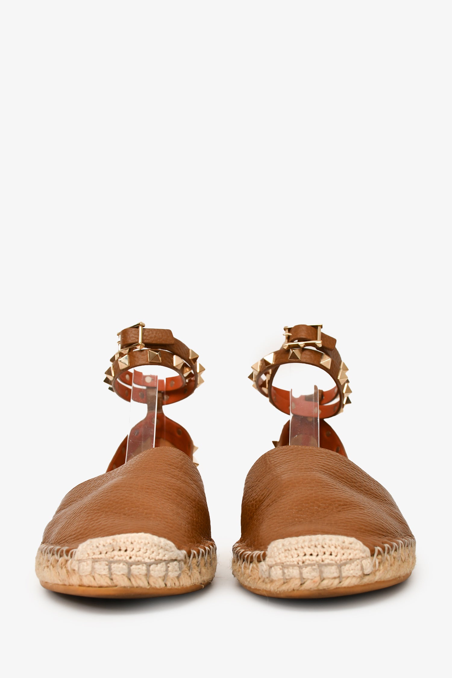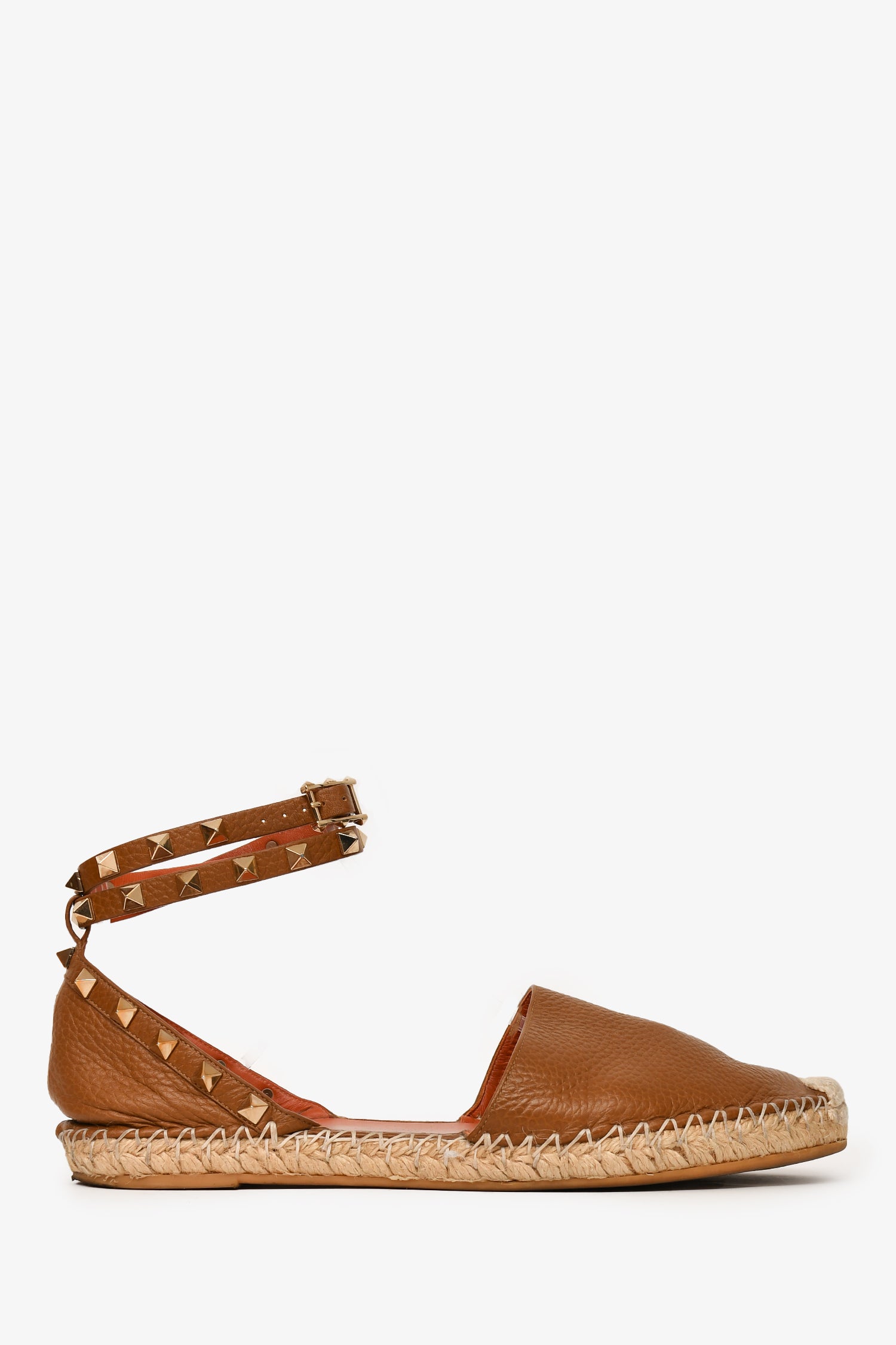 Refresh availabilityValentino Brown Leather Rockstud Espadrilles. Wrap-around leather ankle strap with studs. Pin-buckle. Leather insole and outer trimming. Tonal stitching.