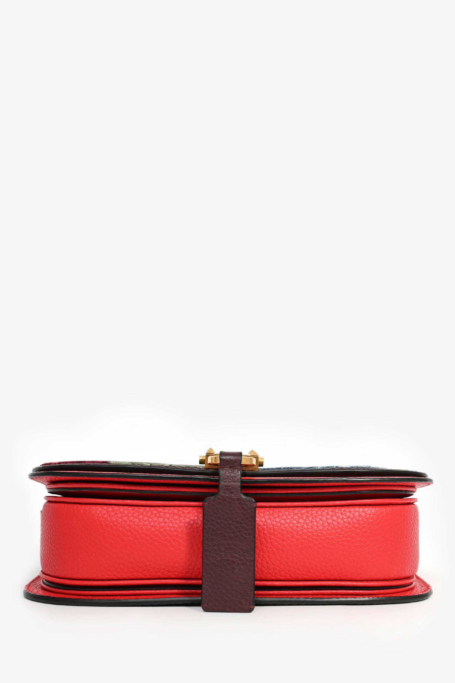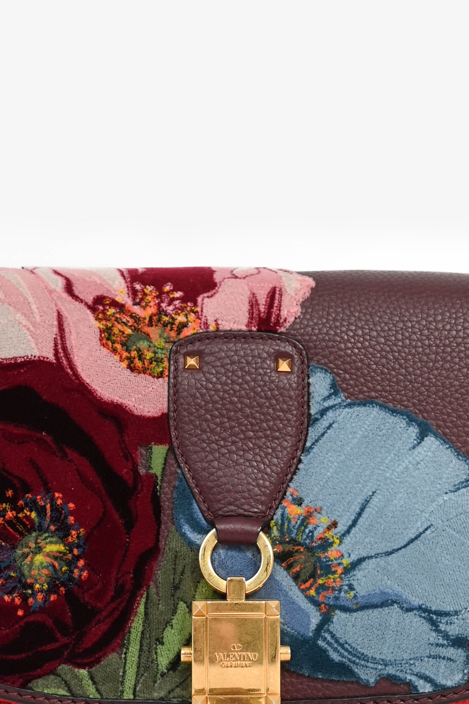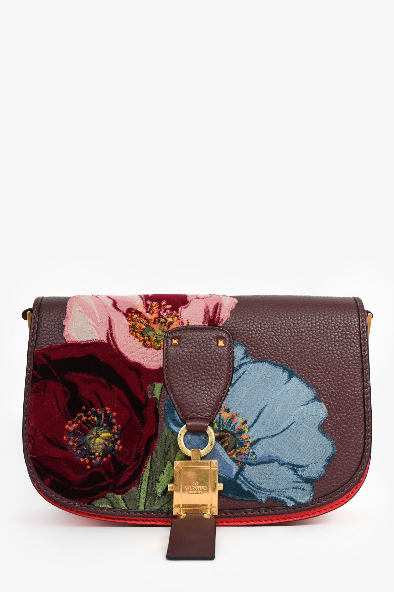 Refresh availabilityValentino Burgundy Floral Embroidered Lock Crossbody. Front fold-over flap with bottom magnetic closure. 3 compartments with a wall zip pocket in the middle slot. Suede lining. Leather logo detail underneath flap. Velvet details on exterior flap. Adjustable strap. Gold-tone hardware. Tonal stitching.