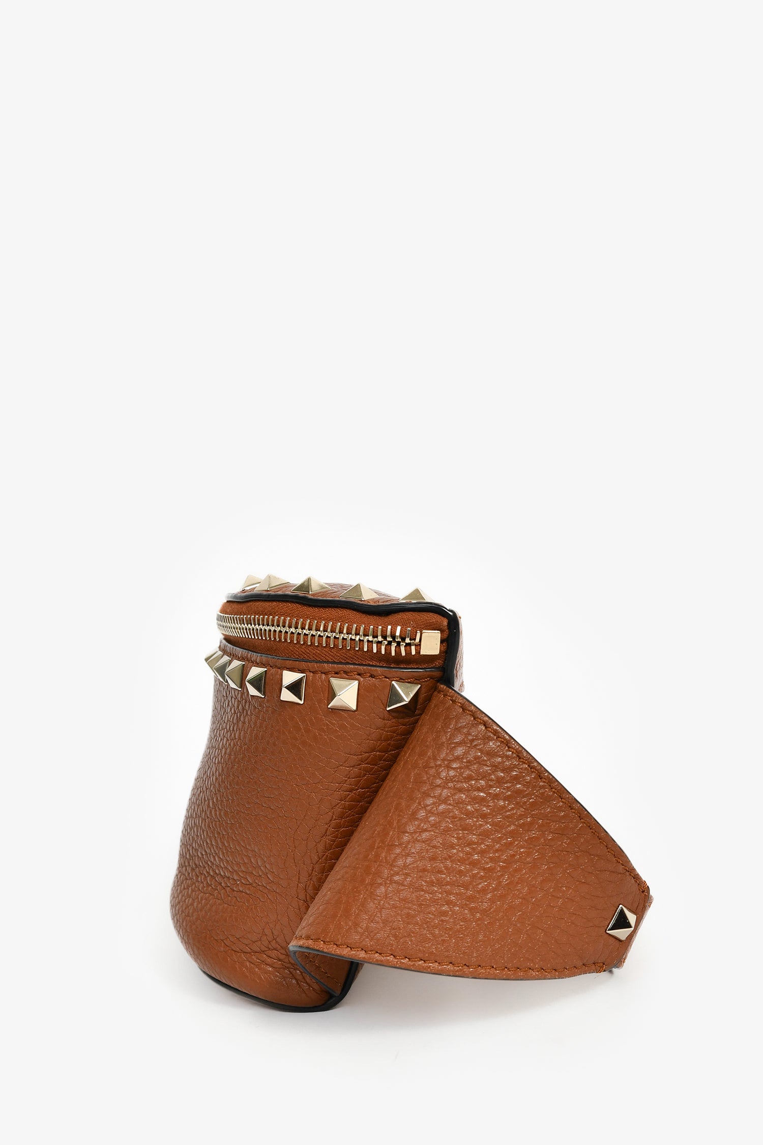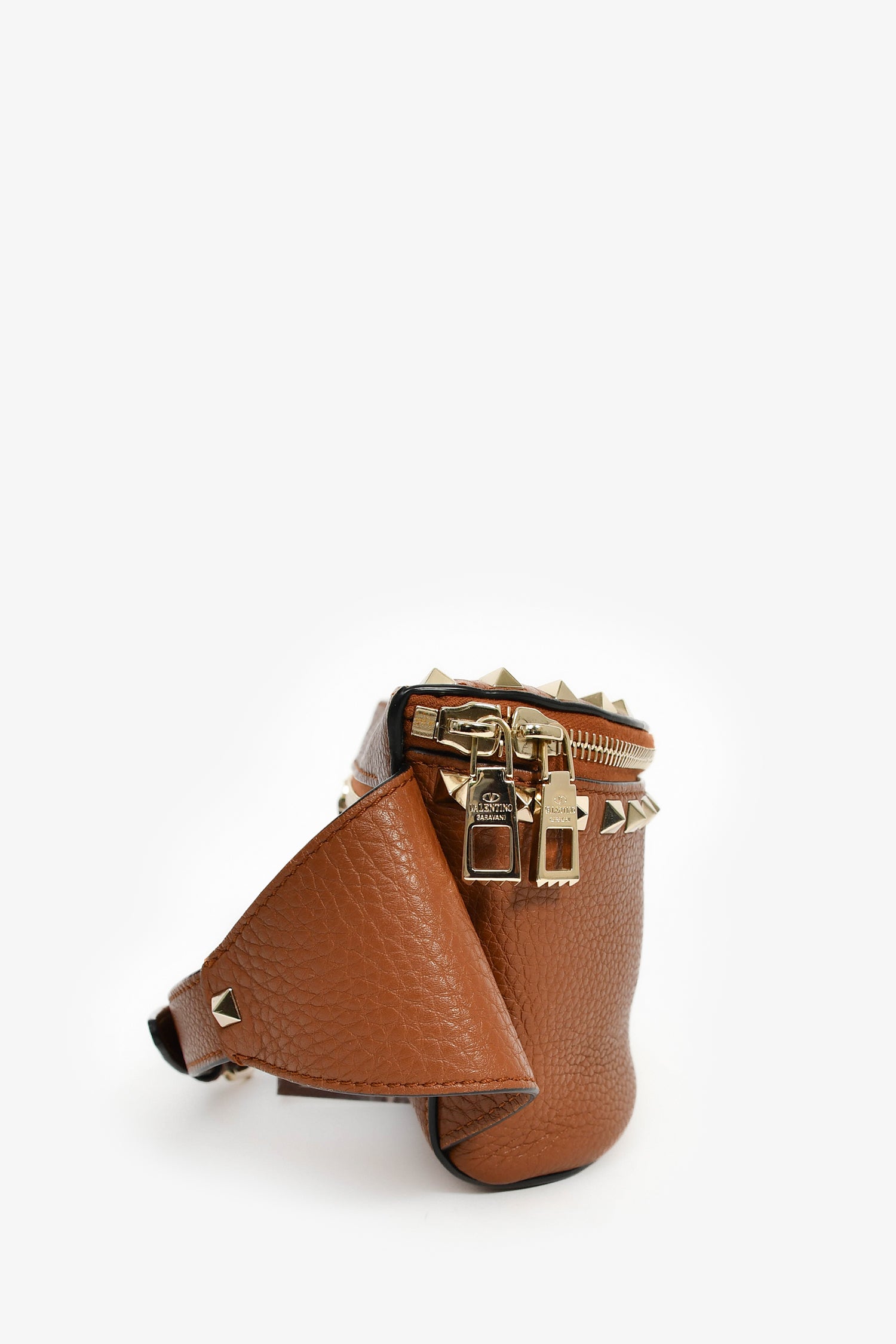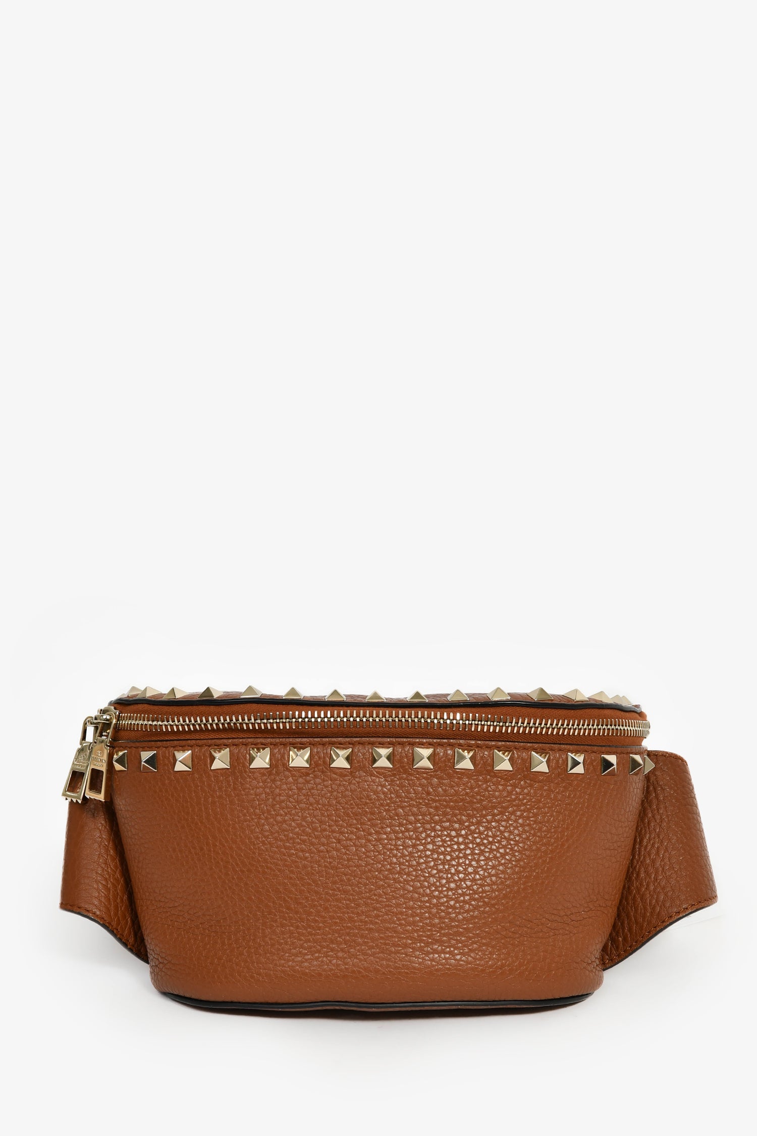 Refresh availabilityValentino Cognac Rockstud Leather Pebble Belt Bag. Top zip closure. Attachable belt strap. Zipped exterior pocket. Canvas-lined interior with a single pocket. Gold-tone hardware. Tonal stitching.