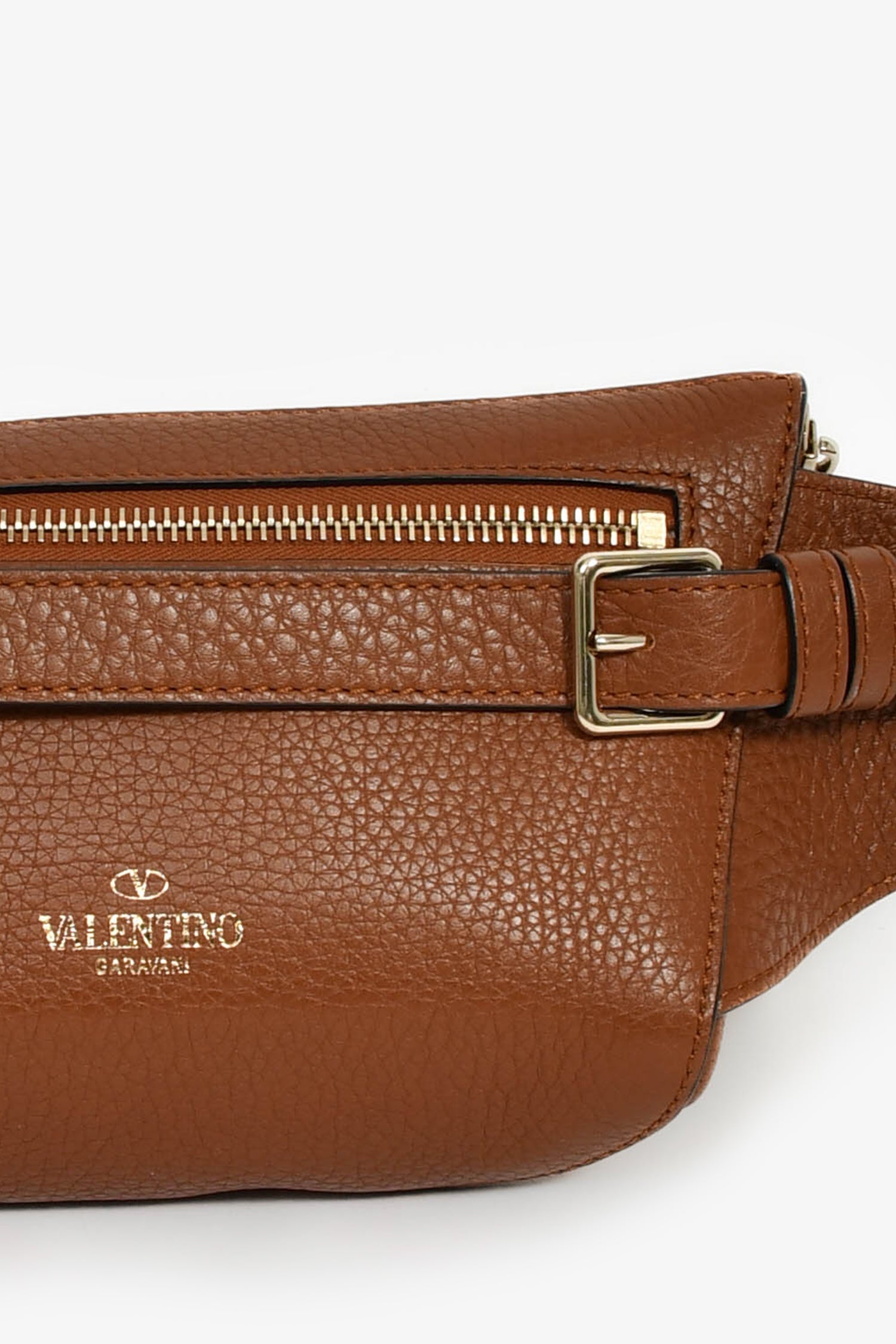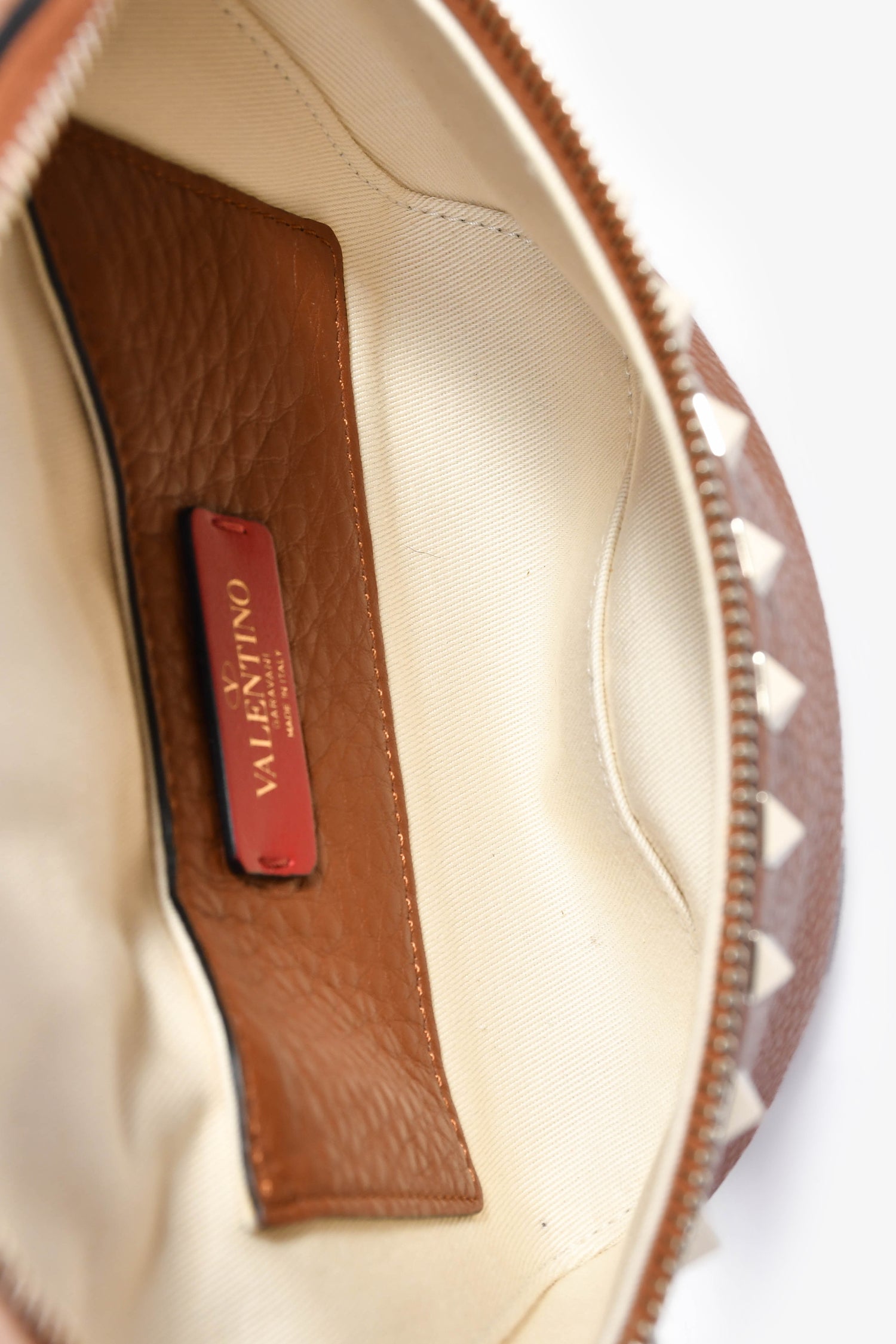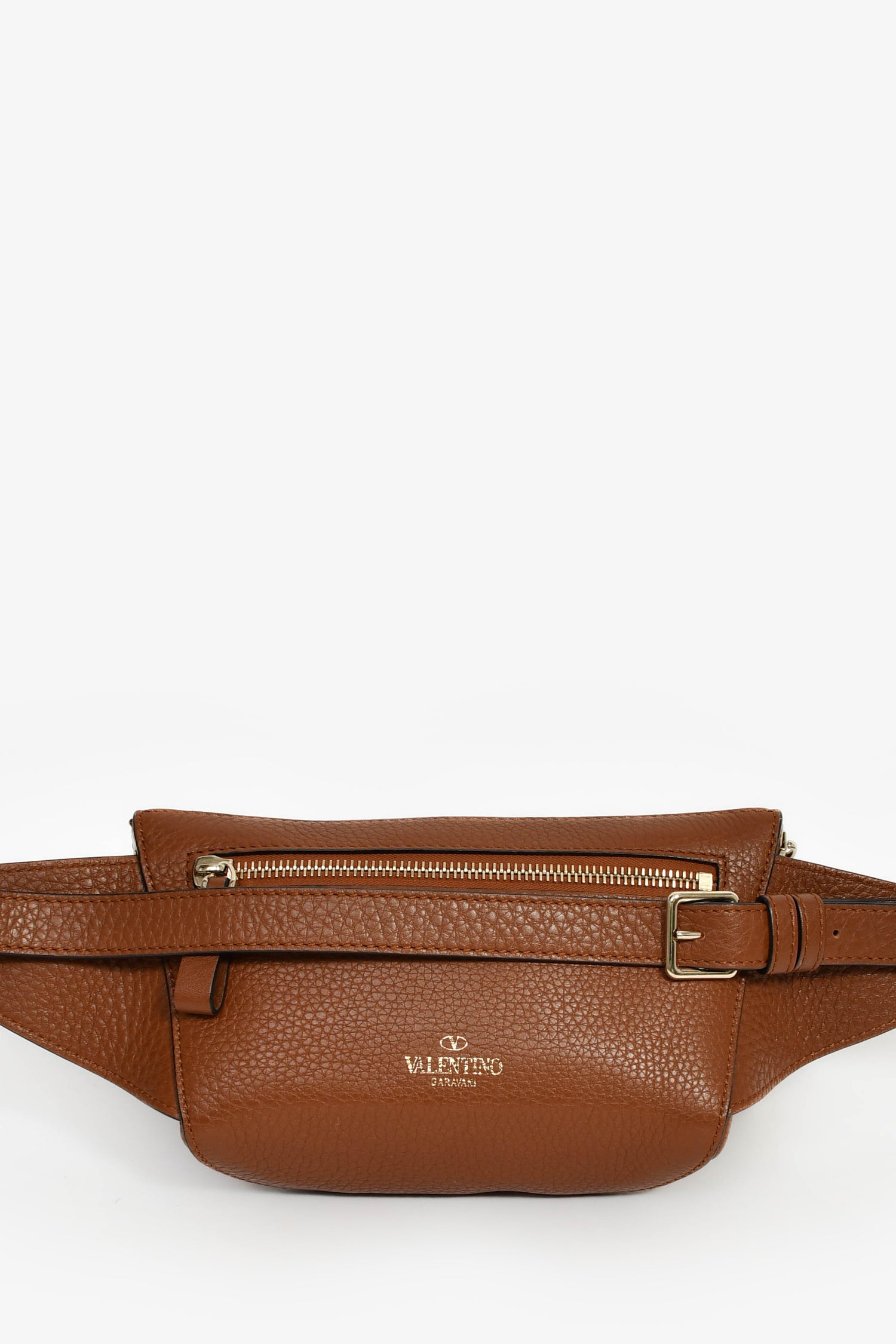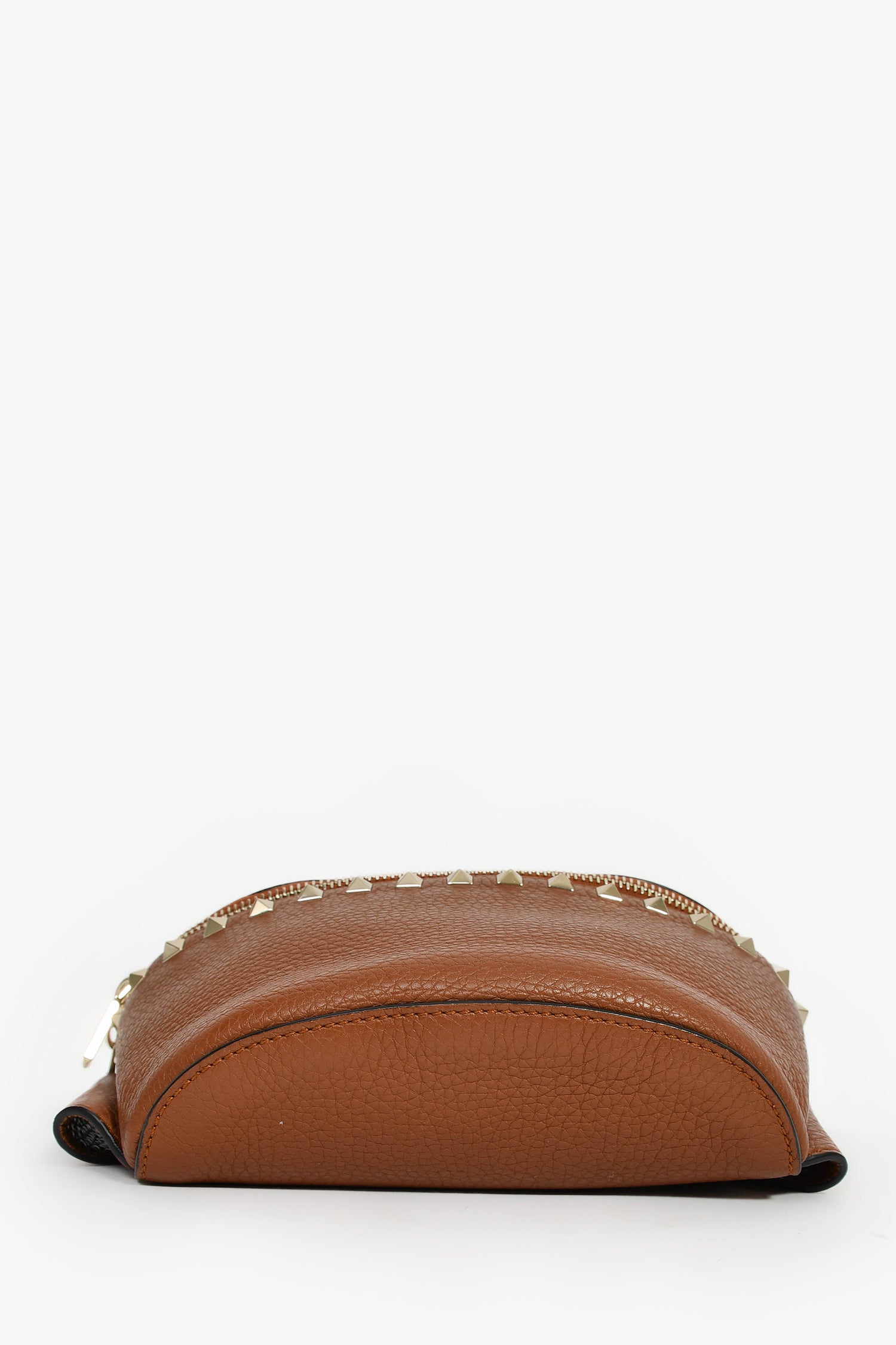 Refresh availabilityValentino Cognac Rockstud Leather Pebble Belt Bag. Top zip closure. Attachable belt strap. Zipped exterior pocket. Canvas-lined interior with a single pocket. Gold-tone hardware. Tonal stitching.
