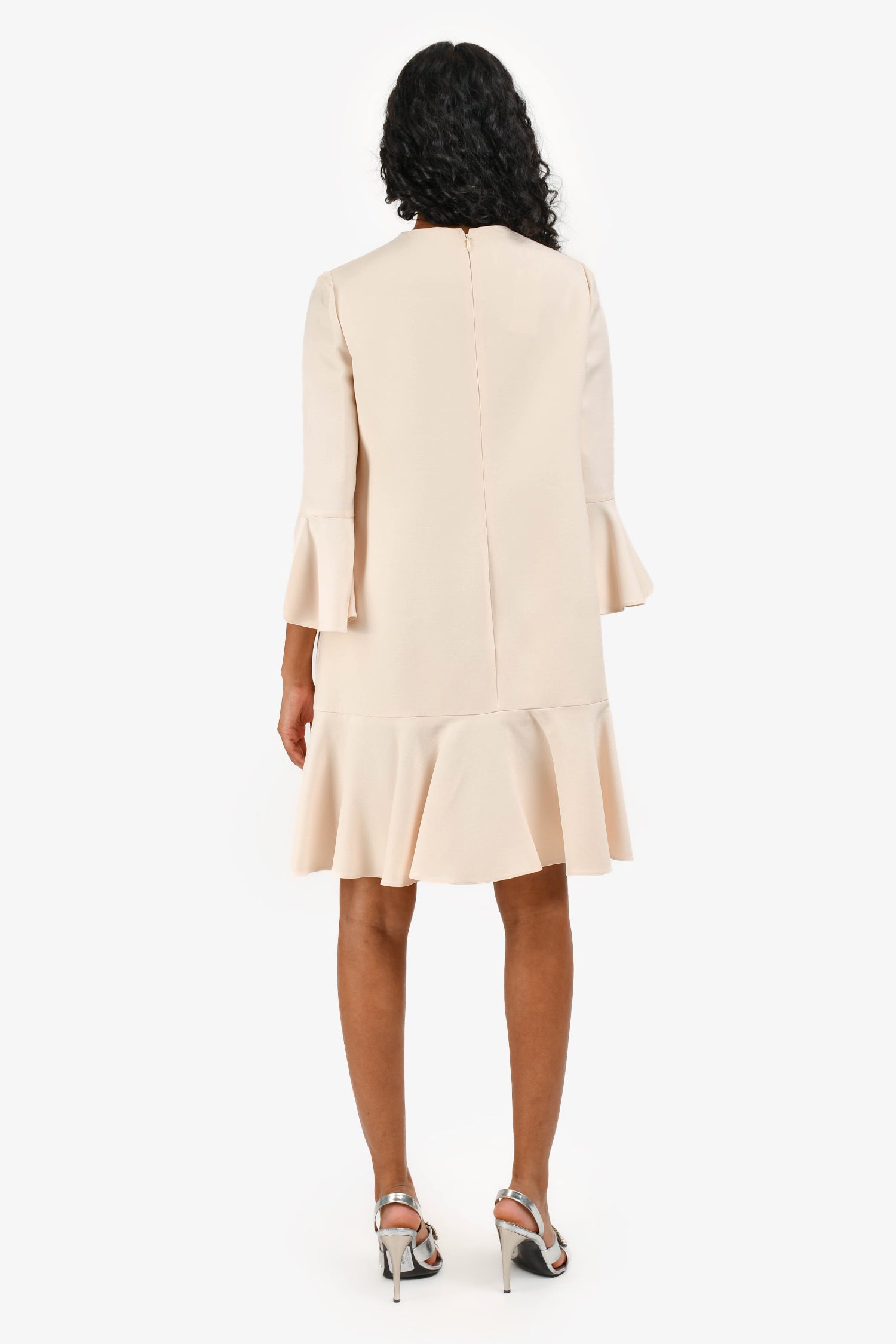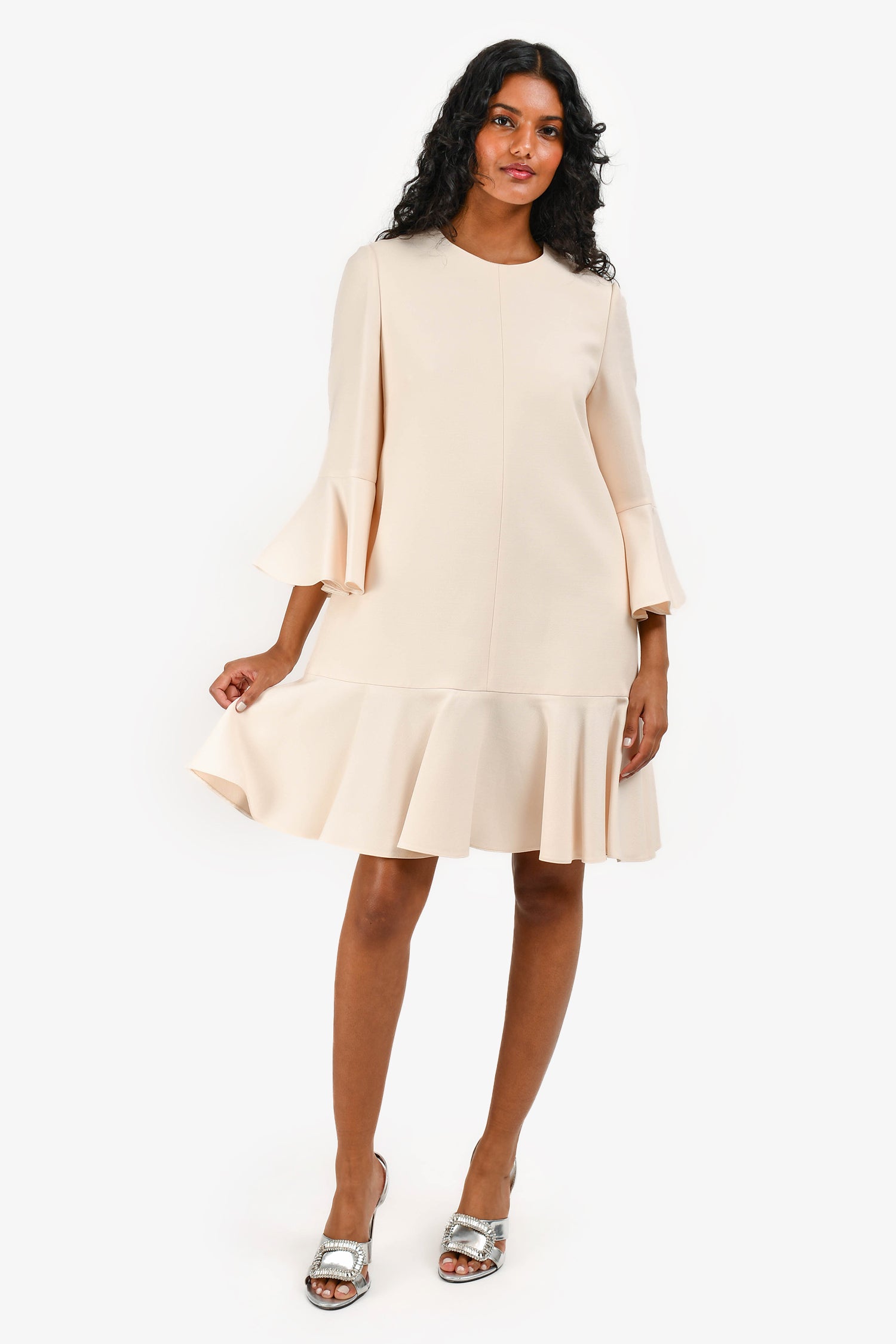 Refresh availabilityValentino Cream Wool/Silk Crepe Long Sleeve Ruffled Dress. Crew neckline. Concealed back zip closure. Fully lined. Tonal stitching.