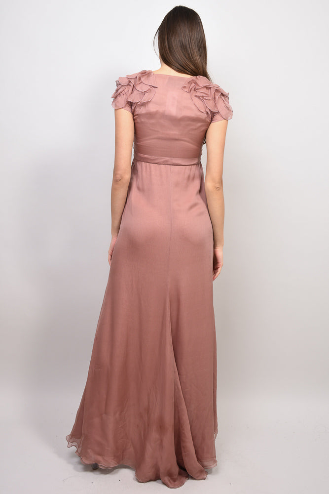 Refresh availabilityValentino Dusty Rose Silk Bow Gown. Maxi length. Cowl neckline. Ruffled cap sleeves. Lined. Side zip closure. Tonal stitching and hardware.
