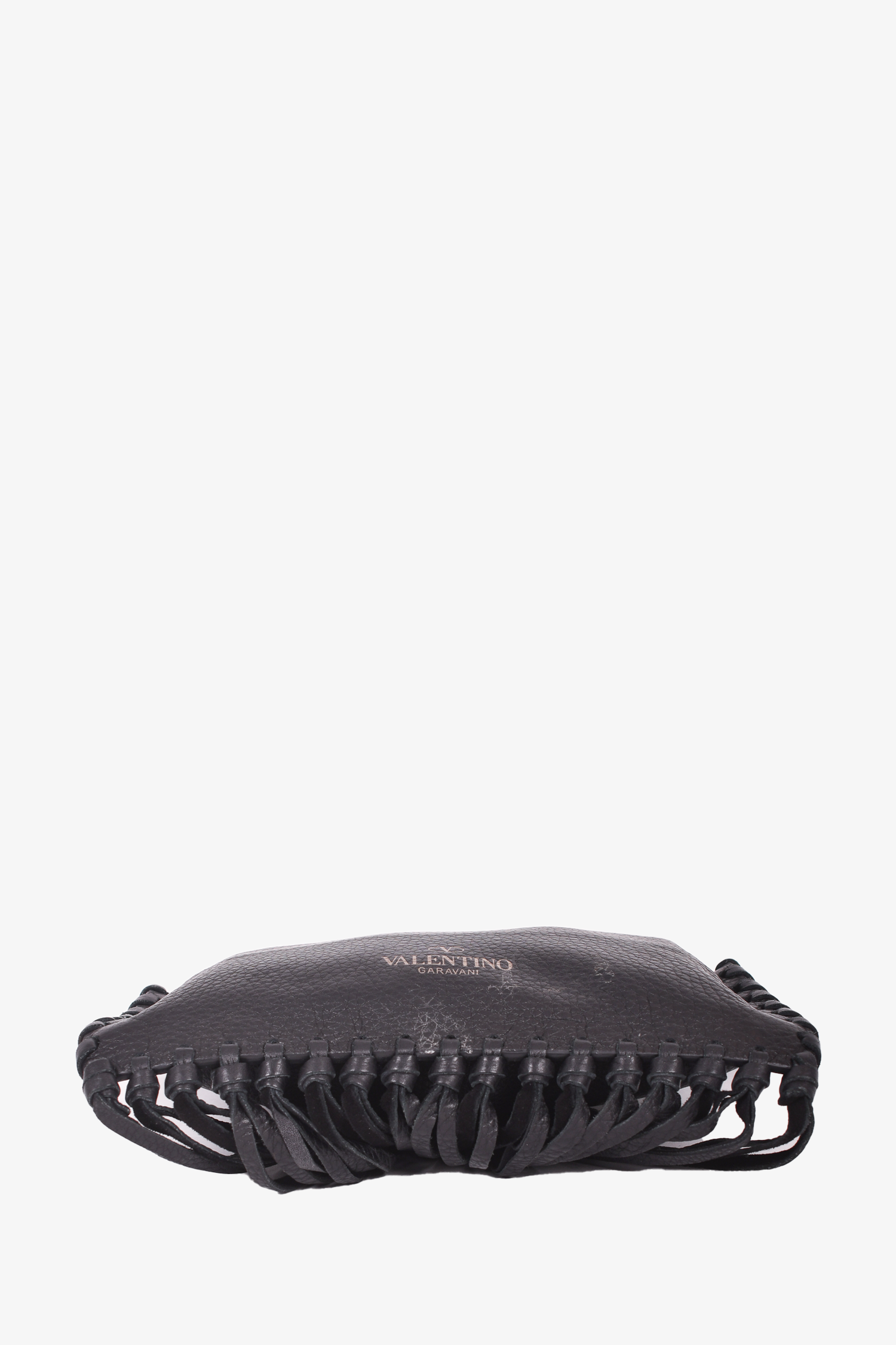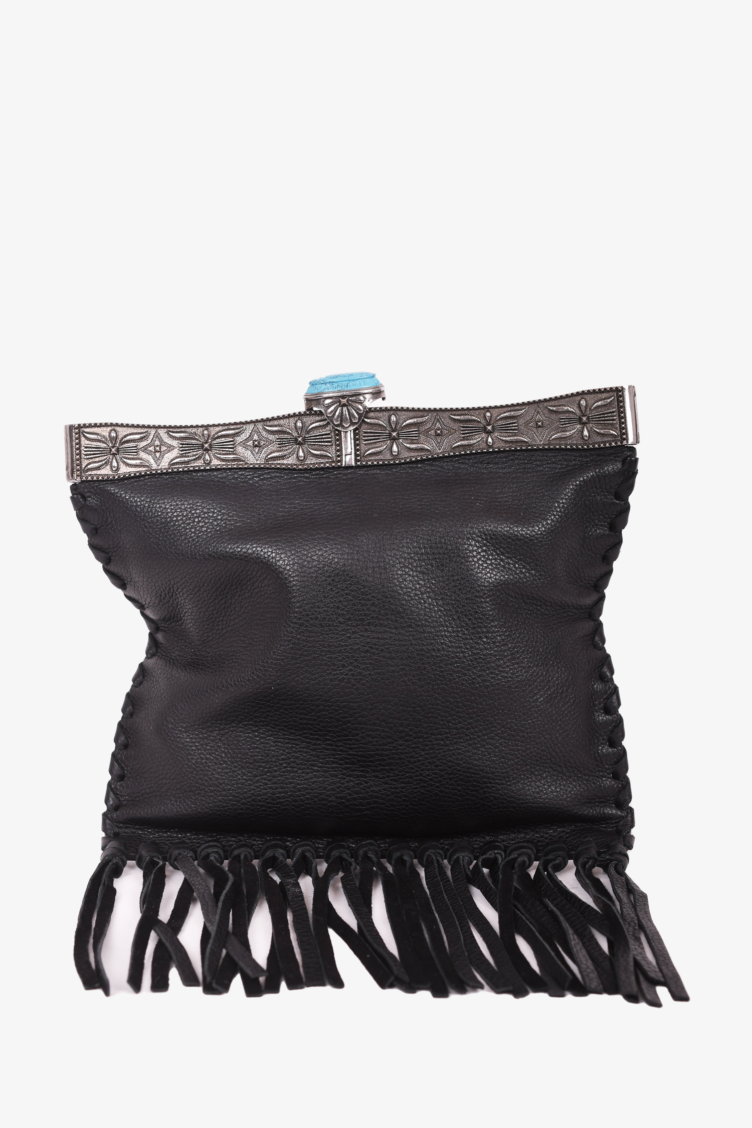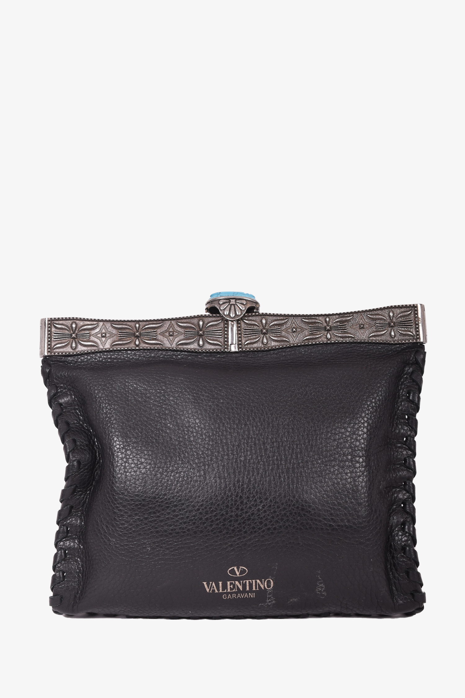 Refresh availabilityValentino Garavani Black Leather Fringe Bag with Turquoise Clasp and Silver Chain Strap. Top latch closure. Tonal textile interior lining. Single interior wall slip pocket. Silver and grey-tone hardware. Tonal stitching.