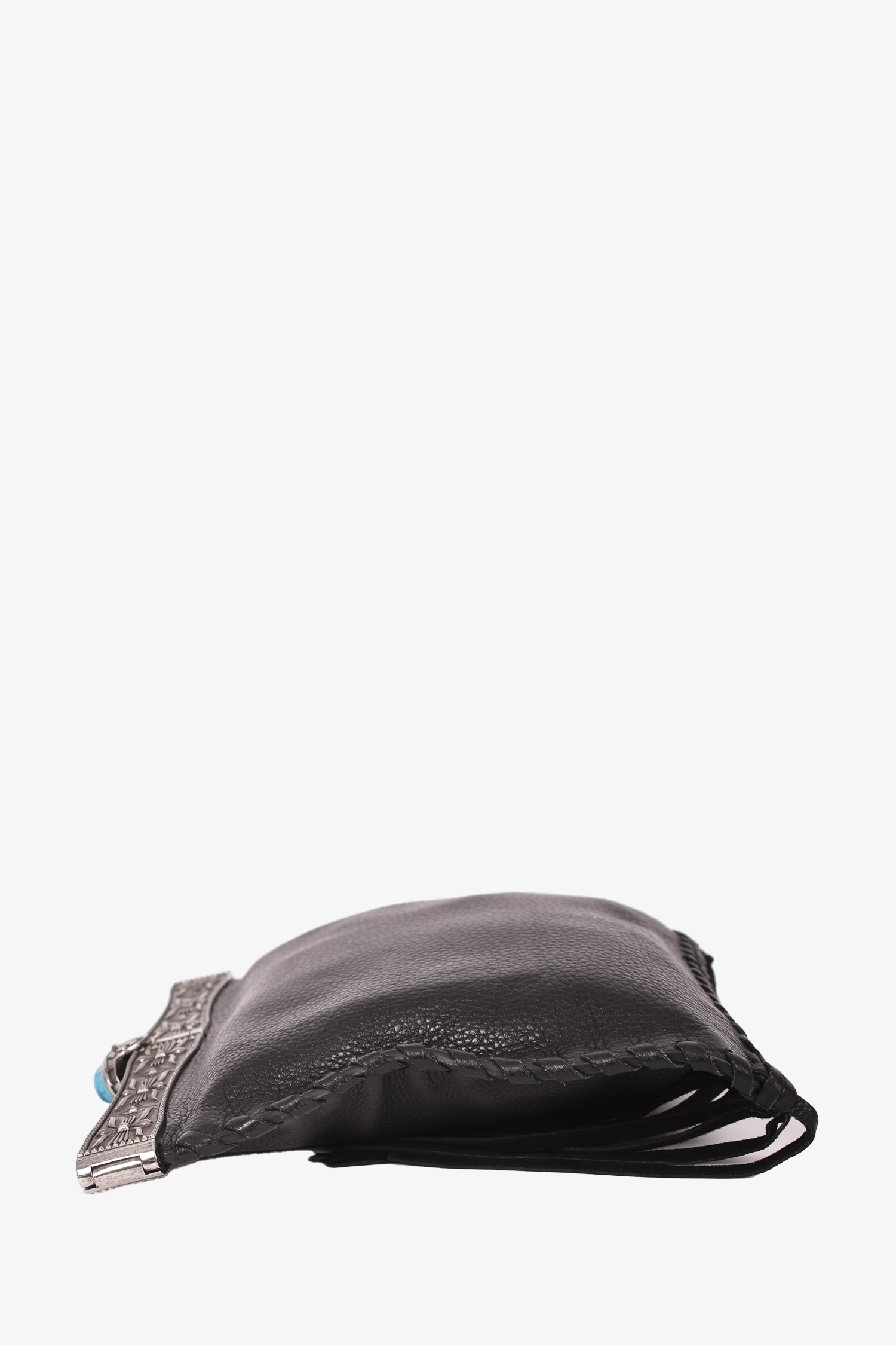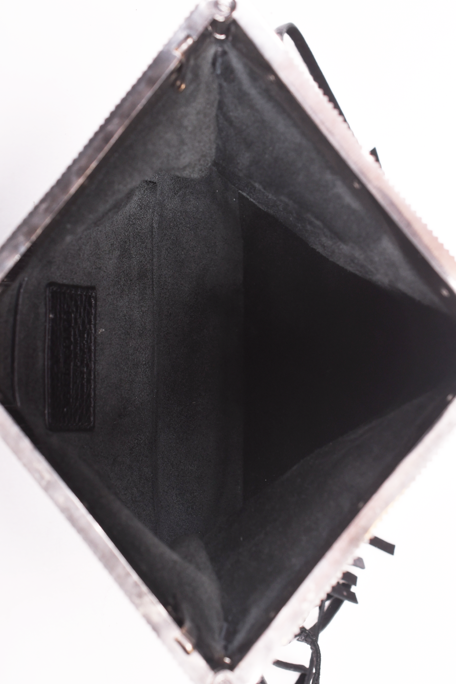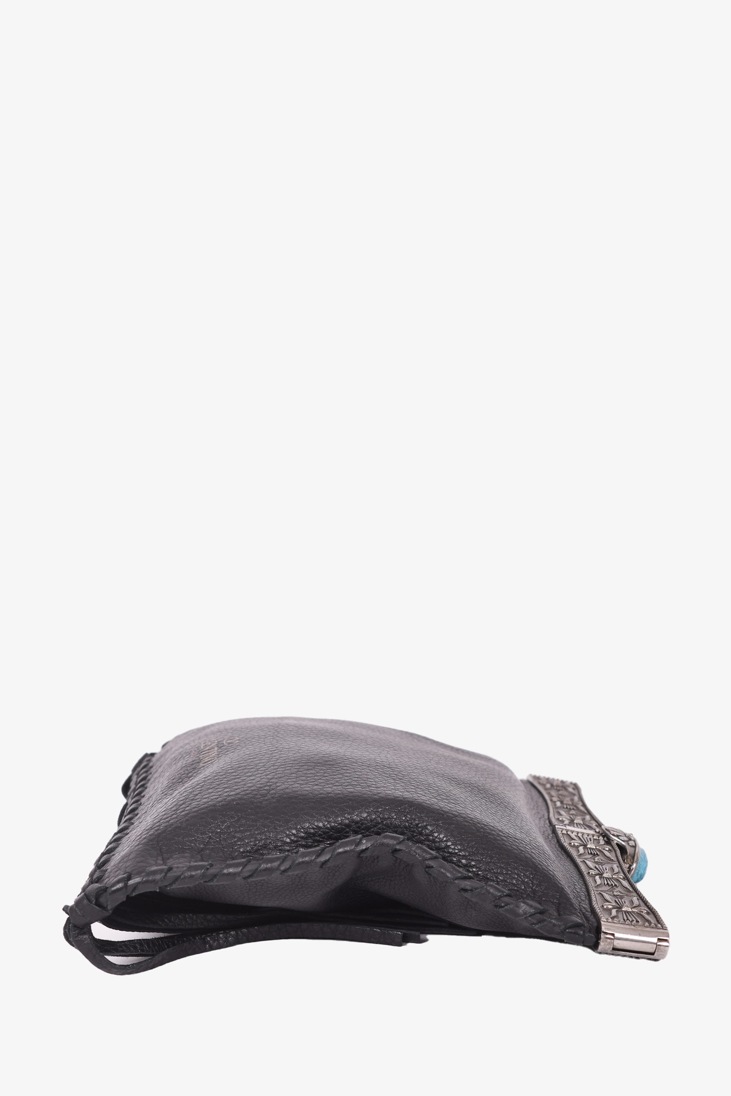 Refresh availabilityValentino Garavani Black Leather Fringe Bag with Turquoise Clasp and Silver Chain Strap. Top latch closure. Tonal textile interior lining. Single interior wall slip pocket. Silver and grey-tone hardware. Tonal stitching.