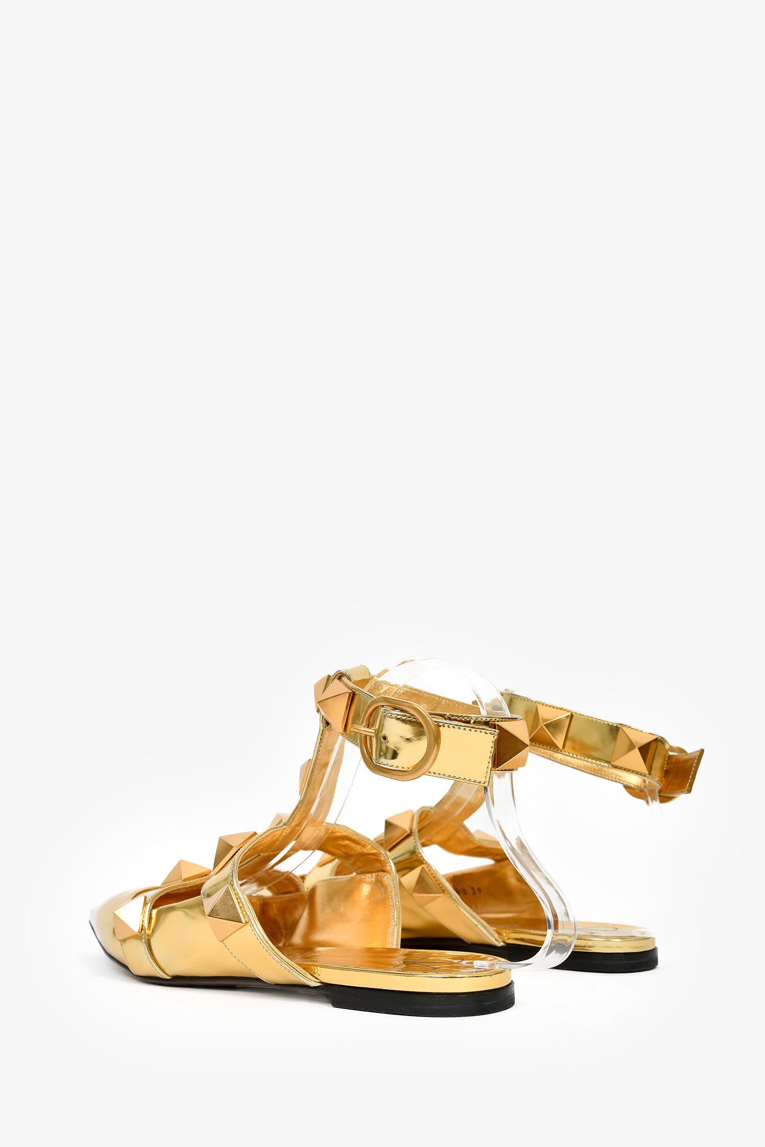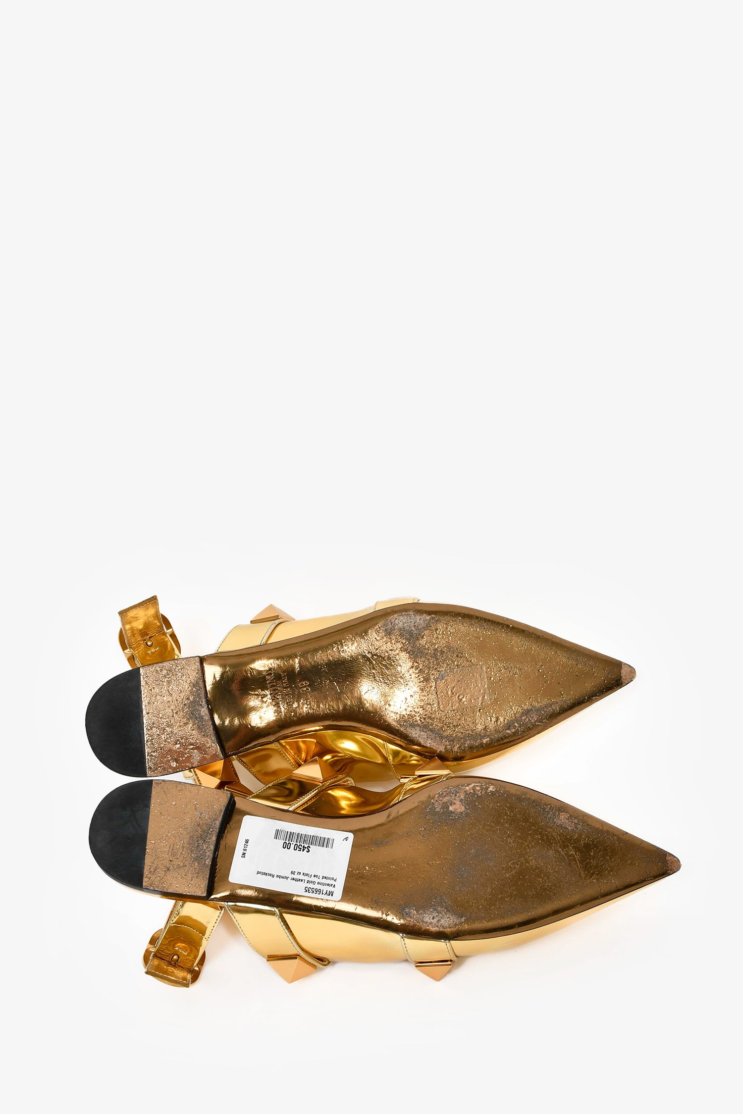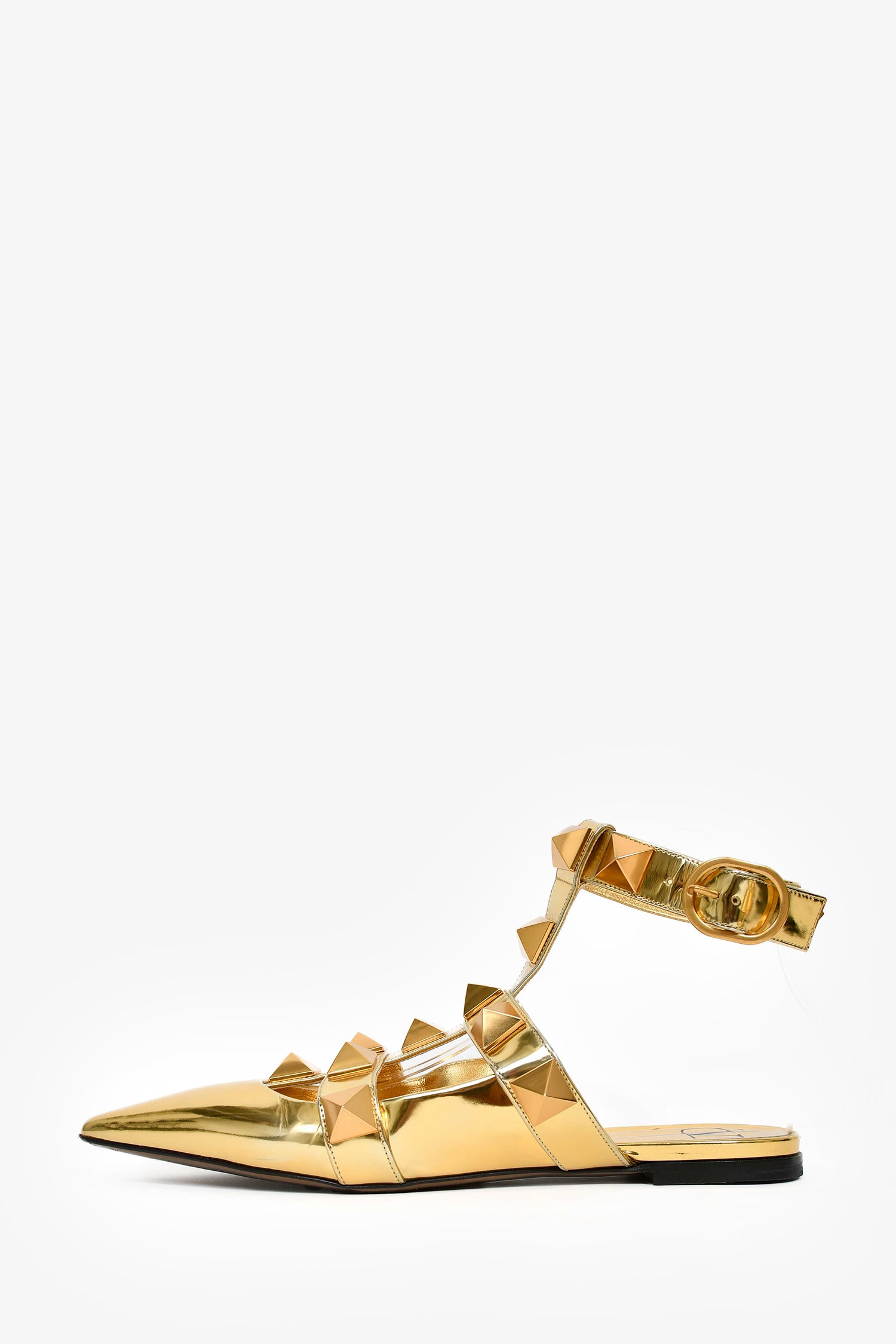 Refresh availabilityValentino Gold Leather Jumbo Rockstud Pointed Toe Flats. Slip-on. Ankle strap with buckle closure. Gold-tone hardware.