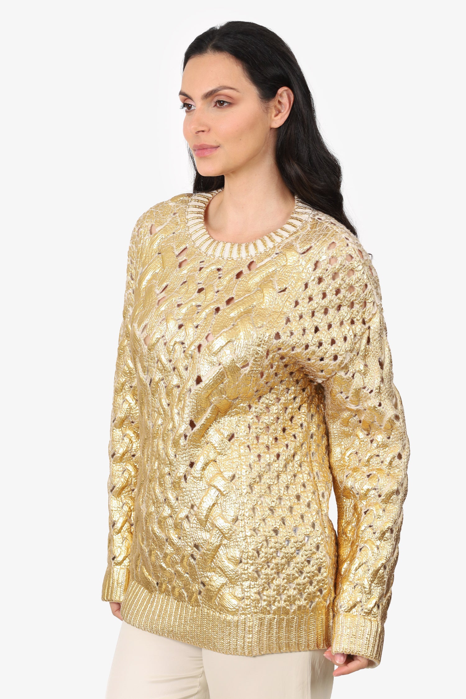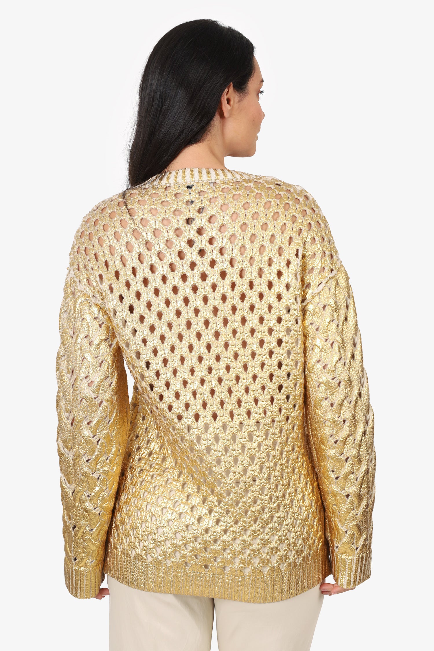 Refresh availabilityValentino Gold/Cream Wool Cable Knit Painted Sweater. Pull-on. Round neckline. Perforated body. Tonal stitching.