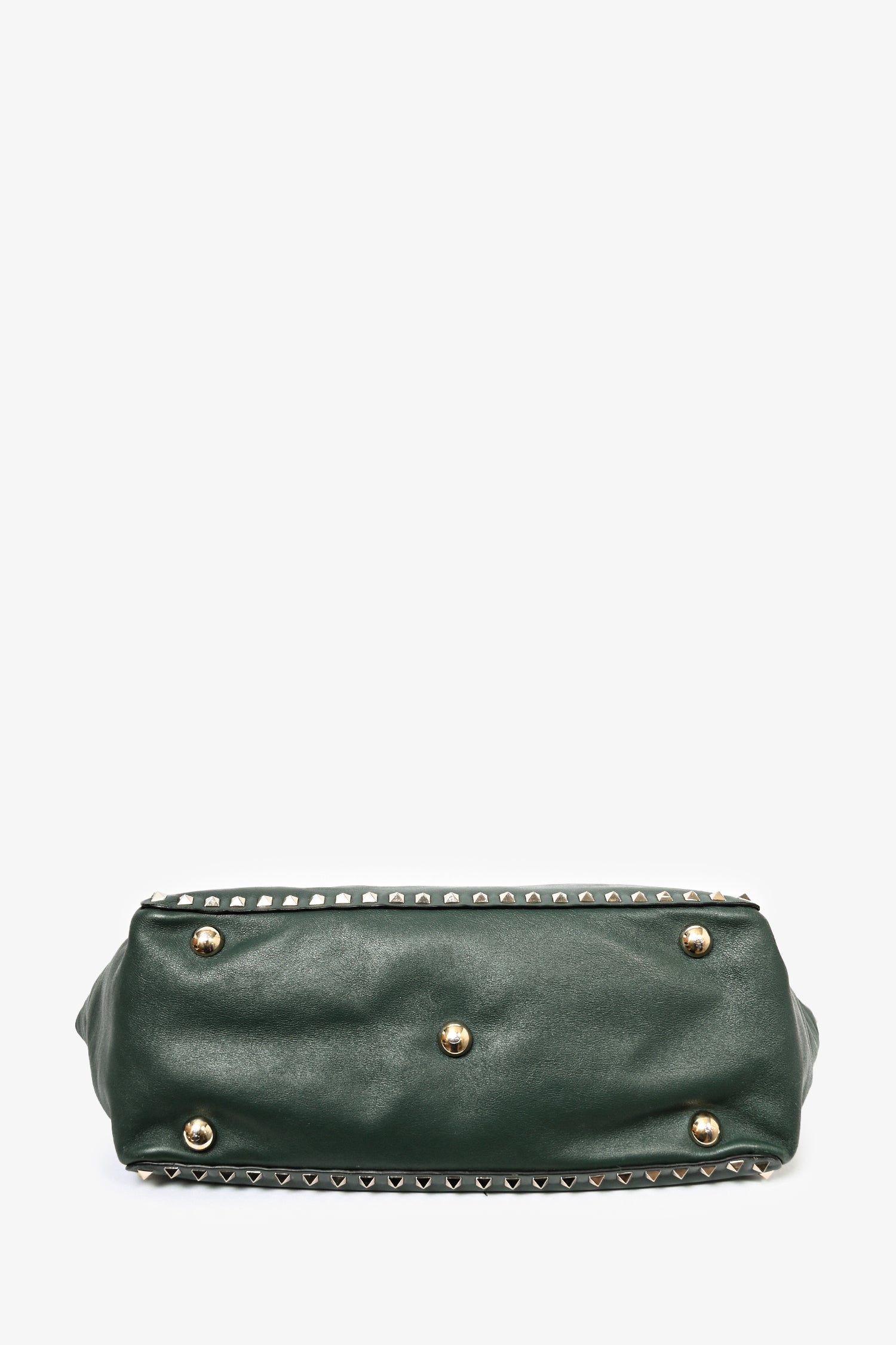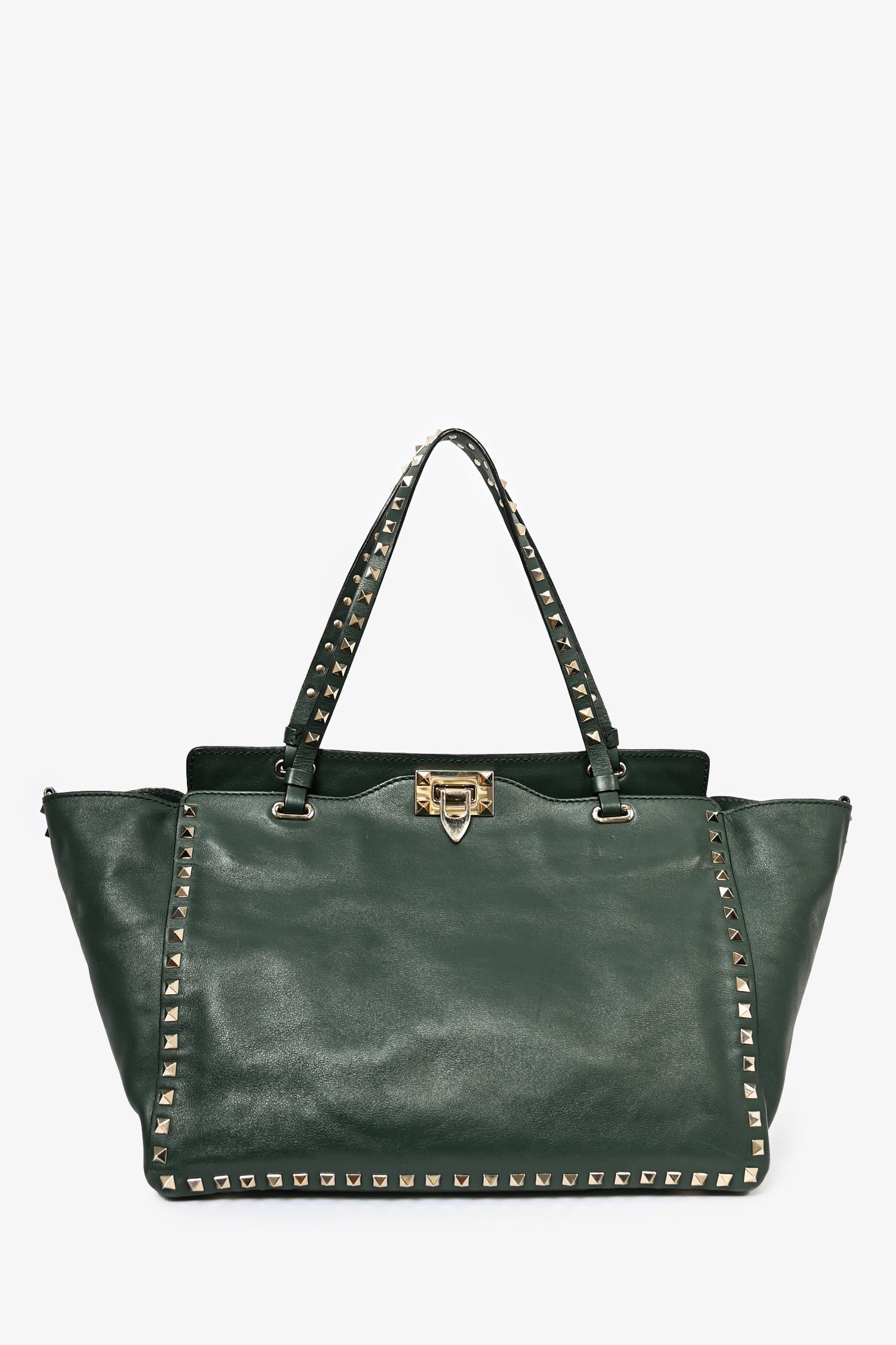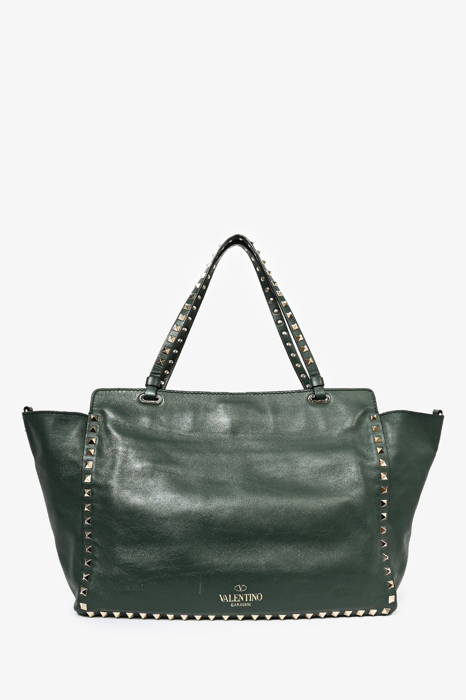 Refresh availabilityValentino Green Leather Rockstud Tote. Leather trimming. Dual flat handles. Rockstud detailing. Flip closure. Single interior zipped compartment and dual pockets. Bag feet at base. Lined interior. Removable shoulder strap.