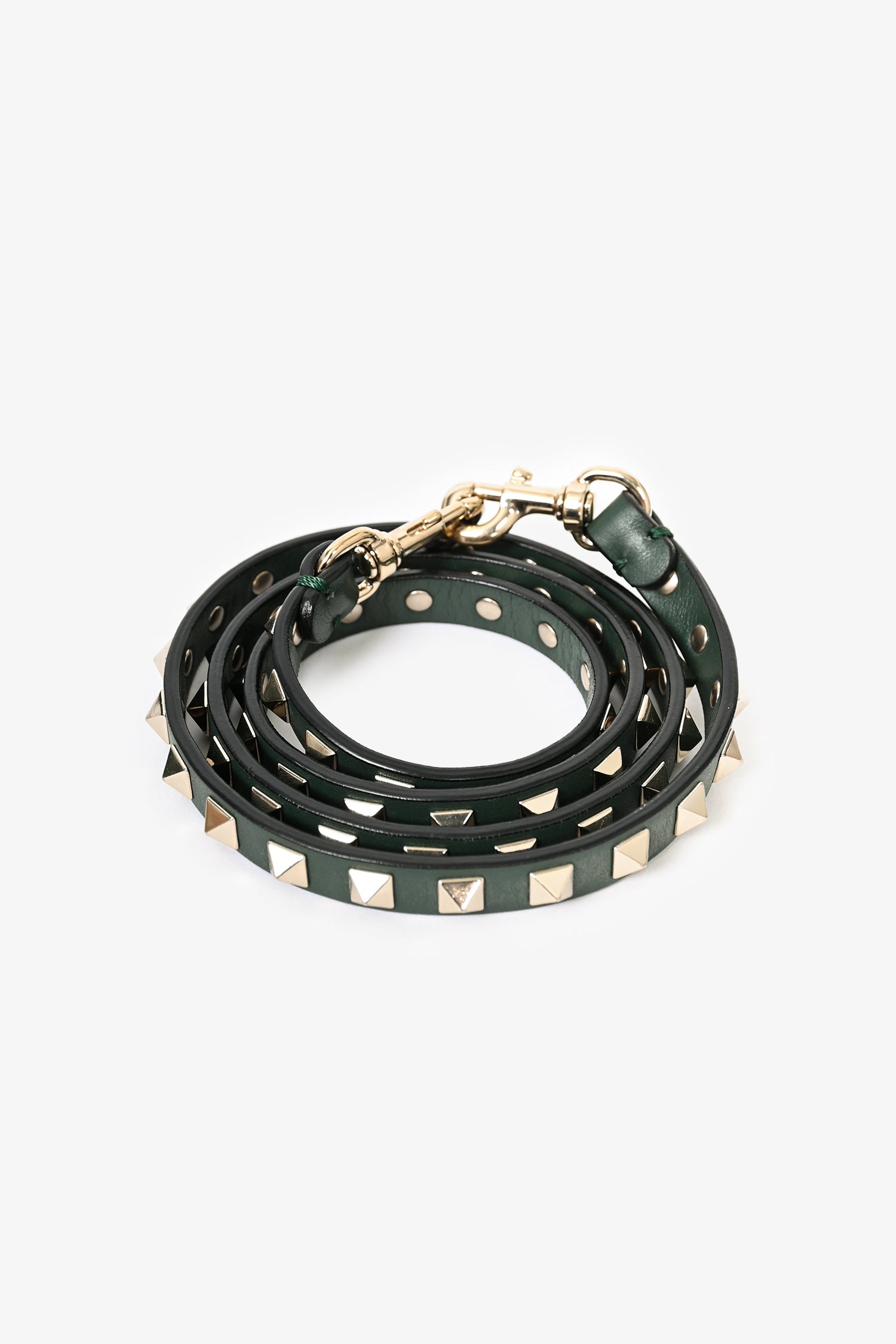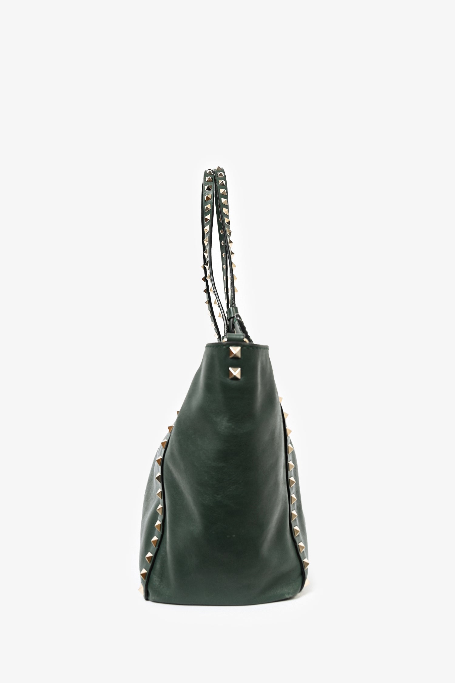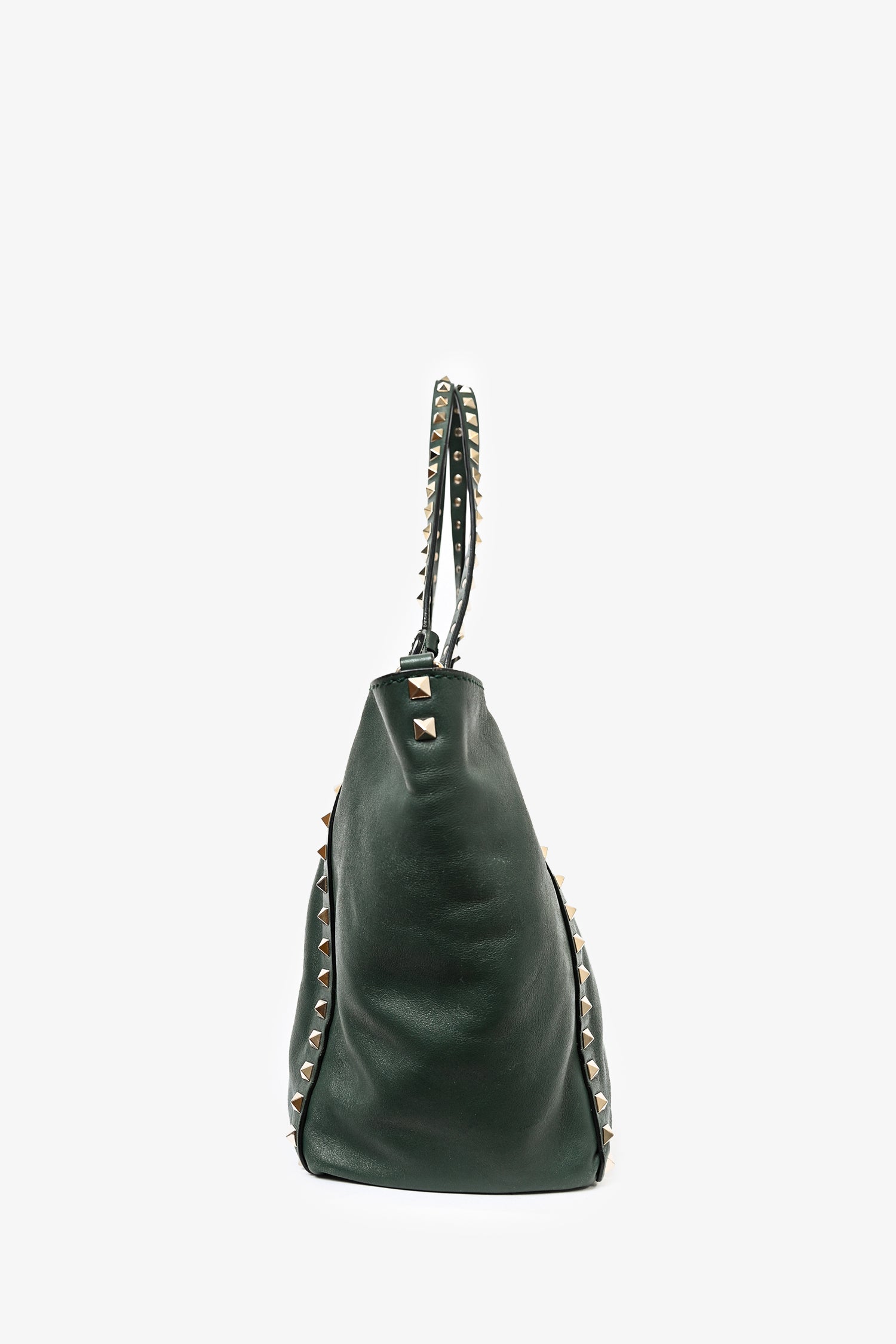 Refresh availabilityValentino Green Leather Rockstud Tote. Leather trimming. Dual flat handles. Rockstud detailing. Flip closure. Single interior zipped compartment and dual pockets. Bag feet at base. Lined interior. Removable shoulder strap.