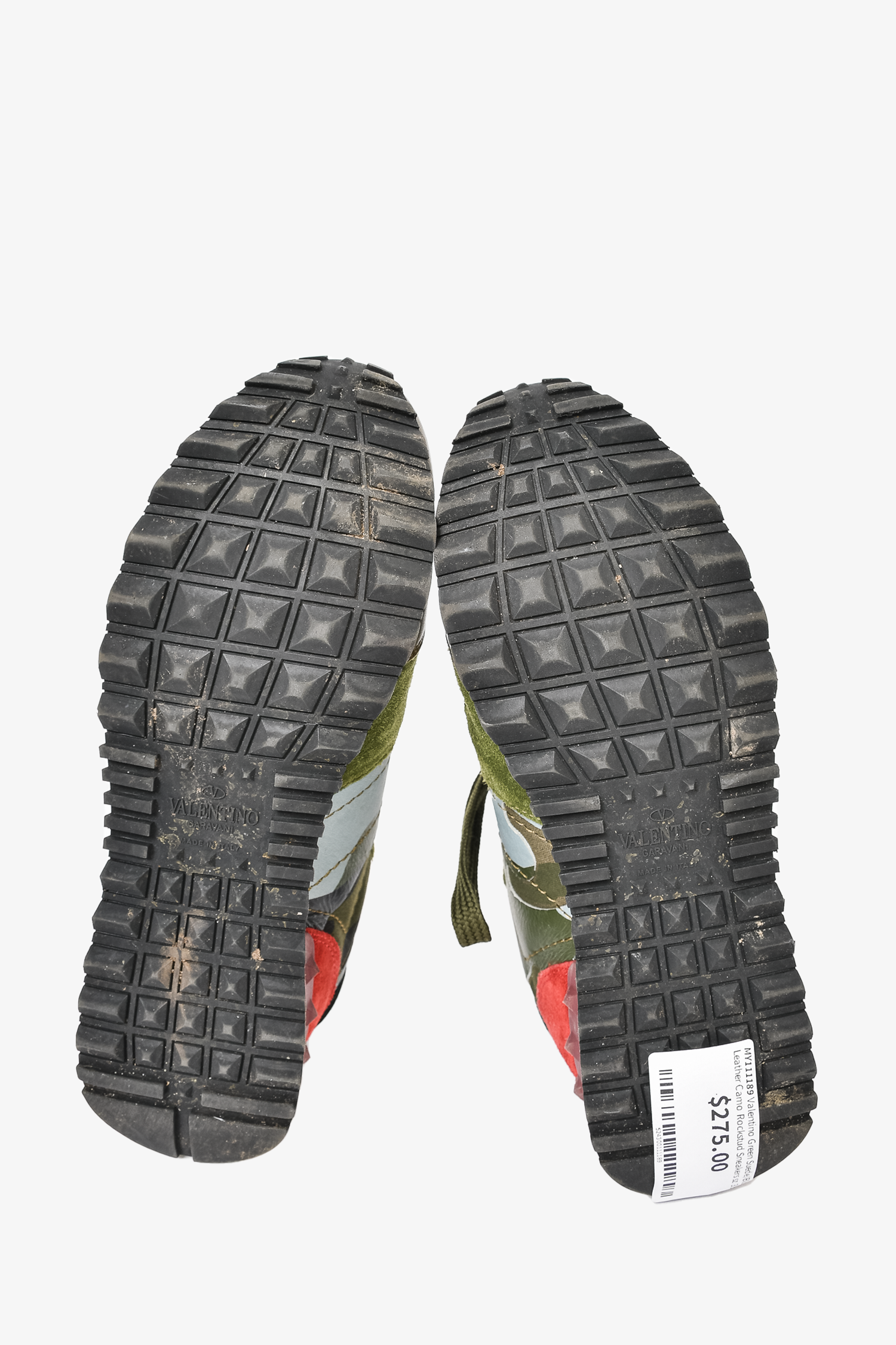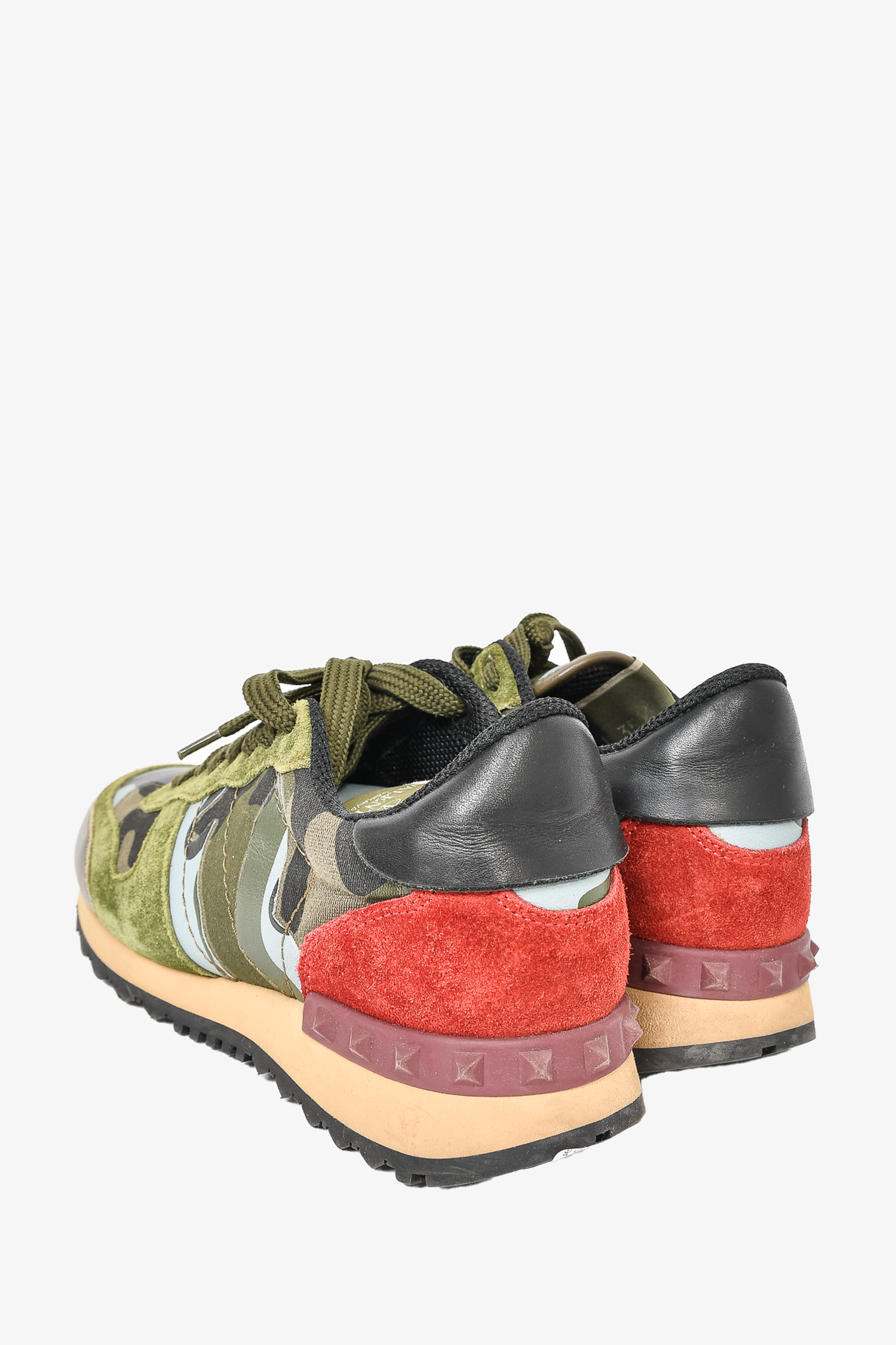 Refresh availabilityValentino Green Suede/Blue Leather Camo Rockstud Sneakers. Front lace up closure. Round toe. Tonal stitching.