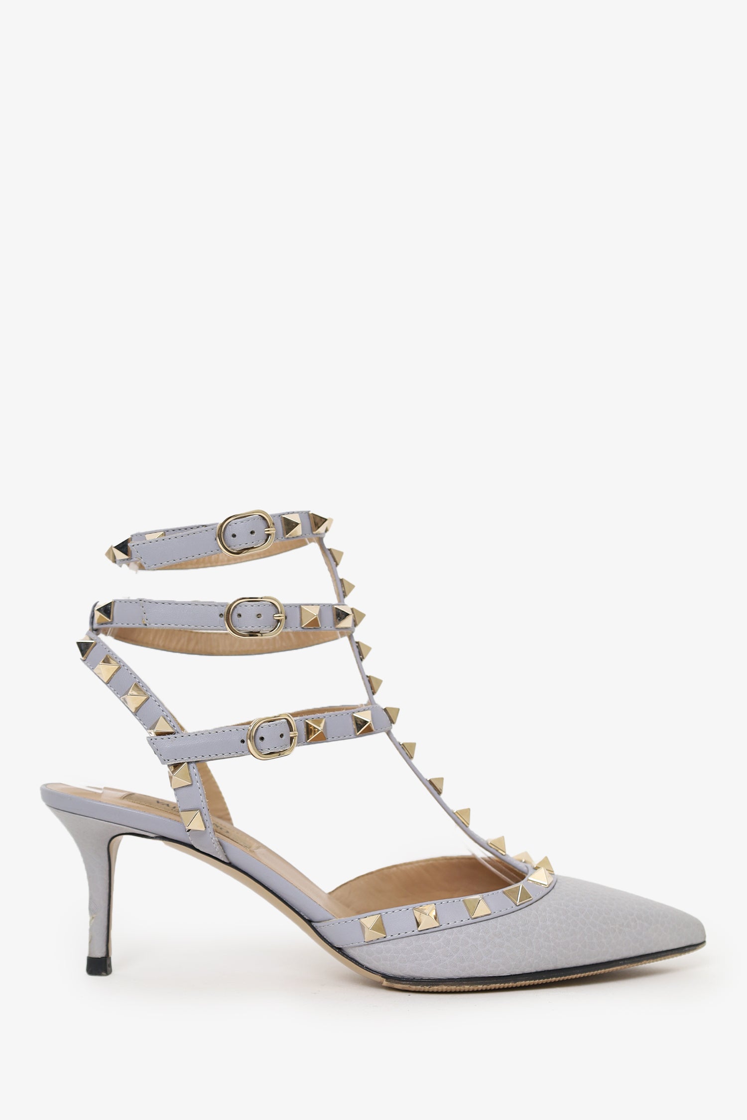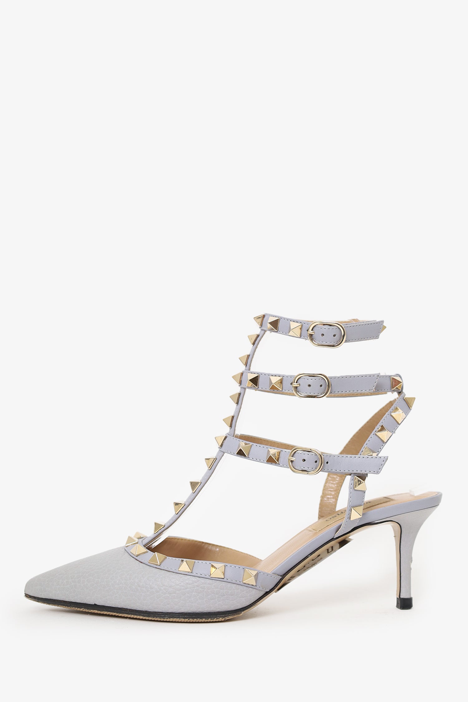 Refresh availabilityValentino Grey Leather Rockstud Cage Kitten Heels. Slip-on. Pointed toe. Adjustable strap with pull-through buckle closure. Gold-tone hardware. Tonal stitching.