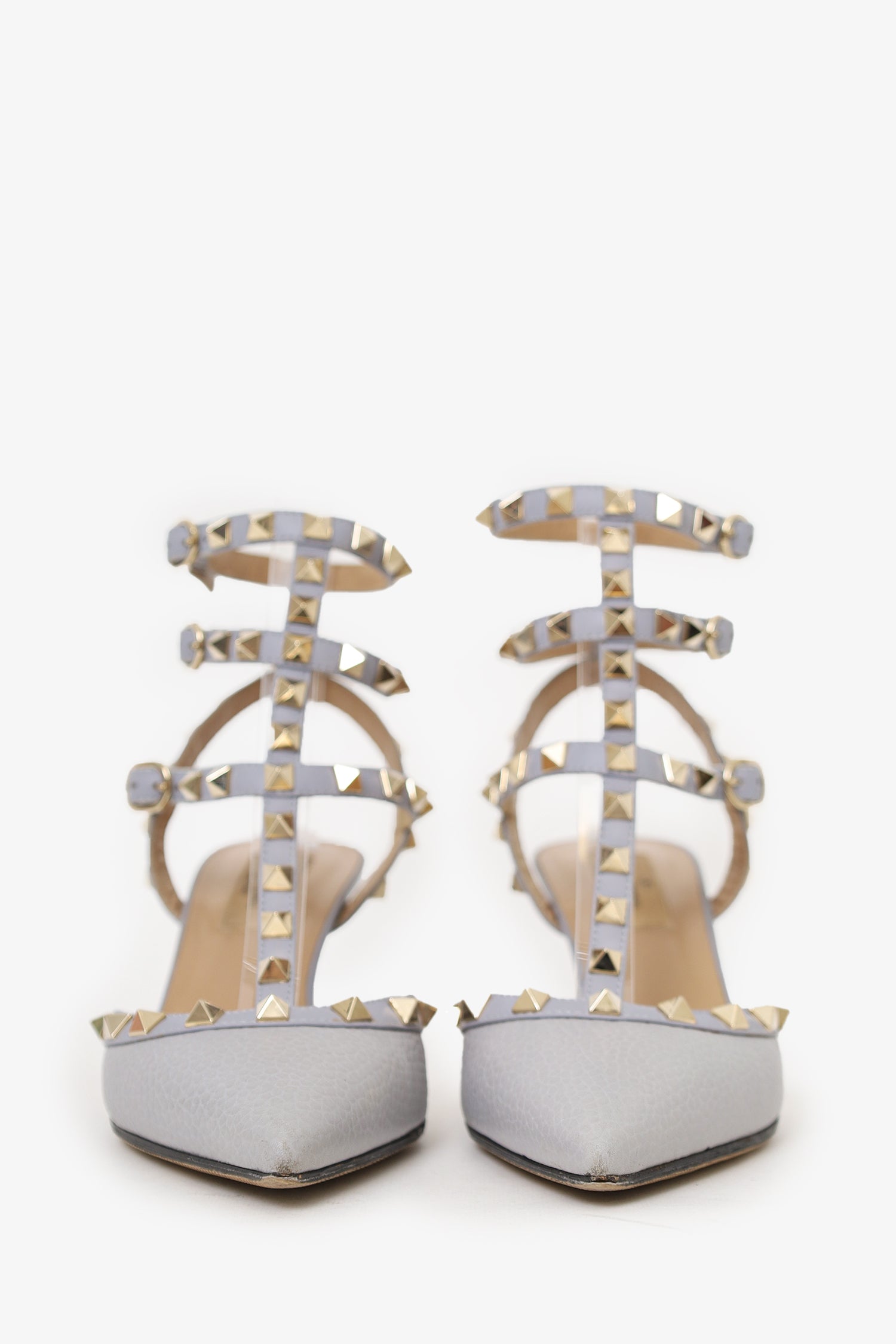 Valentino Grey Leather Rockstud Cage Kitten Heels Size 36.5