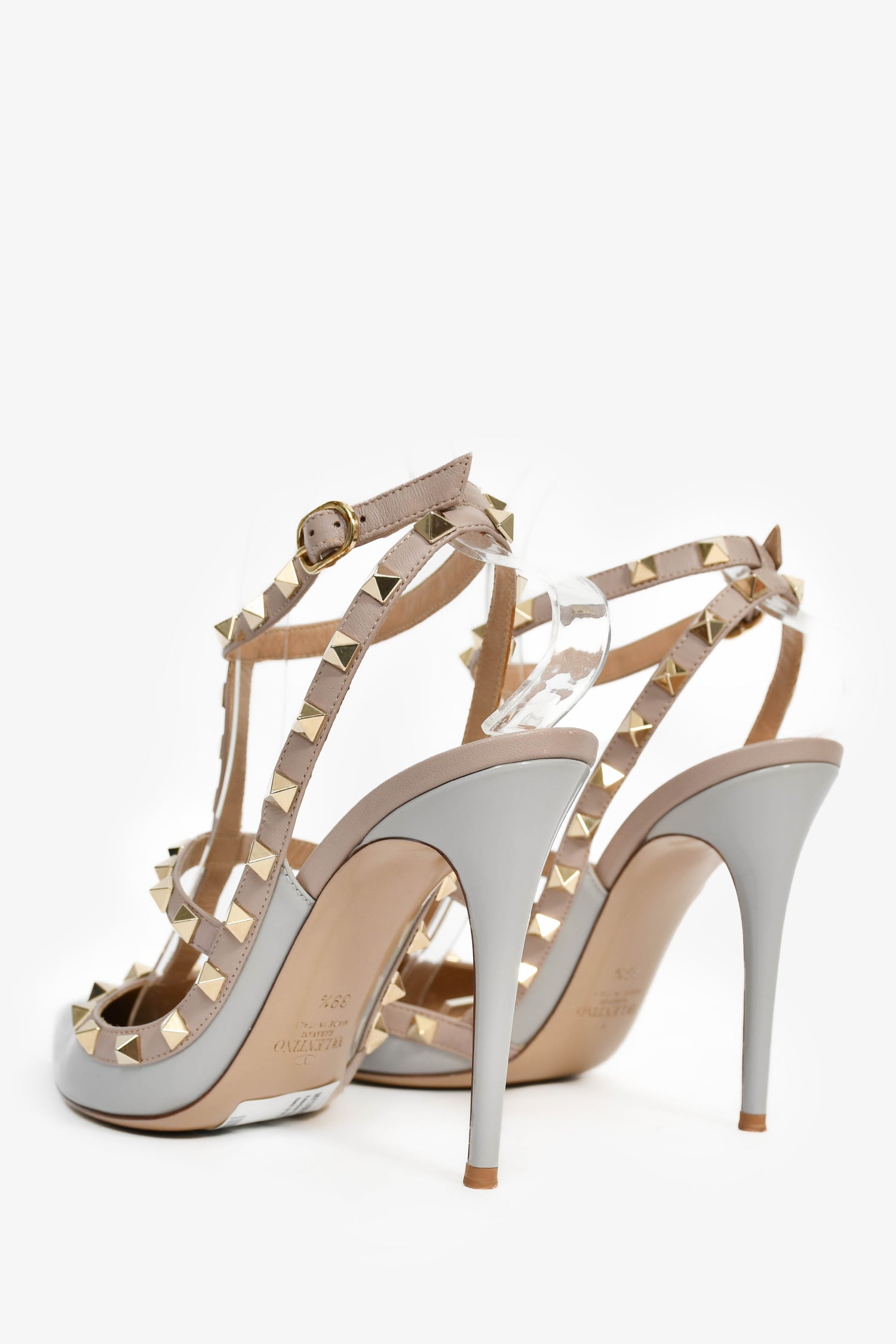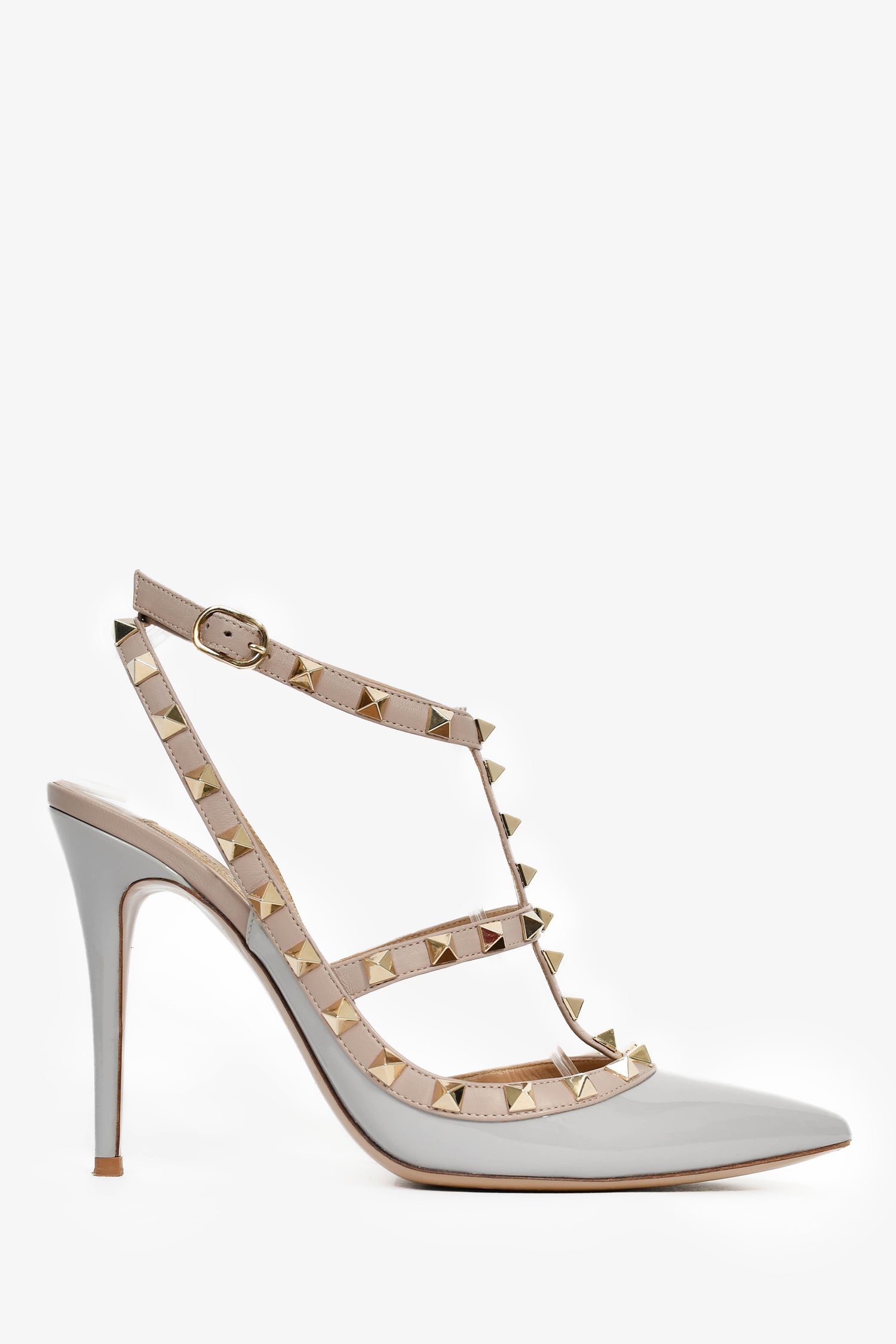 Refresh availabilityValentino Grey Patent Rockstud Cage Heels. Slip-on. Pointed toe. Ankle strap with buckle closure. Gold-tone hardware. Tonal stitching.