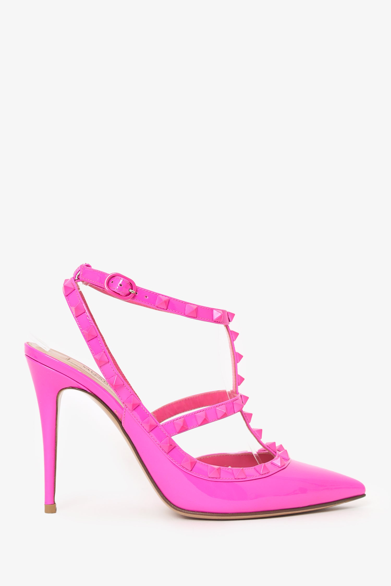 Refresh availabilityValentino Hot Pink Patent Leather Rockstud Cage Heels. Slip-on. Pointed toe. Ankle strap with adjustable buckle closure. Tonal stitching.