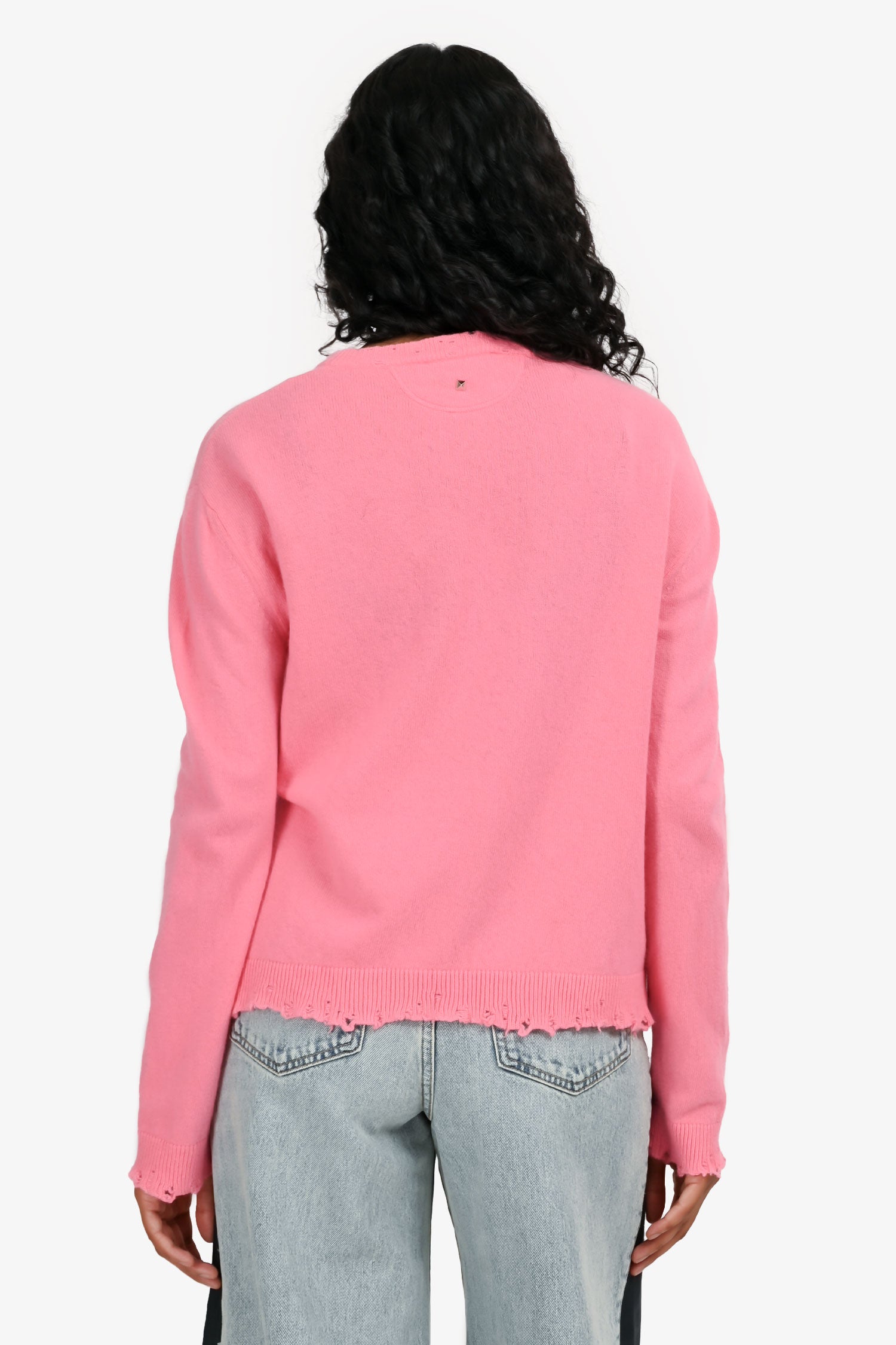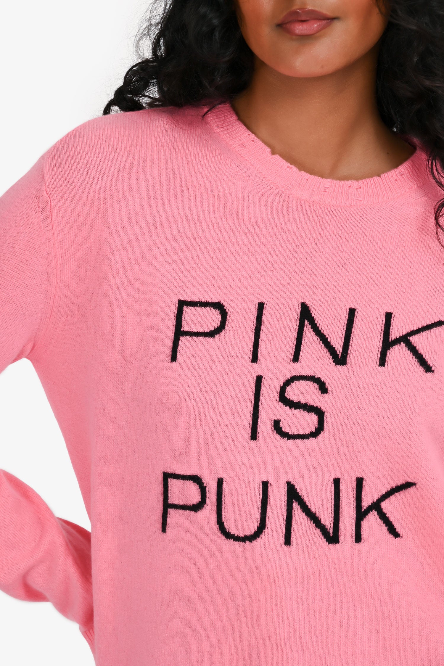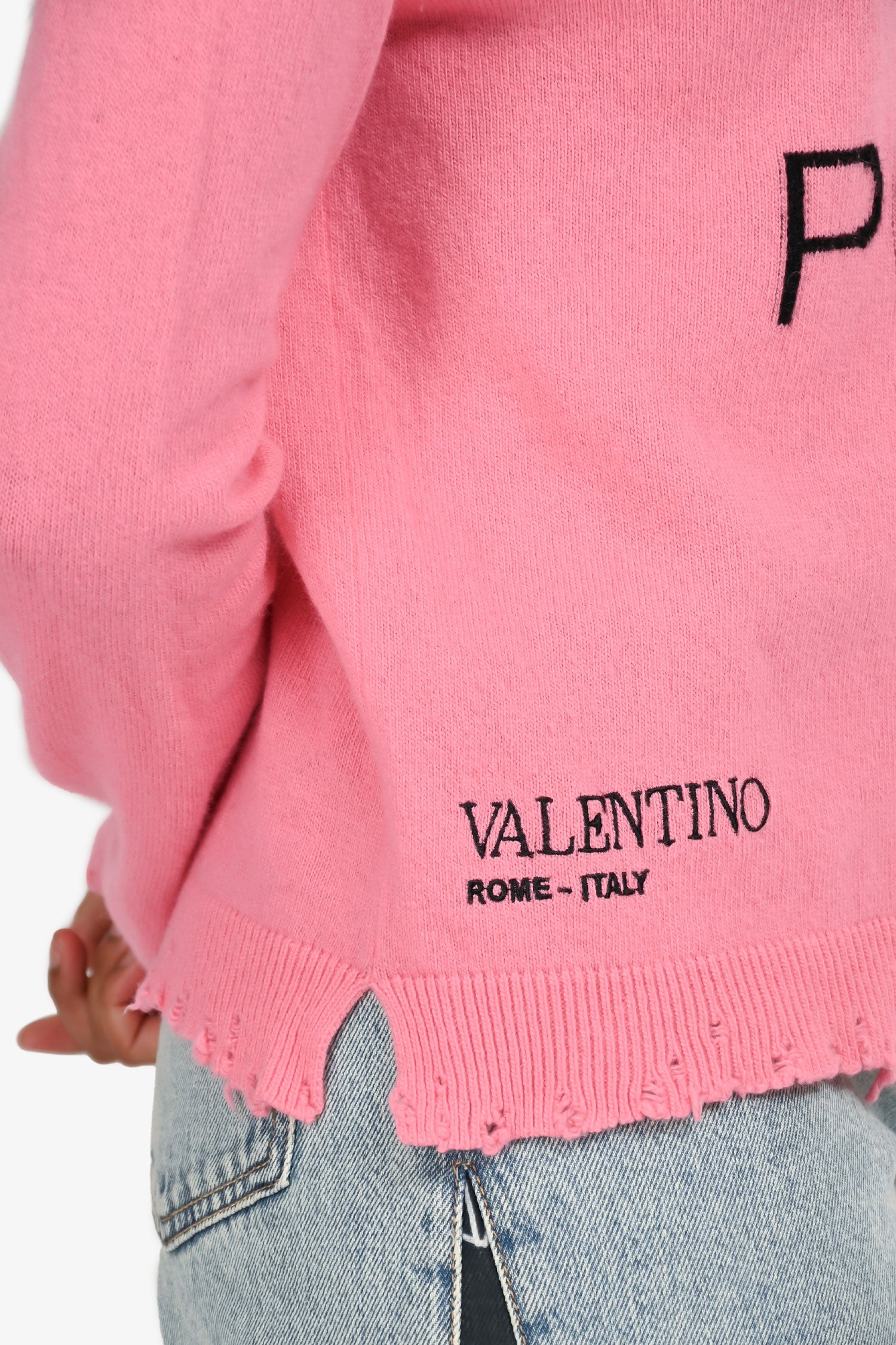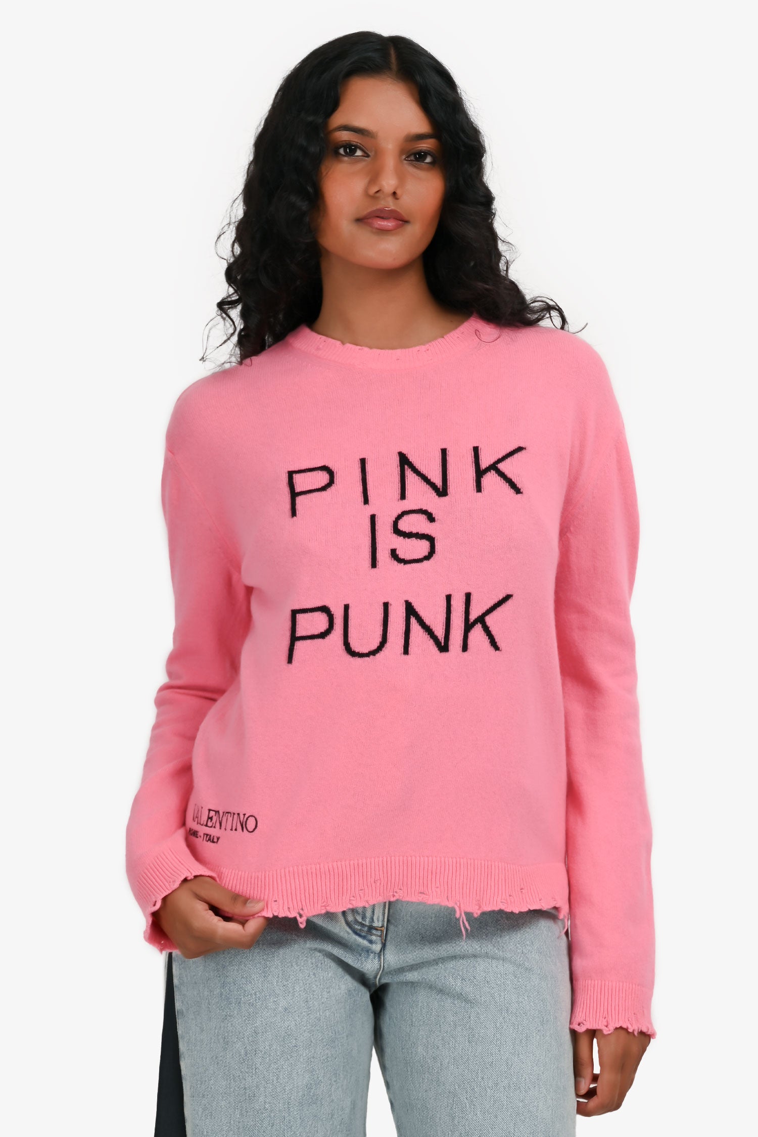 Refresh availabilityValentino Hot Pink Wool Cashmere Blend 'Pink is Punk' Distressed Sweater. Distressed collar, hem, and cuff detailing. Centre back stud detailing. Bottom right embroidered logo.