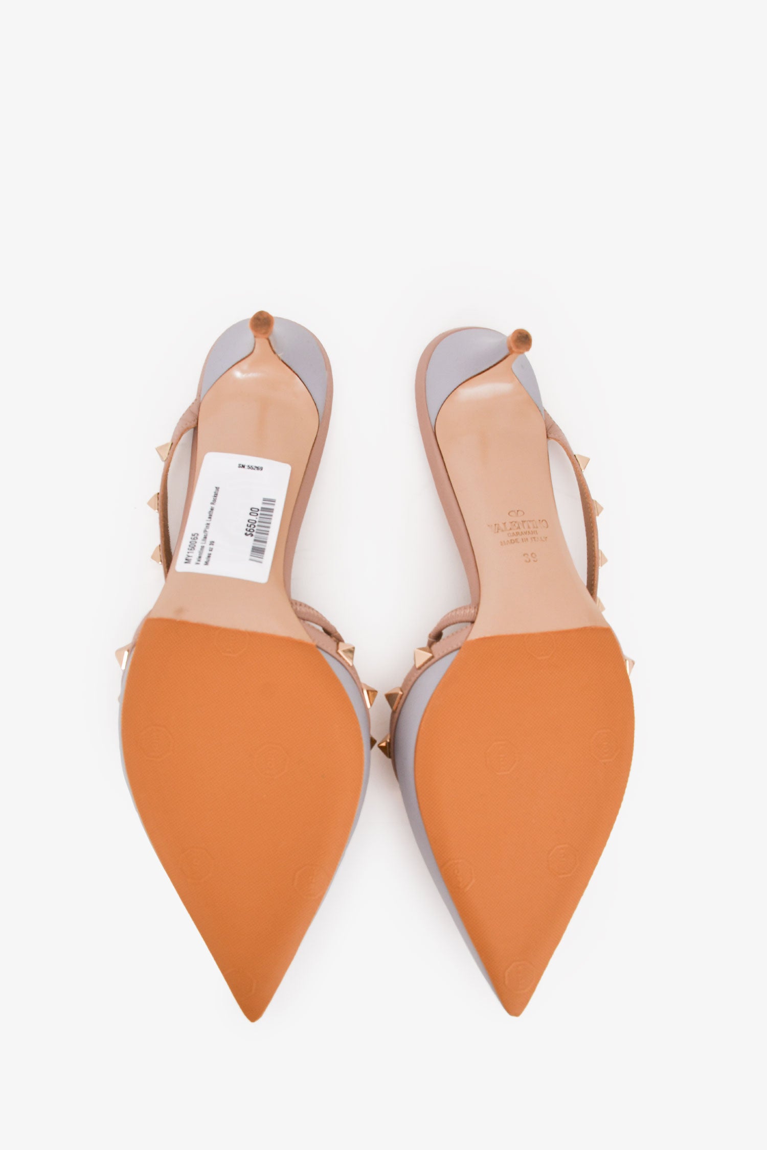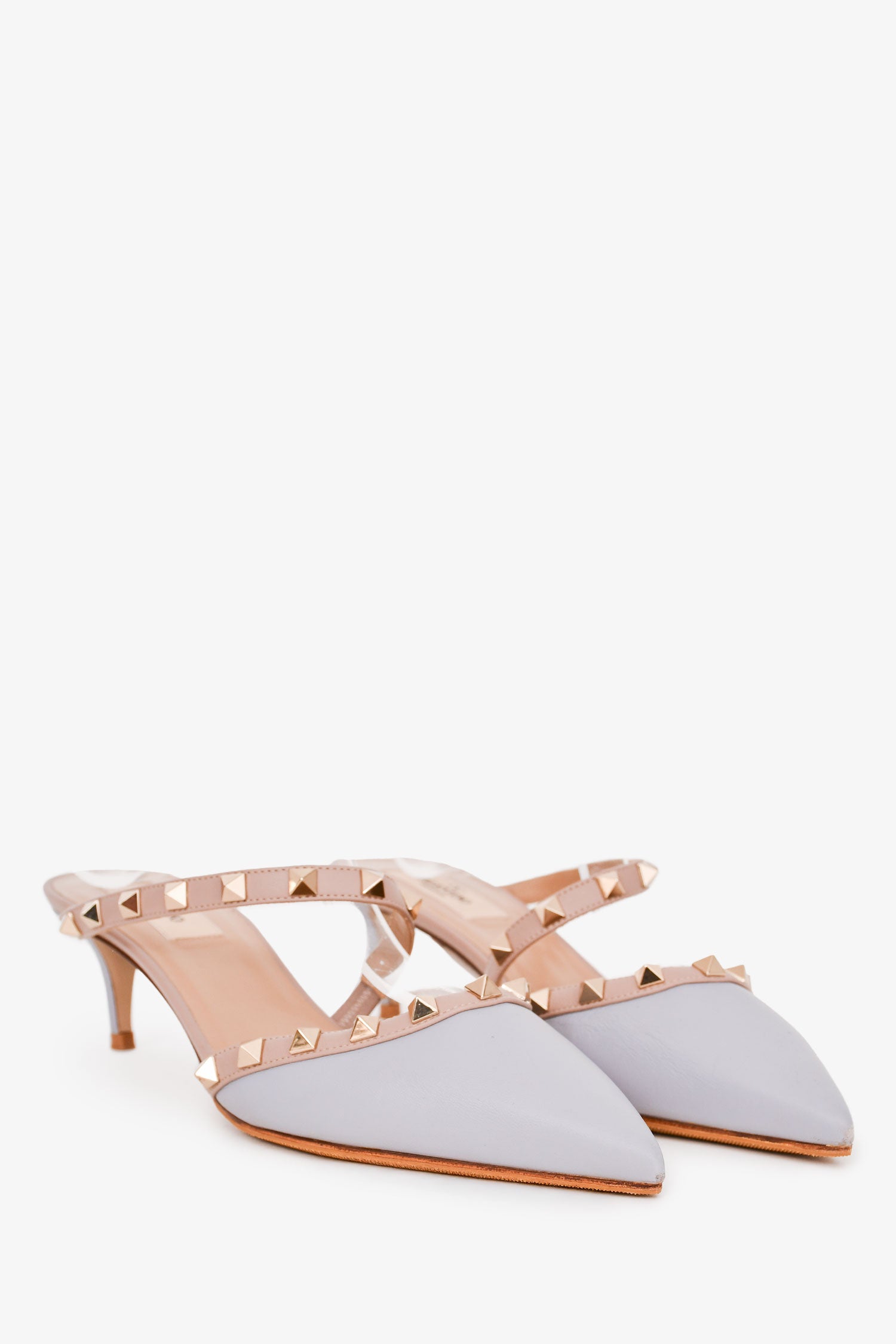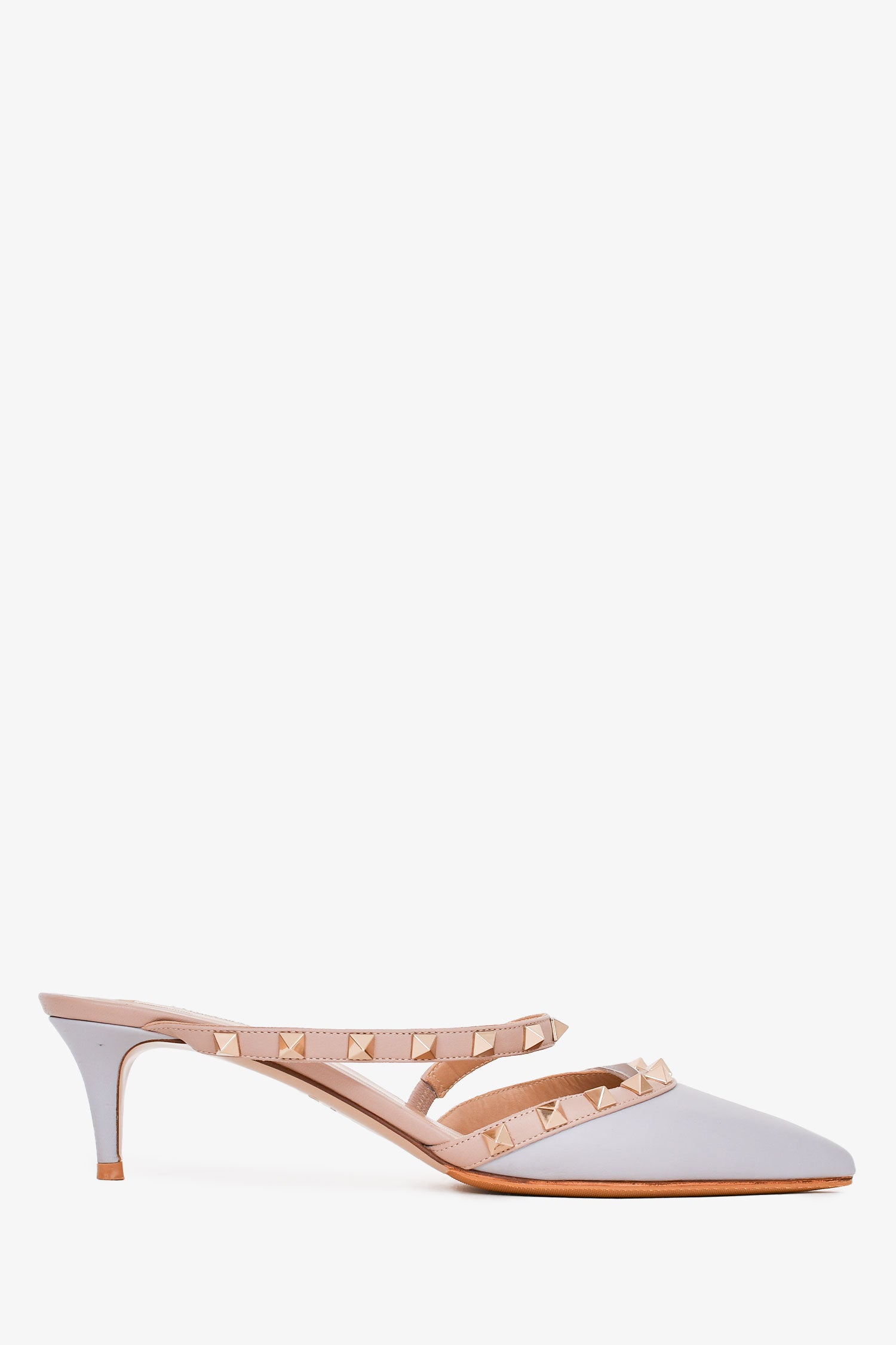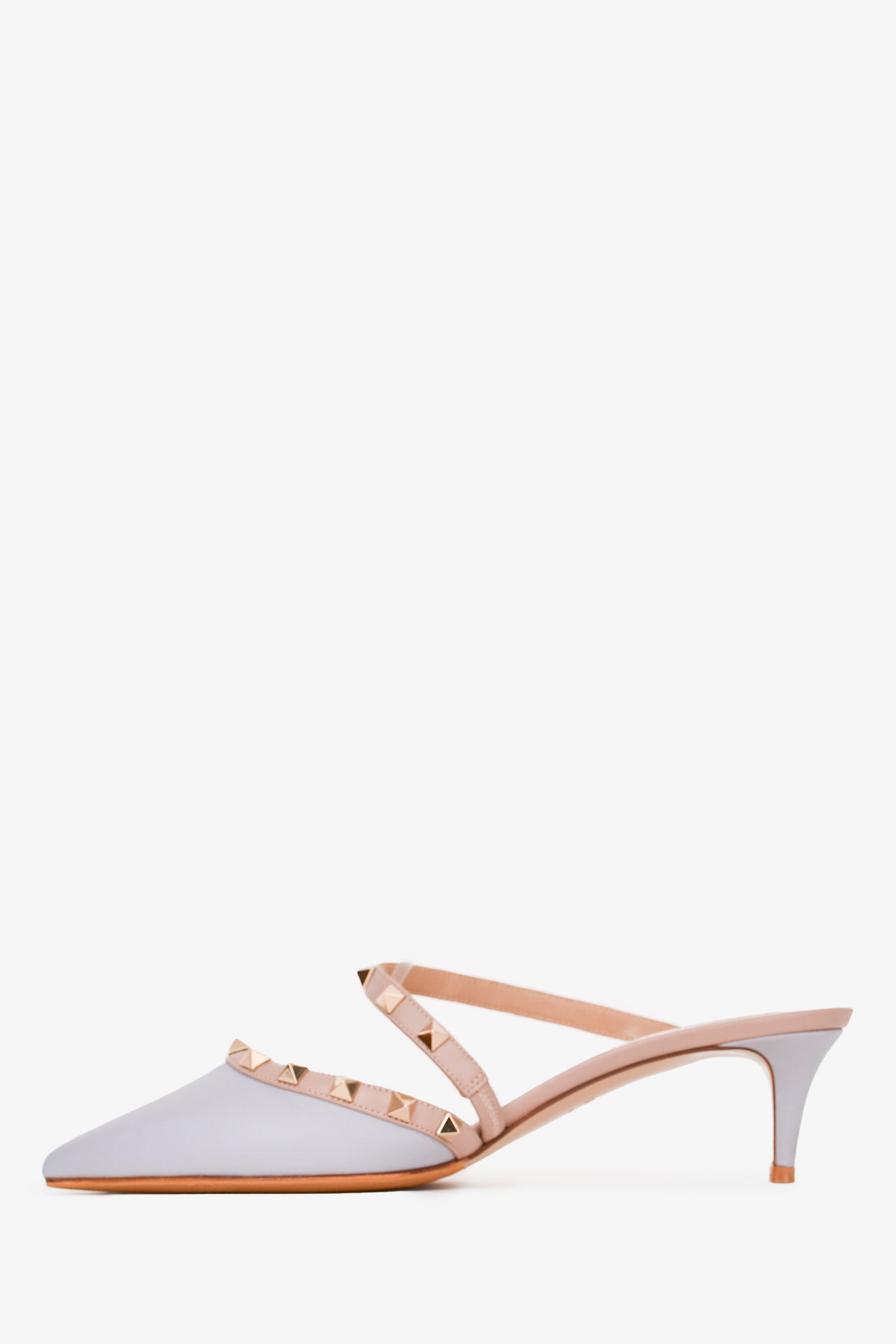 Refresh availabilityValentino Lilac/Pink Leather Rockstud Mules. Gold-tone rockstuds. Two-tone pink and lilac trimming. Leather insole. Tonal stitching.