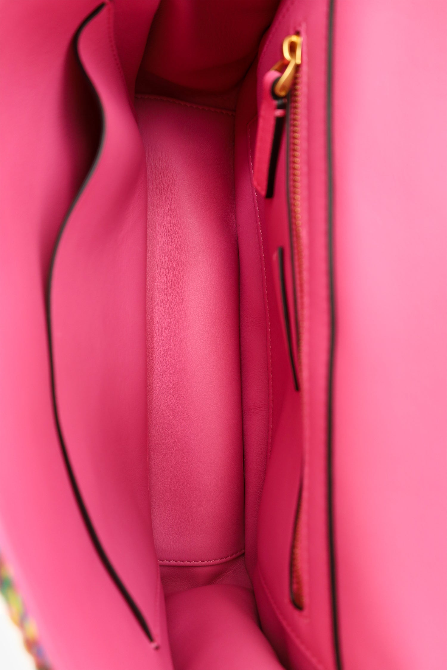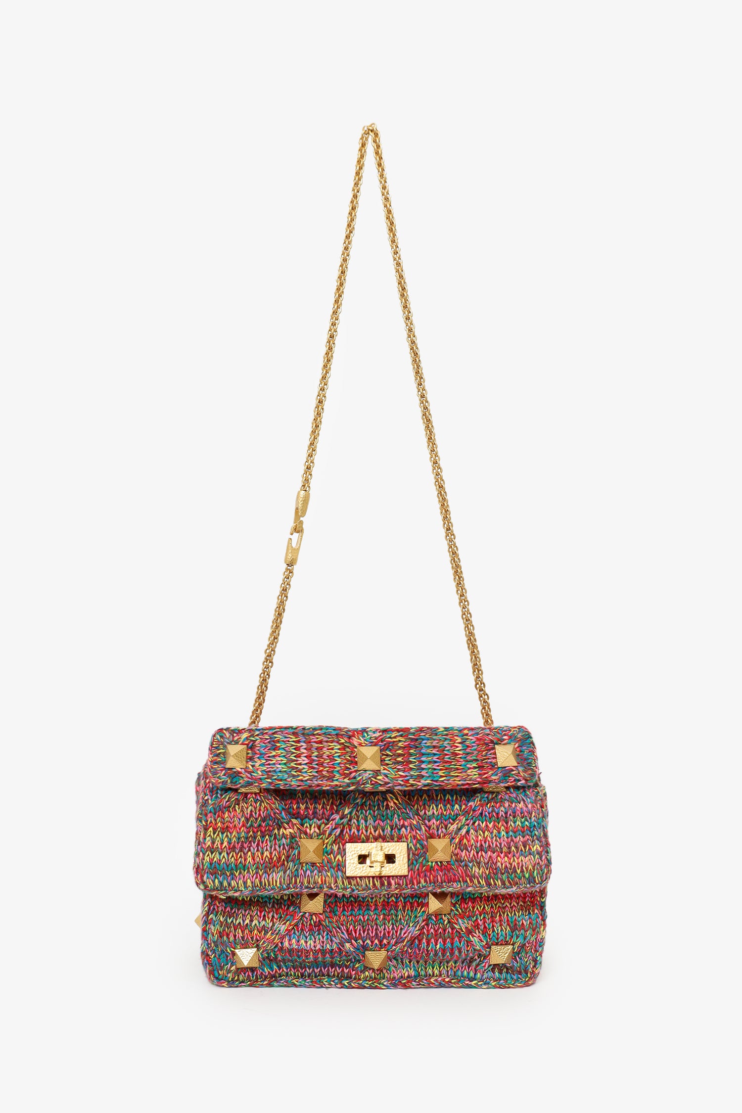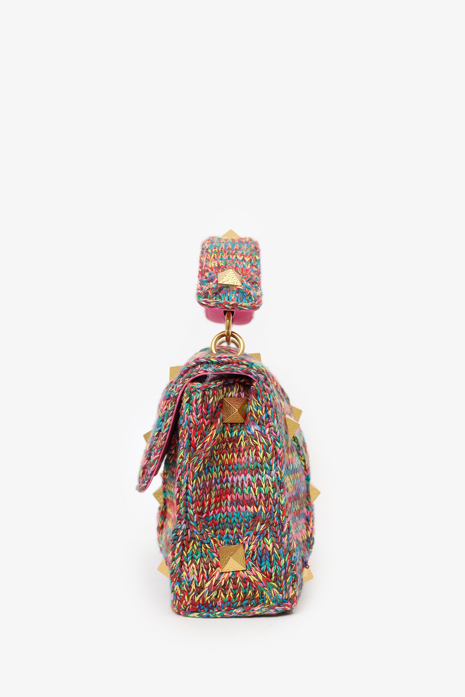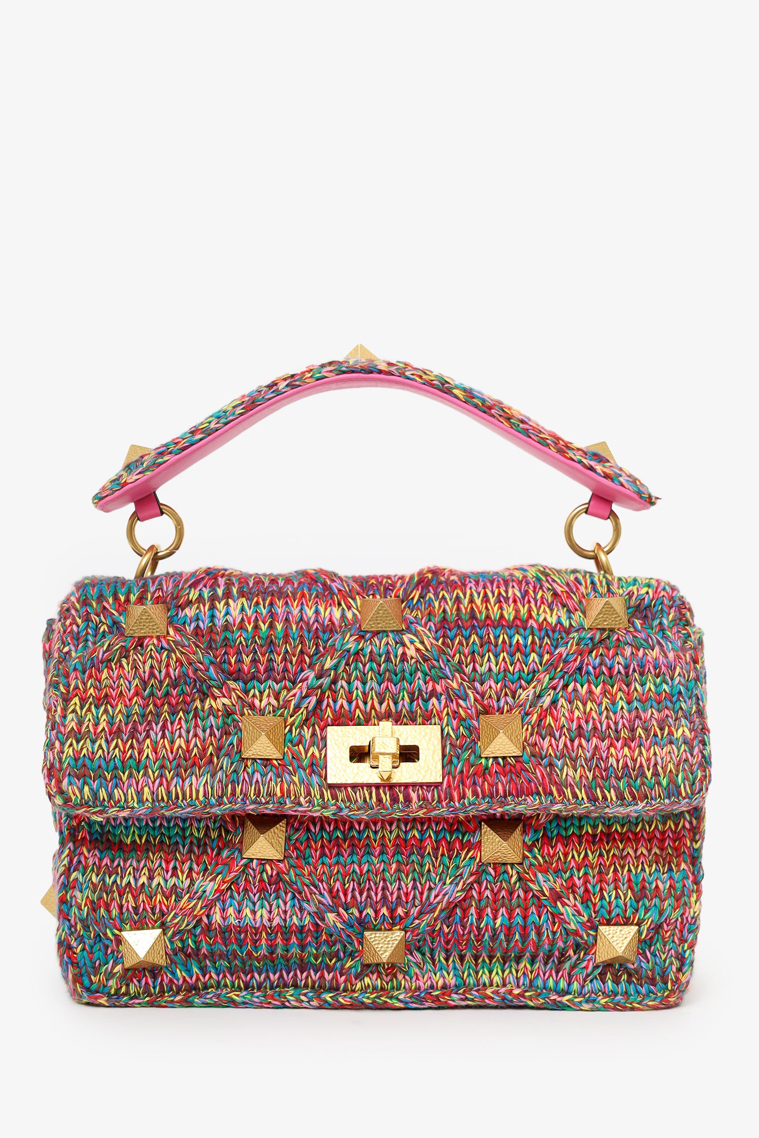Refresh availabilityValentino Multicolour Roman Stud Woven Handle Bag. Front fold-over flap with turn-lock closure. Top handle. Removable chainlink strap that can be one long strap or doubled as shoulder straps. Leather-lined interior. 2 interior pockets; 1 slip and 1 zip. Gold-tone hardware. Tonal stitching.
