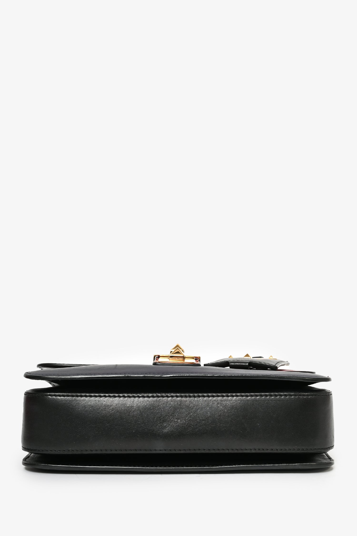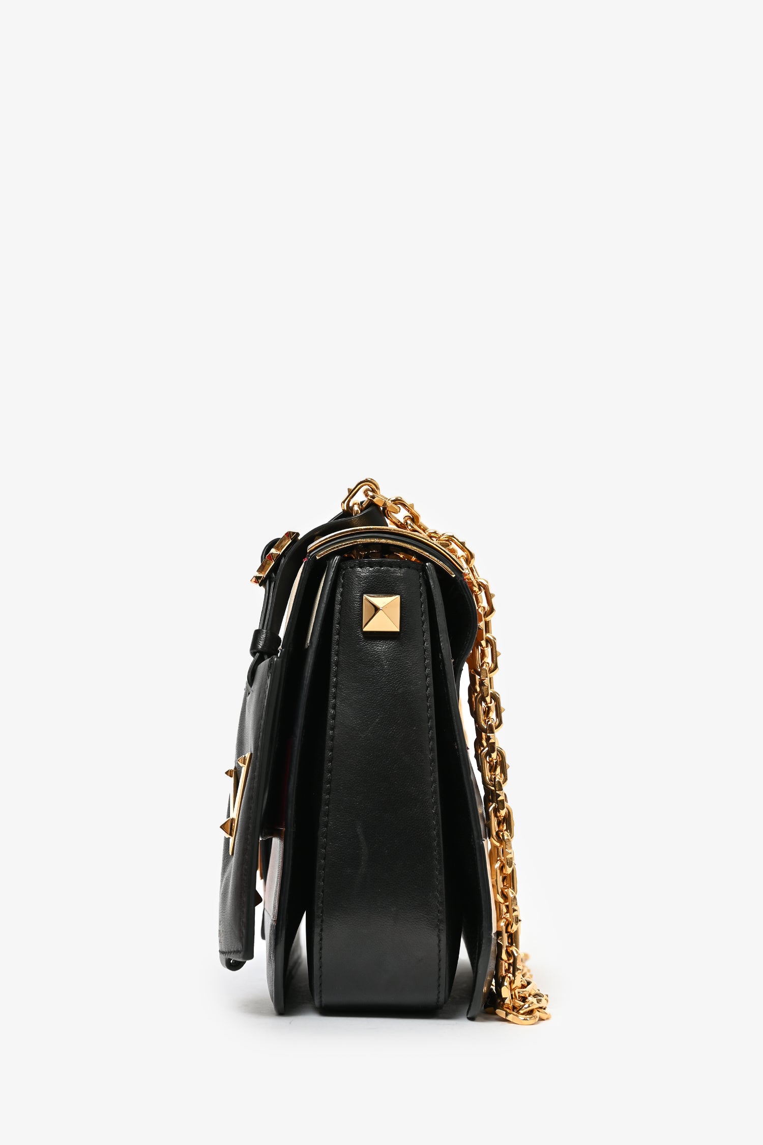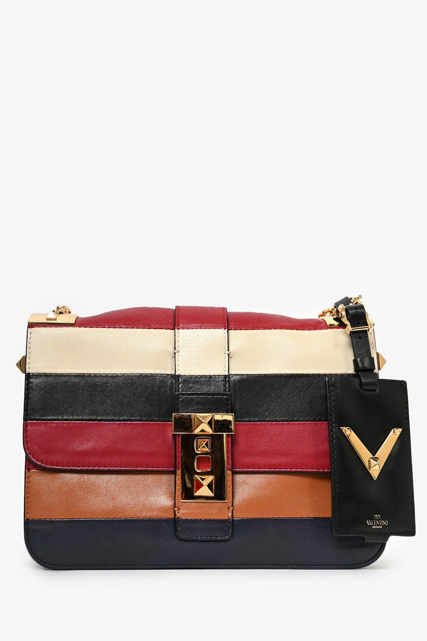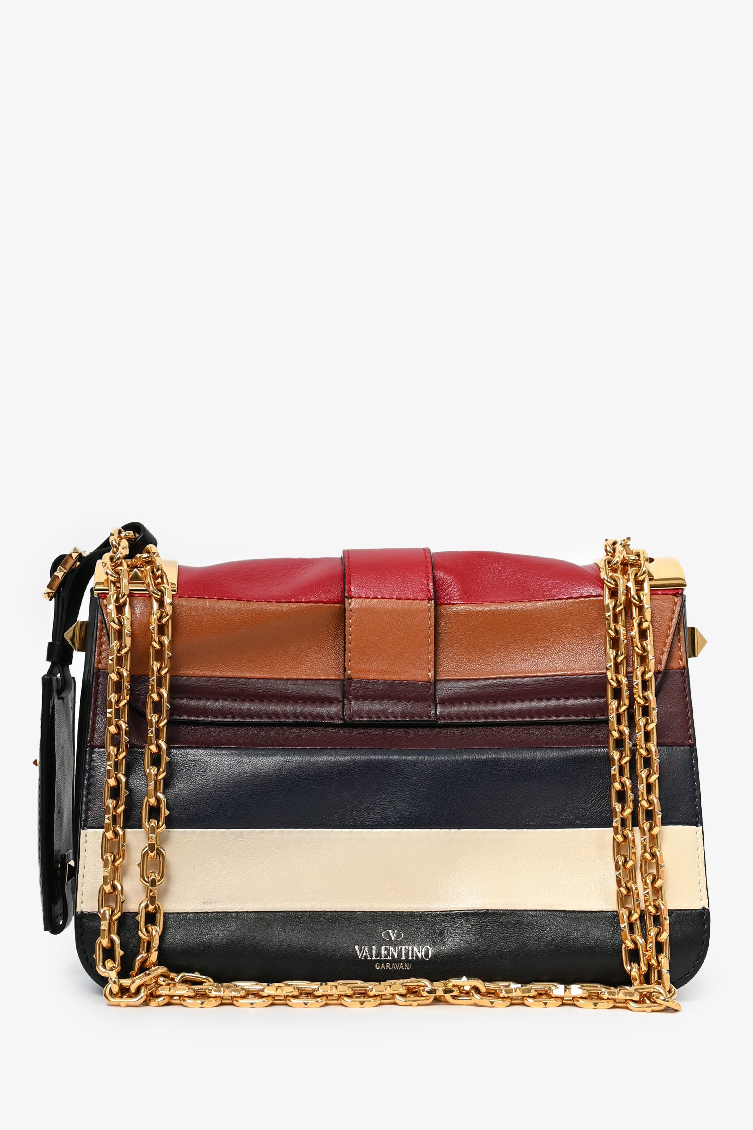 Refresh availabilityValentino Multicoloured Leather B-Rockstud Striped Crossbody. Front fold-over flap with strap closures. Black leather interior. 3 interior compartments; separated by dividers. Single interior wall zip pocket. Slide-around chain. Gold-tone hardware.