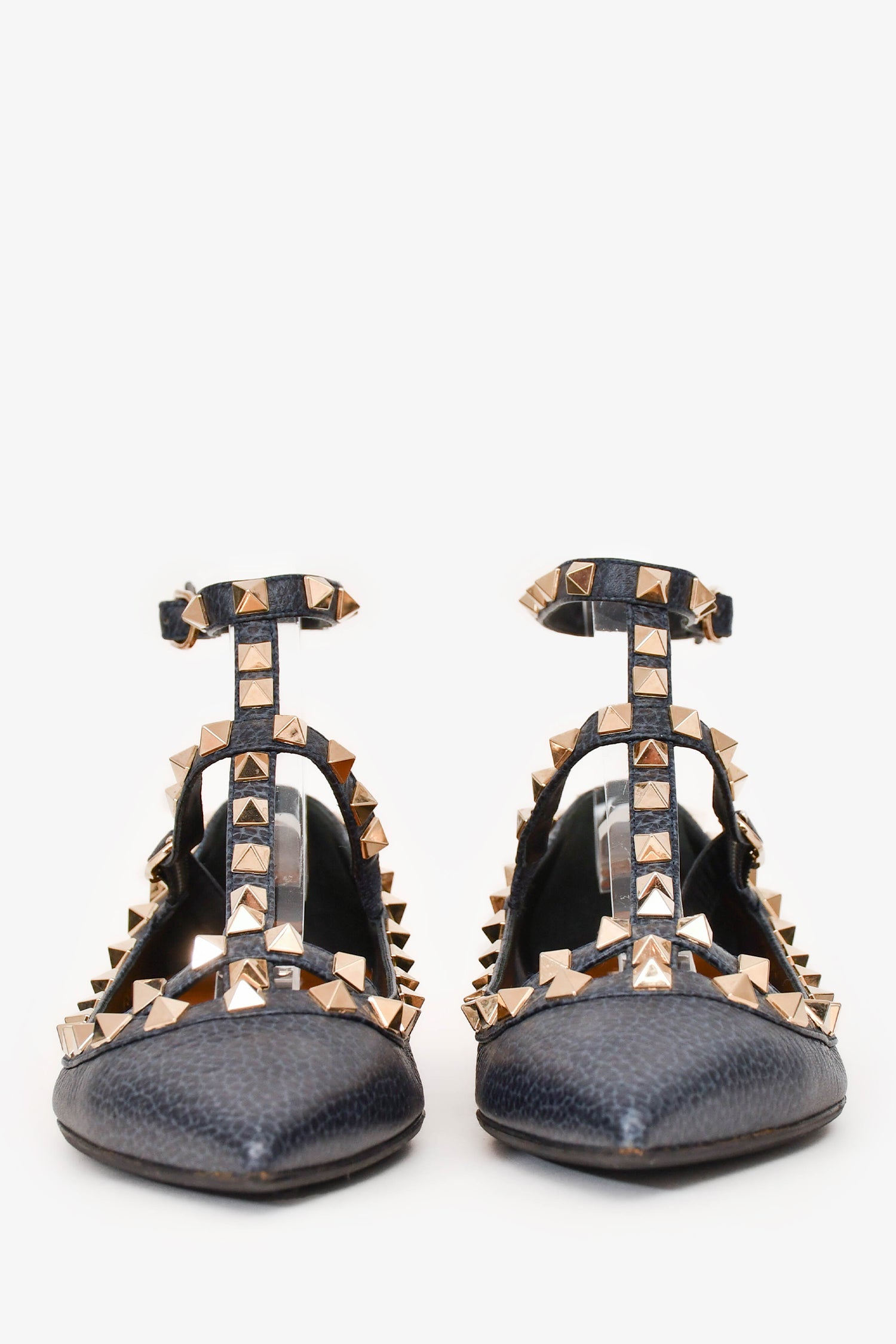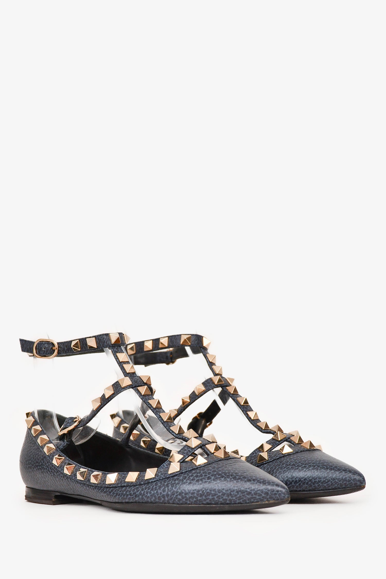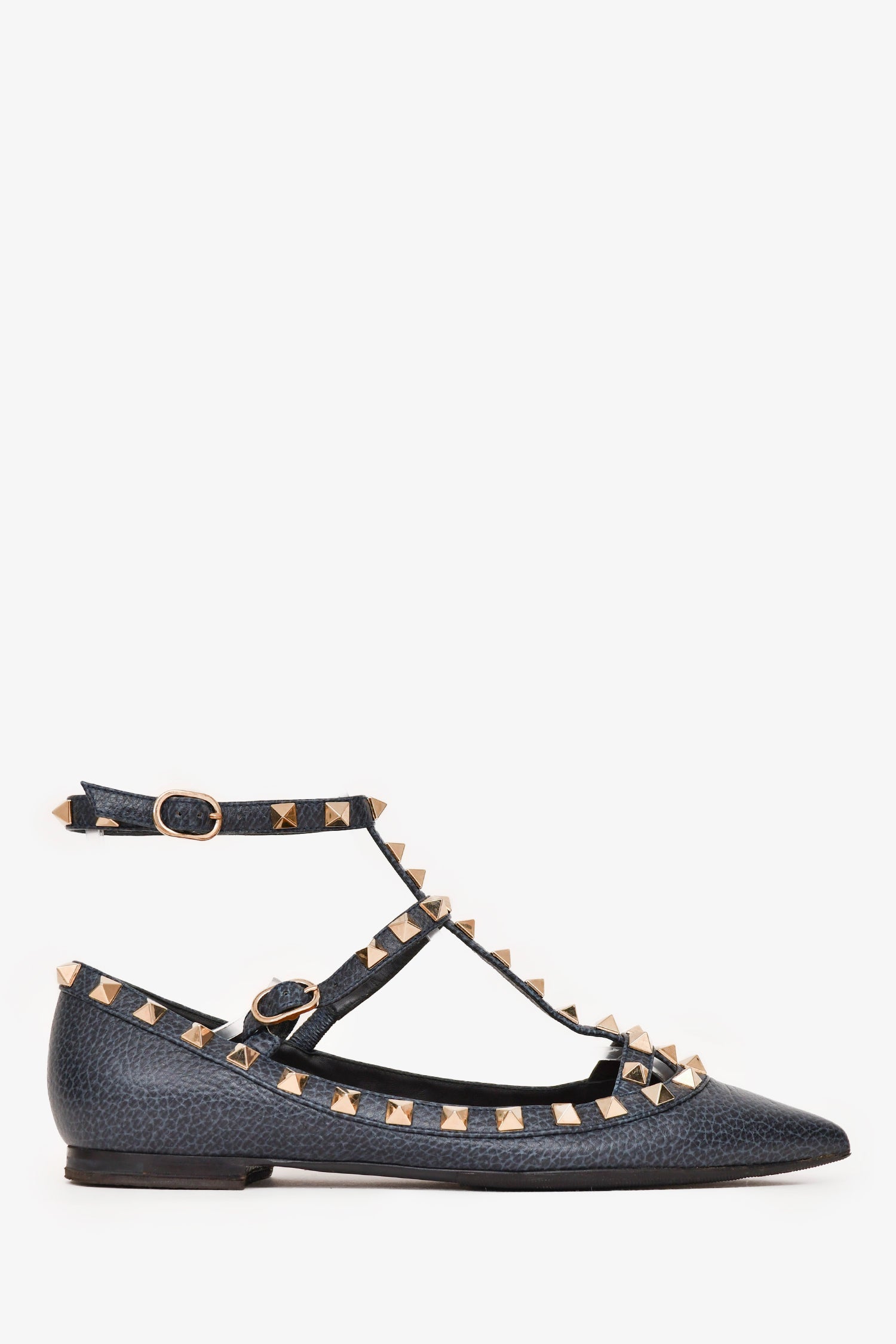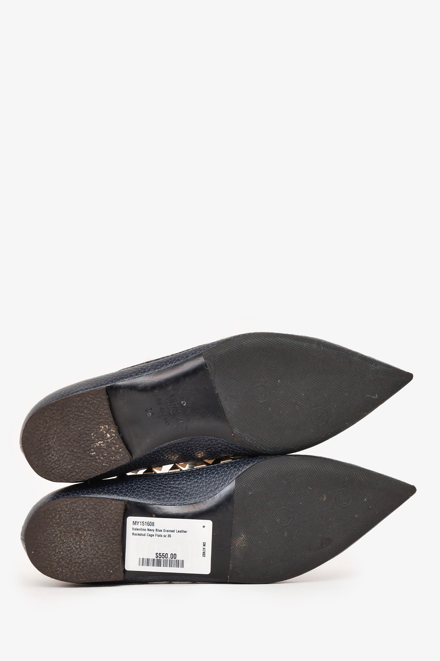 Refresh availabilityValentino Navy Blue Grained Leather Rockstud Cage Flats. Pointed toe. Buckle closure at the heel. Gold-tone hardware. Tonal stitching.