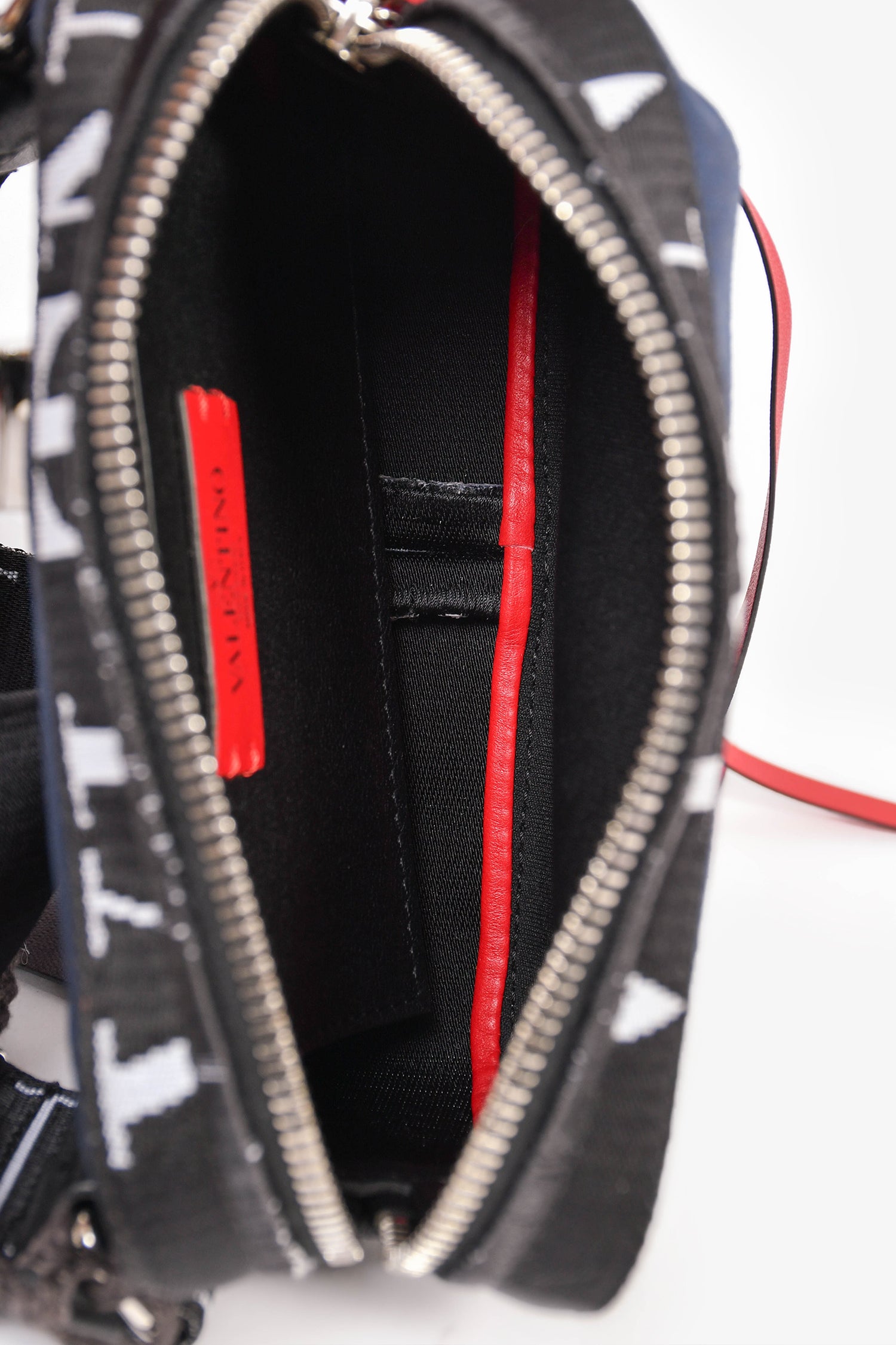 Refresh availabilityValentino Navy Cloth Black Canvas Logo Strap Bum Bag. Silver-tone hardware. Canvas exterior with leather trim. Upper zipper. Logo'd webbed belt with buckle. Tonal stitching.