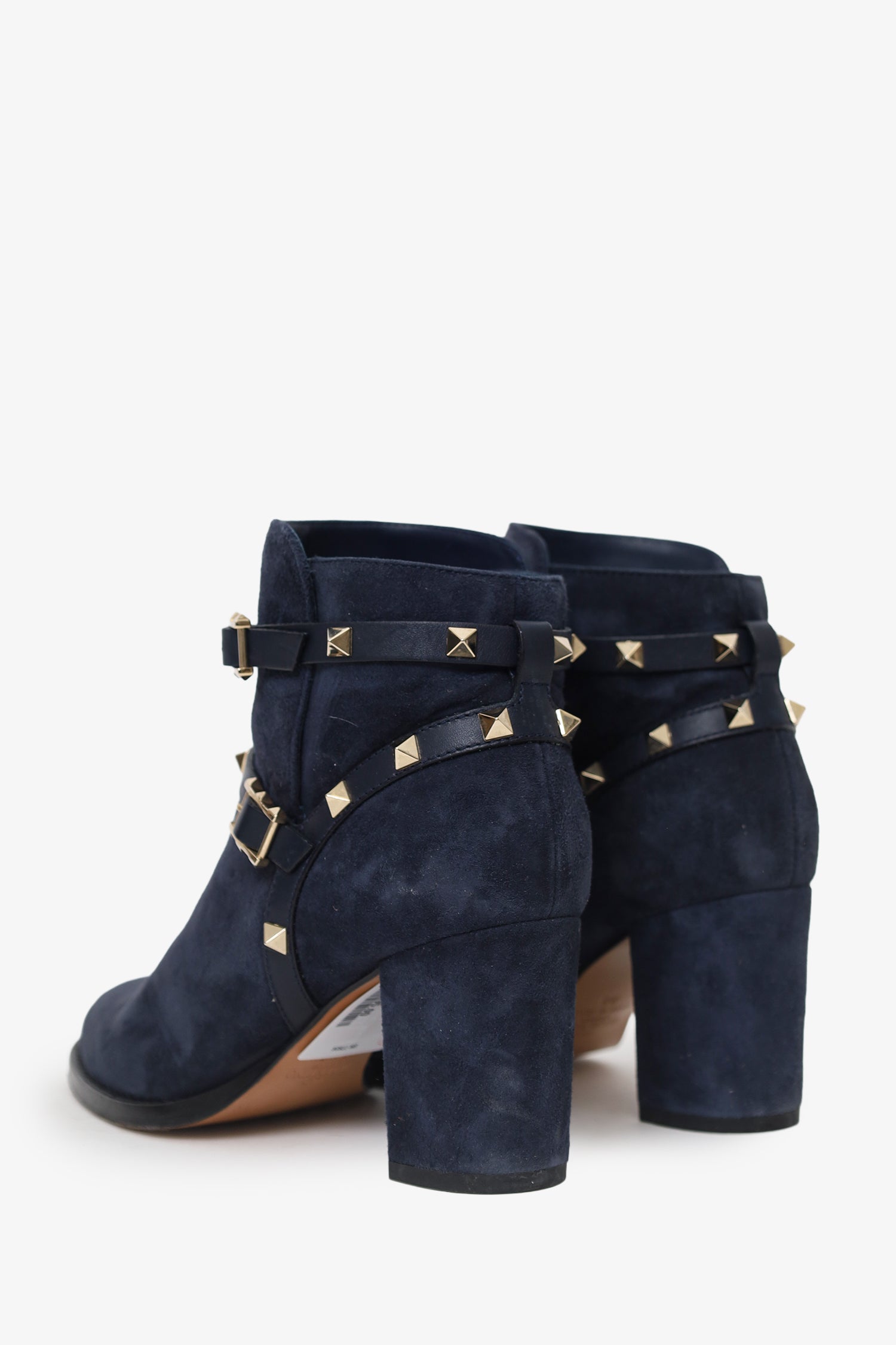 Refresh availabilityValentino Navy Suede Rockstud Heeled Boot. Pull-on. Round toe. 2-way adjustable pull-through buckle closure to exterior side. Block heel. Leather-lined interior. Gold-tone hardware. Tonal stitching.