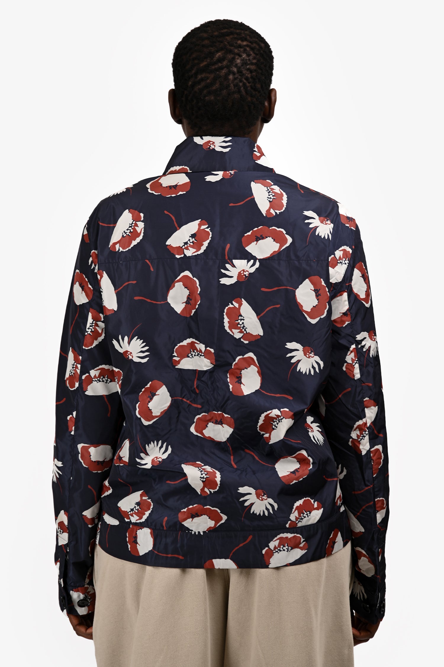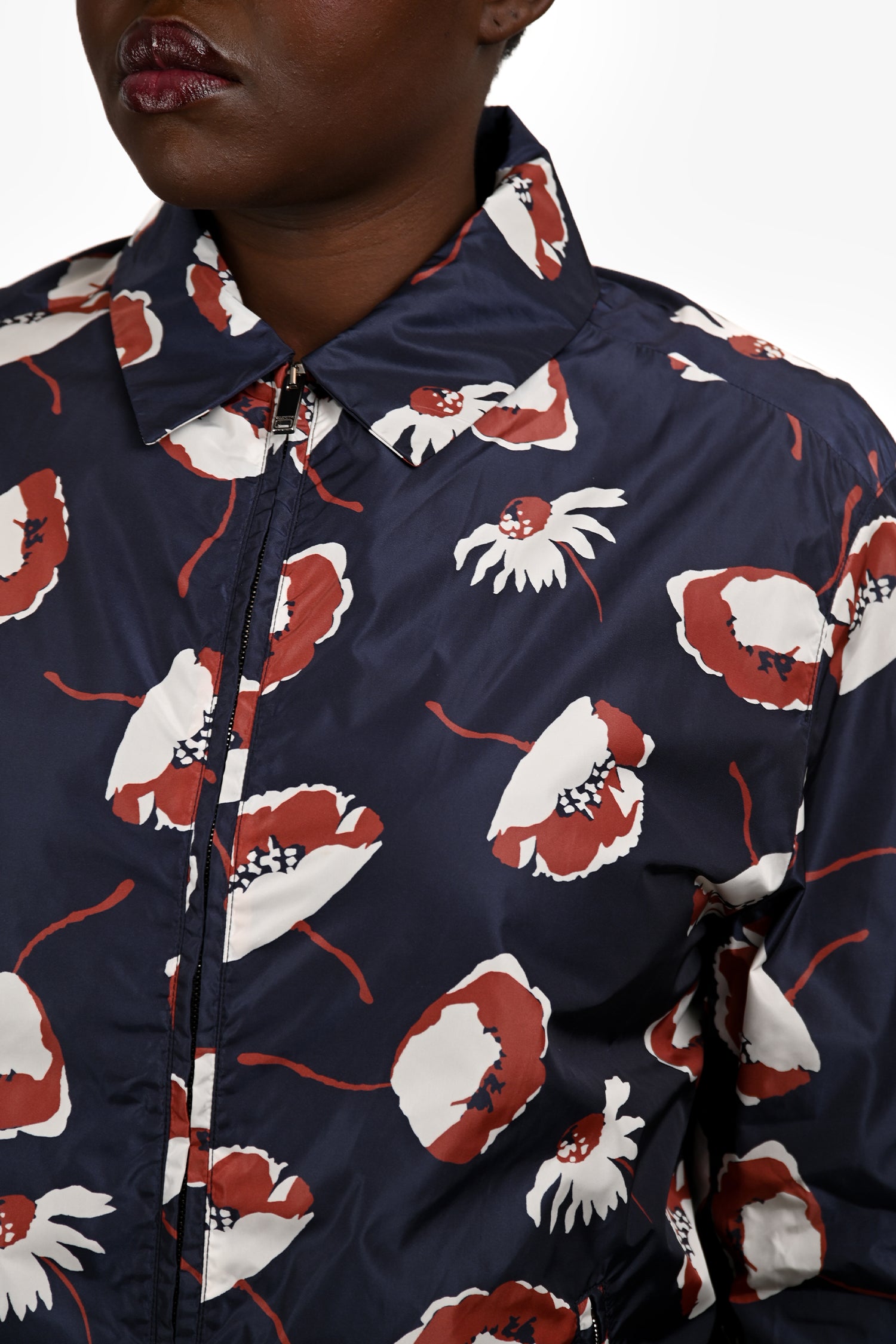 Refresh availabilityValentino Navy/Red Floral Patterned Bomber Windbreaker Jacket. Pull-on. Front 2-way zip closure. Collared-neckline. Cuffs with button-up closures. 2 exterior zip pockets; 1 interior zip pocket. Fully lined. Silver-tone hardware. Tonal stitching.