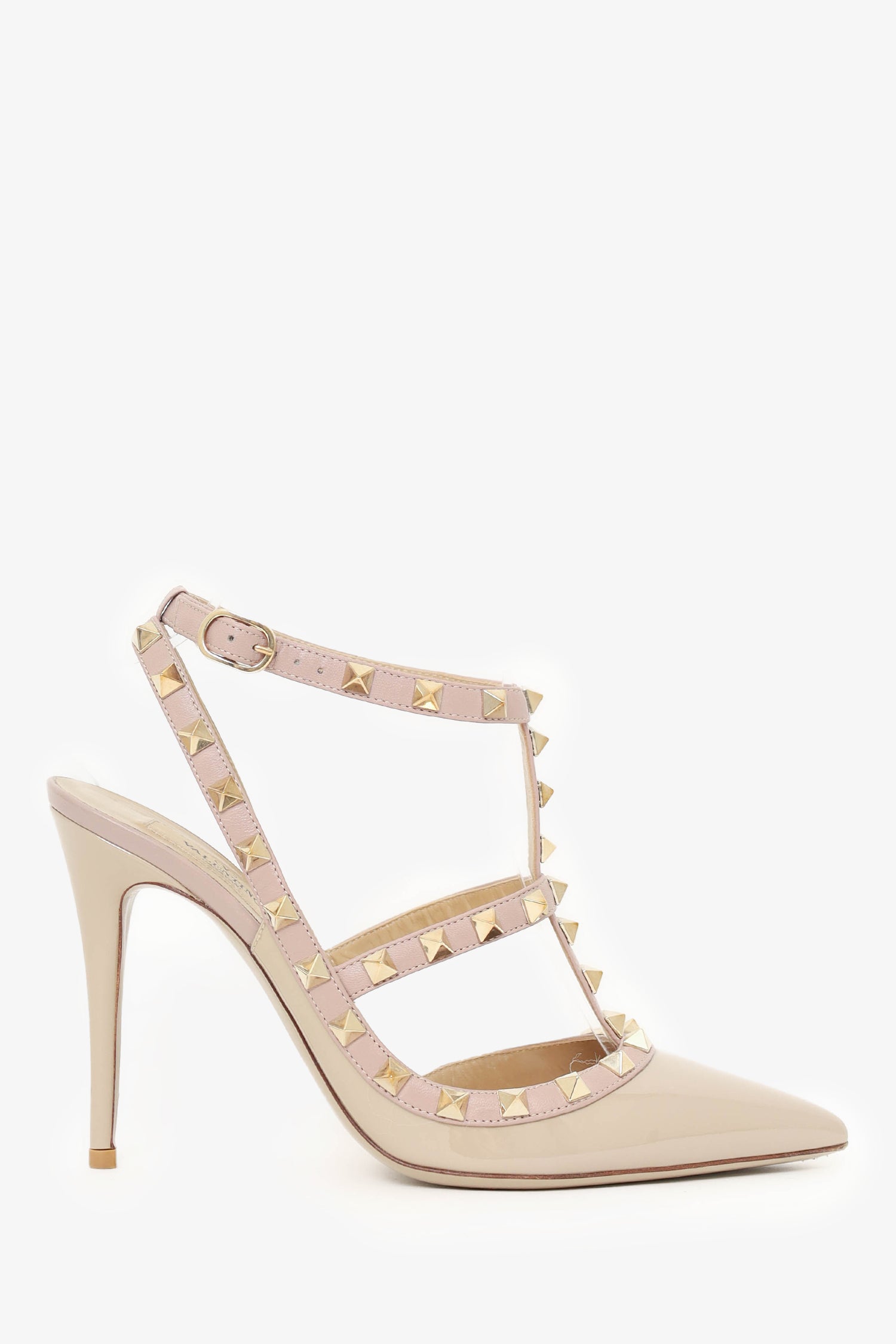 Refresh availabilityValentino Nude Cage Rockstud Paten Leather Heels. Pointed toe. Adjustable ankle buckle closure. Gold-tone hardware. Tonal stitching.