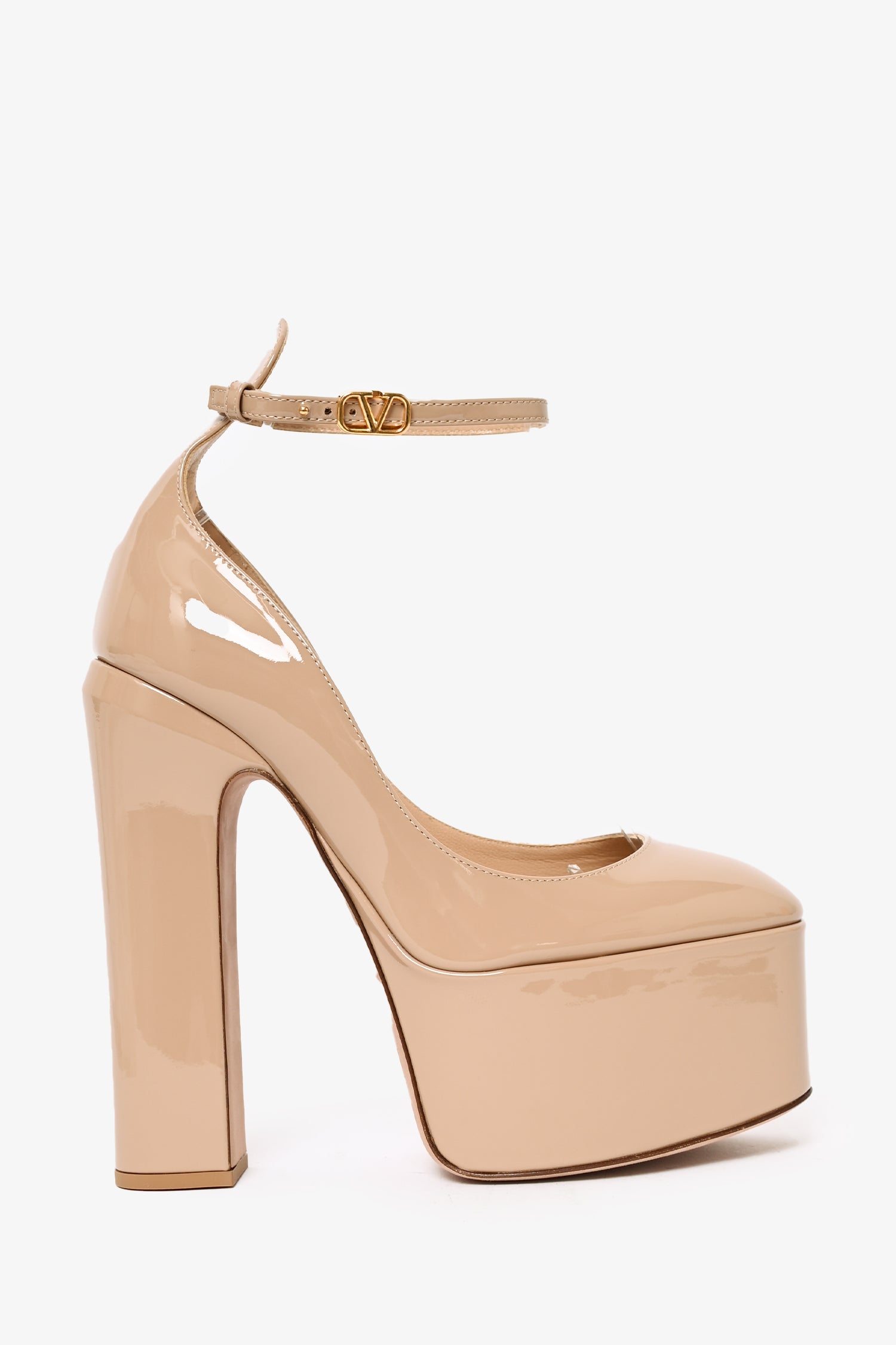 Refresh availabilityValentino Nude Patent Leather Platform Heels. Gold-tone "V" logo hardware on adjustable ankle strap with push closure. Almond toe. Topy soles. Tonal stitching.