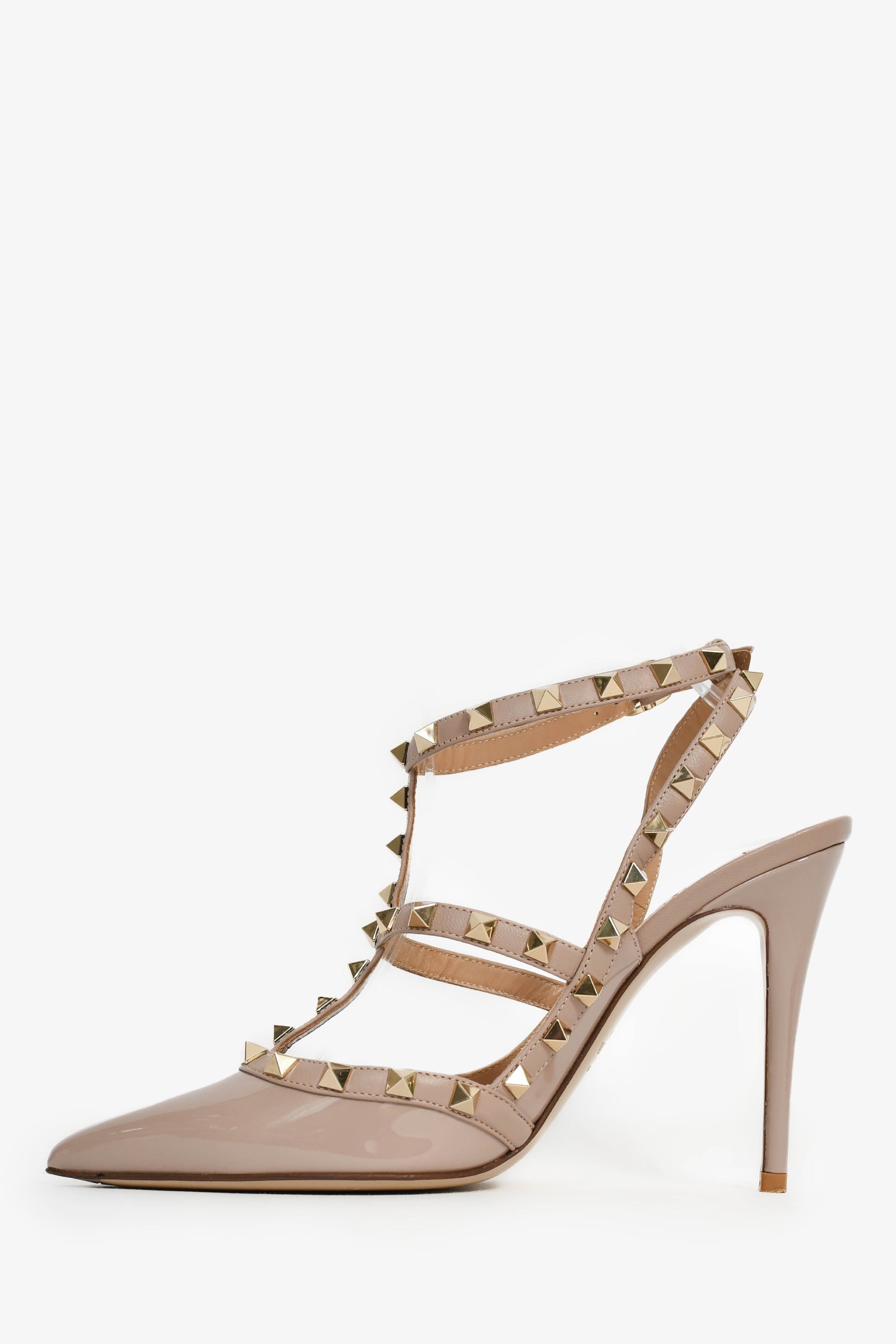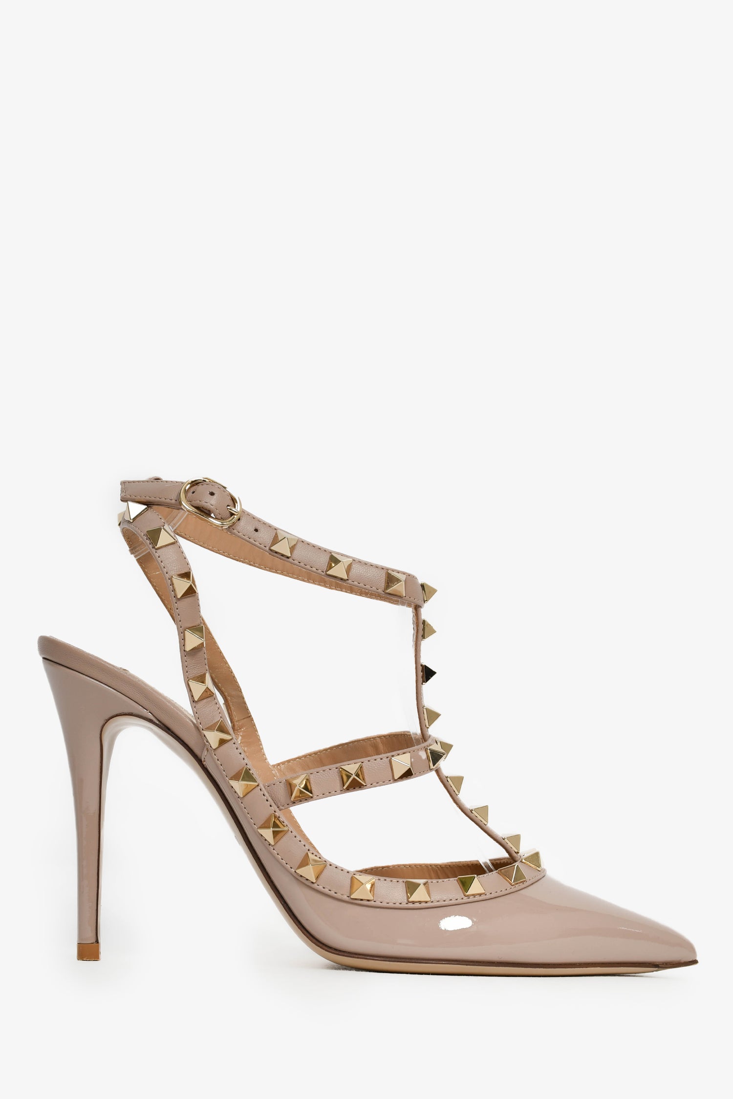 Refresh availabilityValentino Nude Patent Rockstud Pointed Toe Pumps. Slip-on. Adjustable ankle strap with pull-through closure. Gold-tone hardware. Tonal stitching.