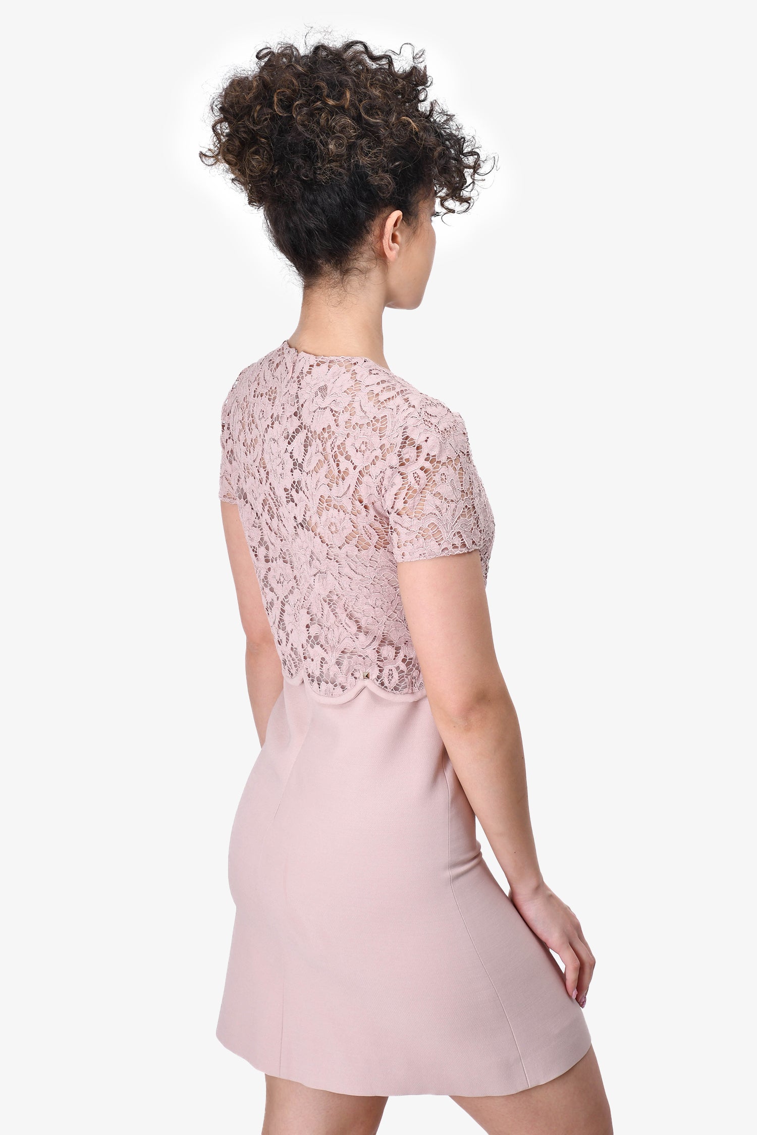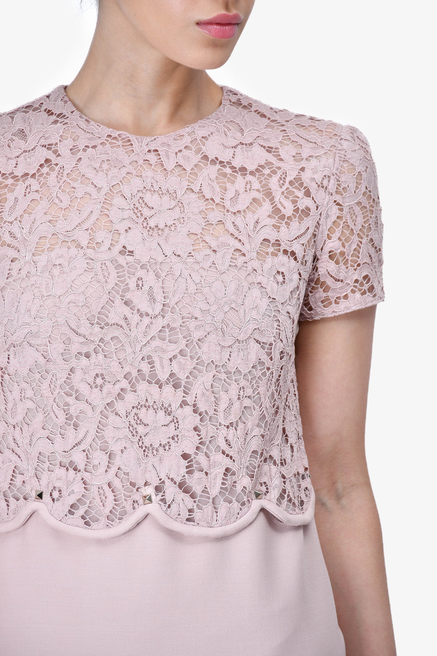 Refresh availabilityValentino Pink Lace A-Line Dress. Sheer bust area. Crewneck closure. Hidden back closure. Stud detailing on the waist. Tonal stitching.