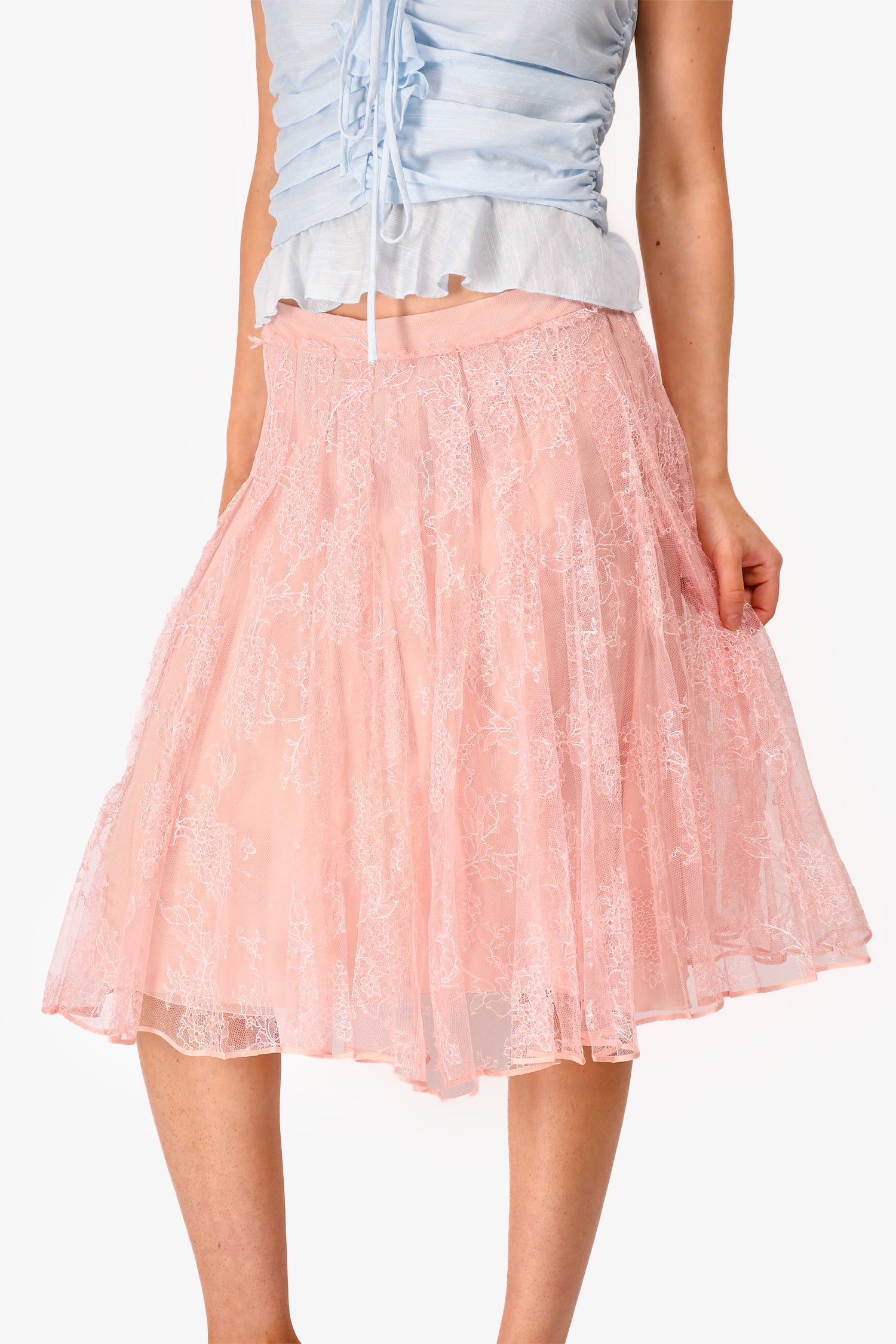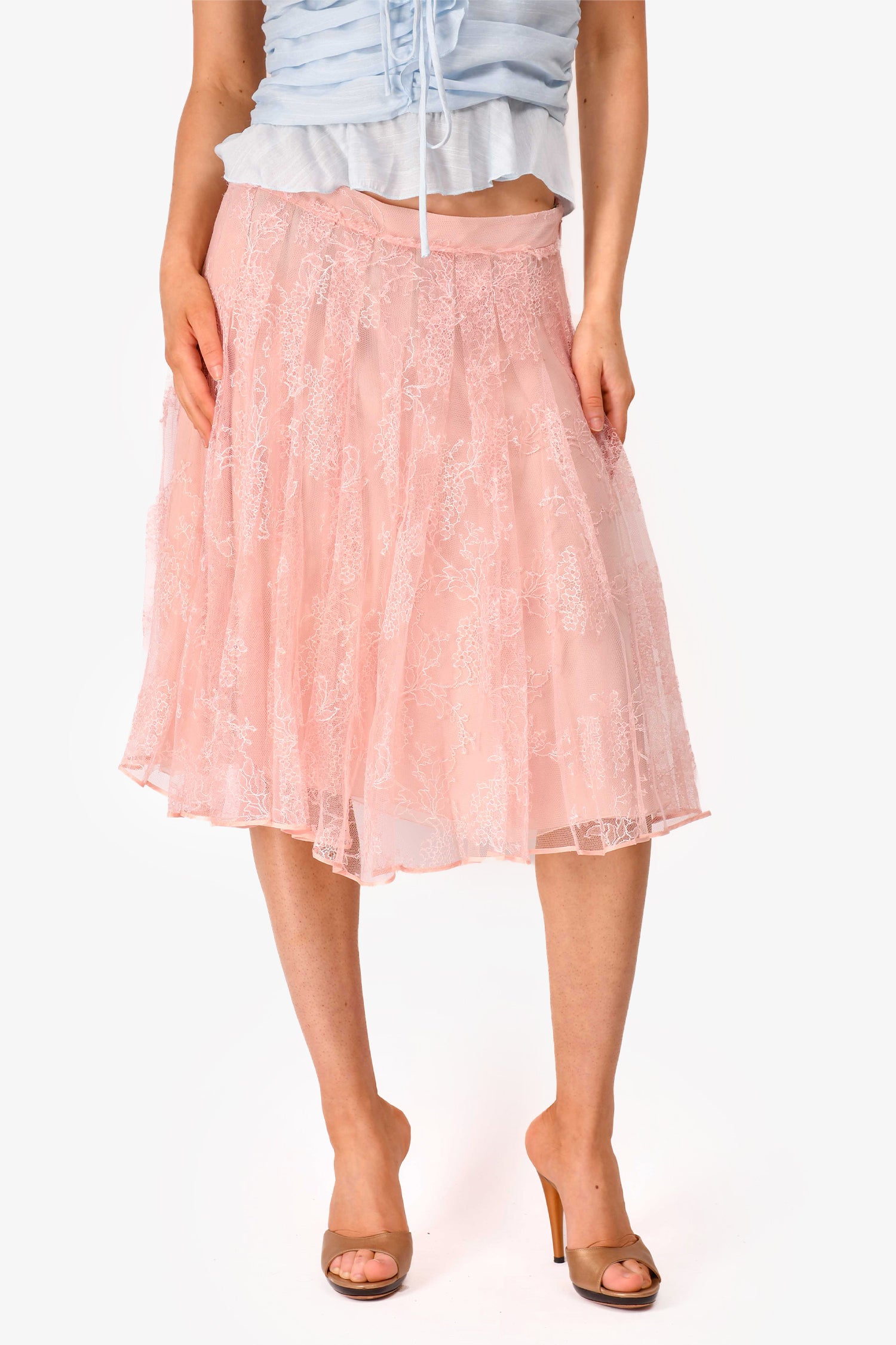 Refresh availabilityValentino Pink Lace Tulle Midi Skirt. Side zip closure. Lined. Tonal stitching.