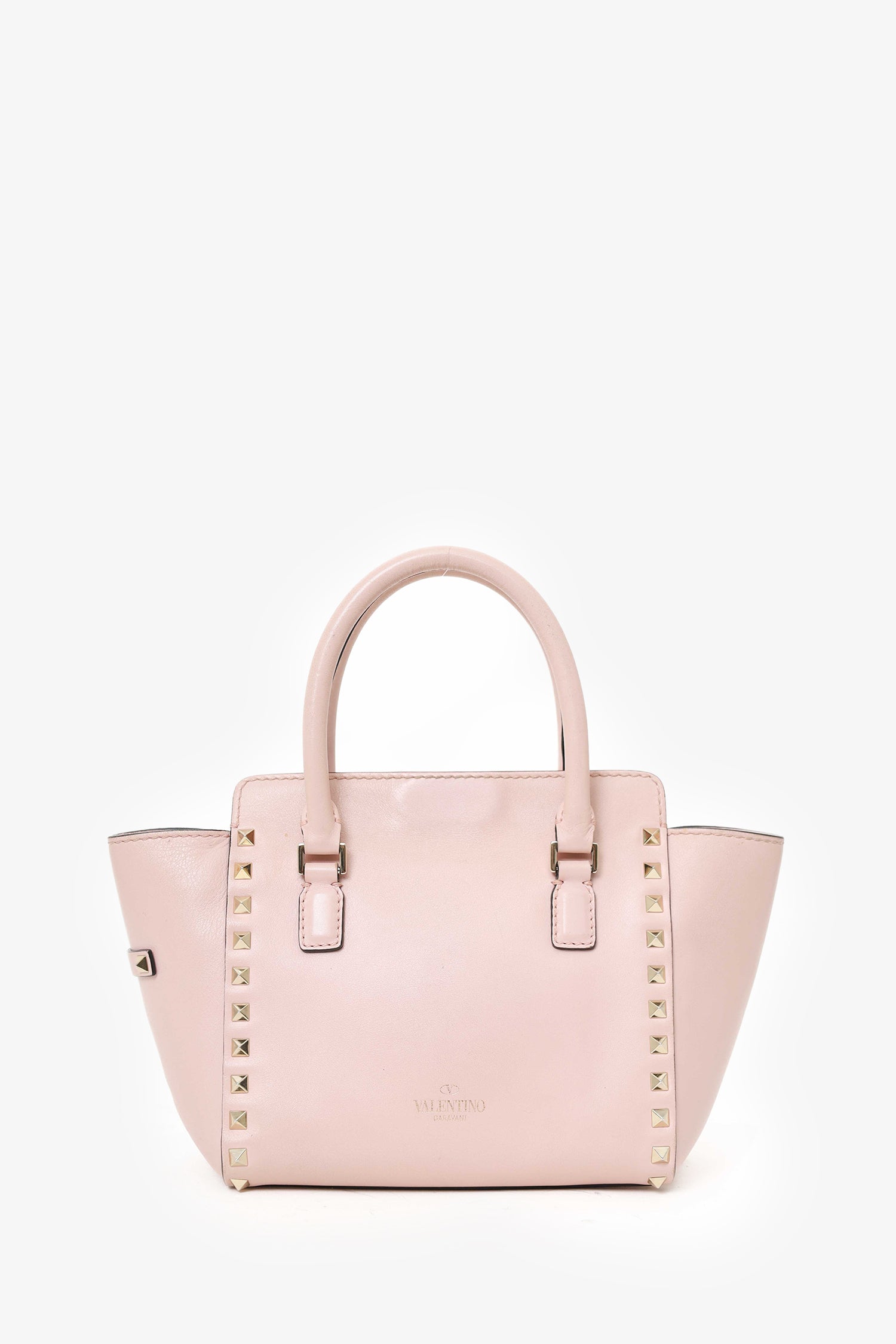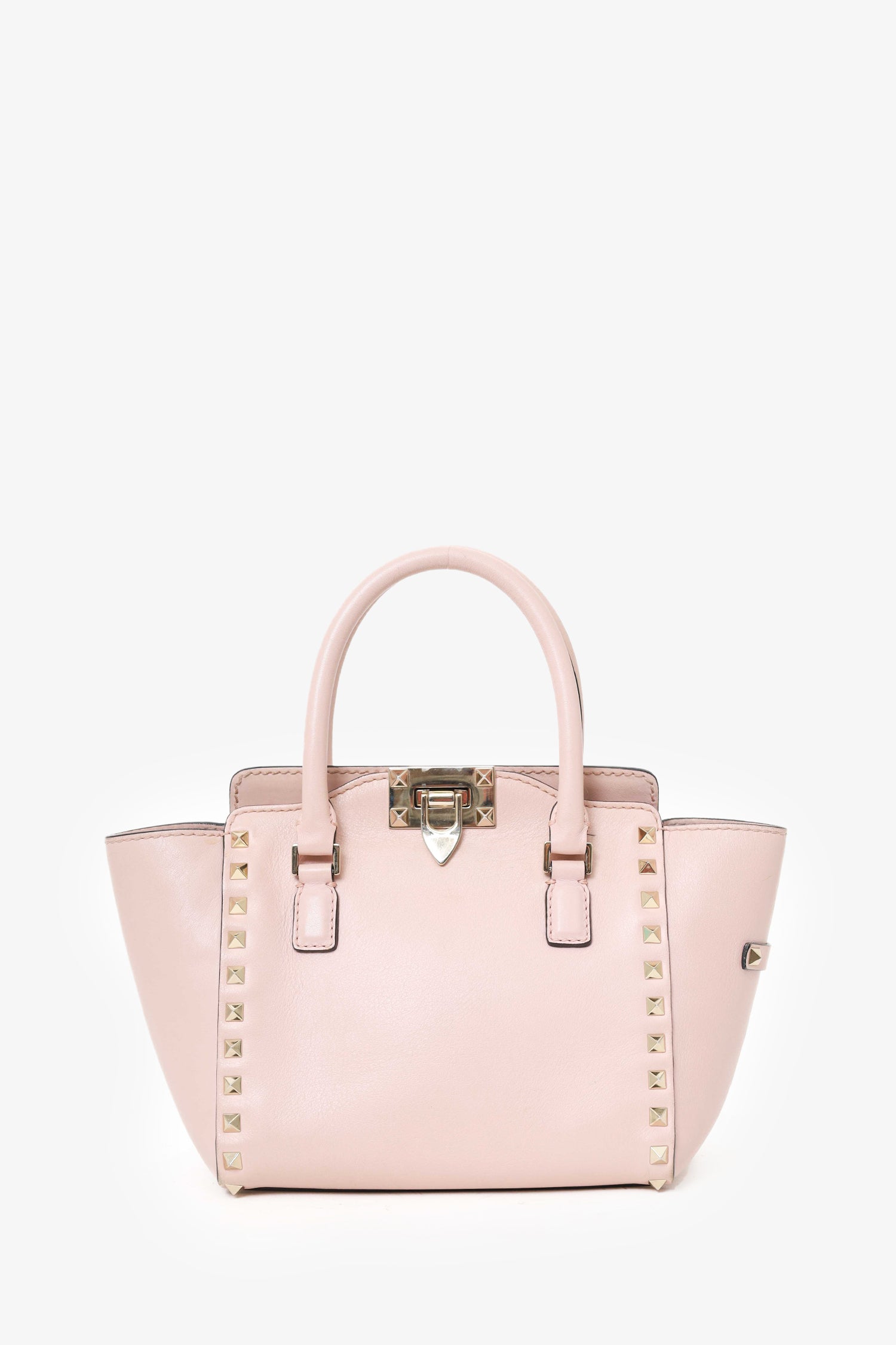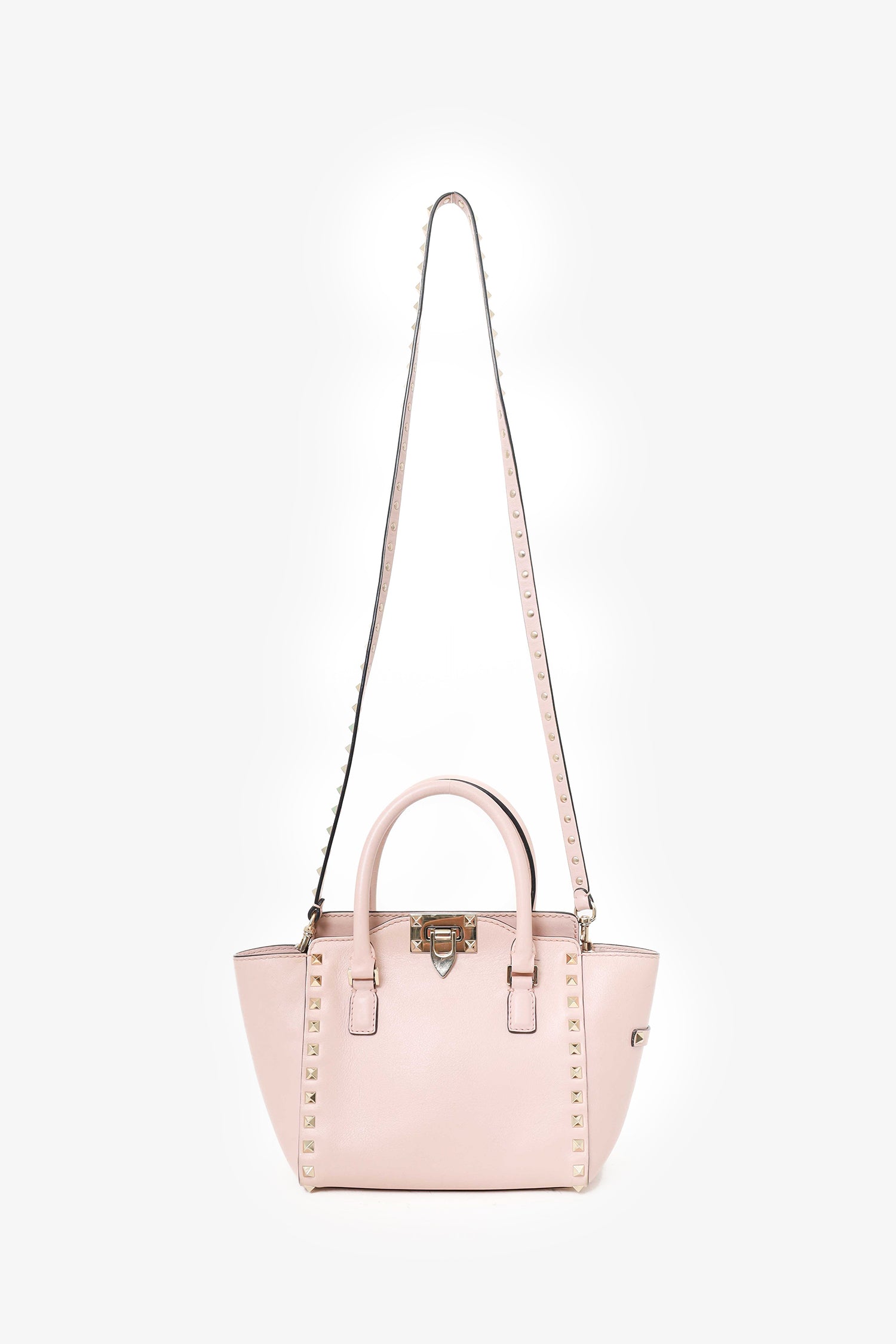 Refresh availabilityValentino Pink Leather Rockstud 2way Mini Bag With Strap. Top flip lock closure. Additional top zip closure. Twin handles. Removable crossbody strap. Canvas lined interior. Single interior zip pocket. Gold-tone hardware. Tonal stitching.