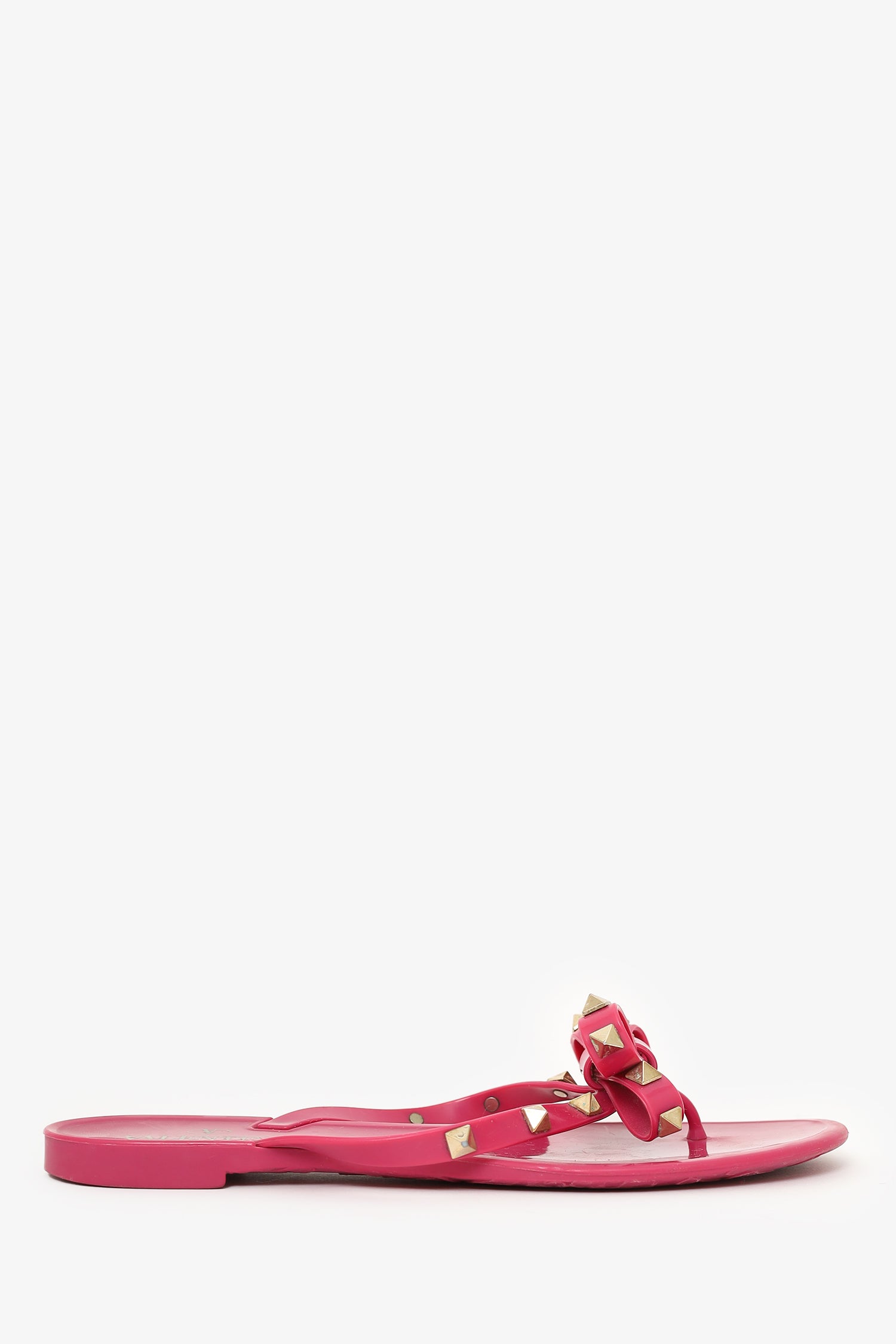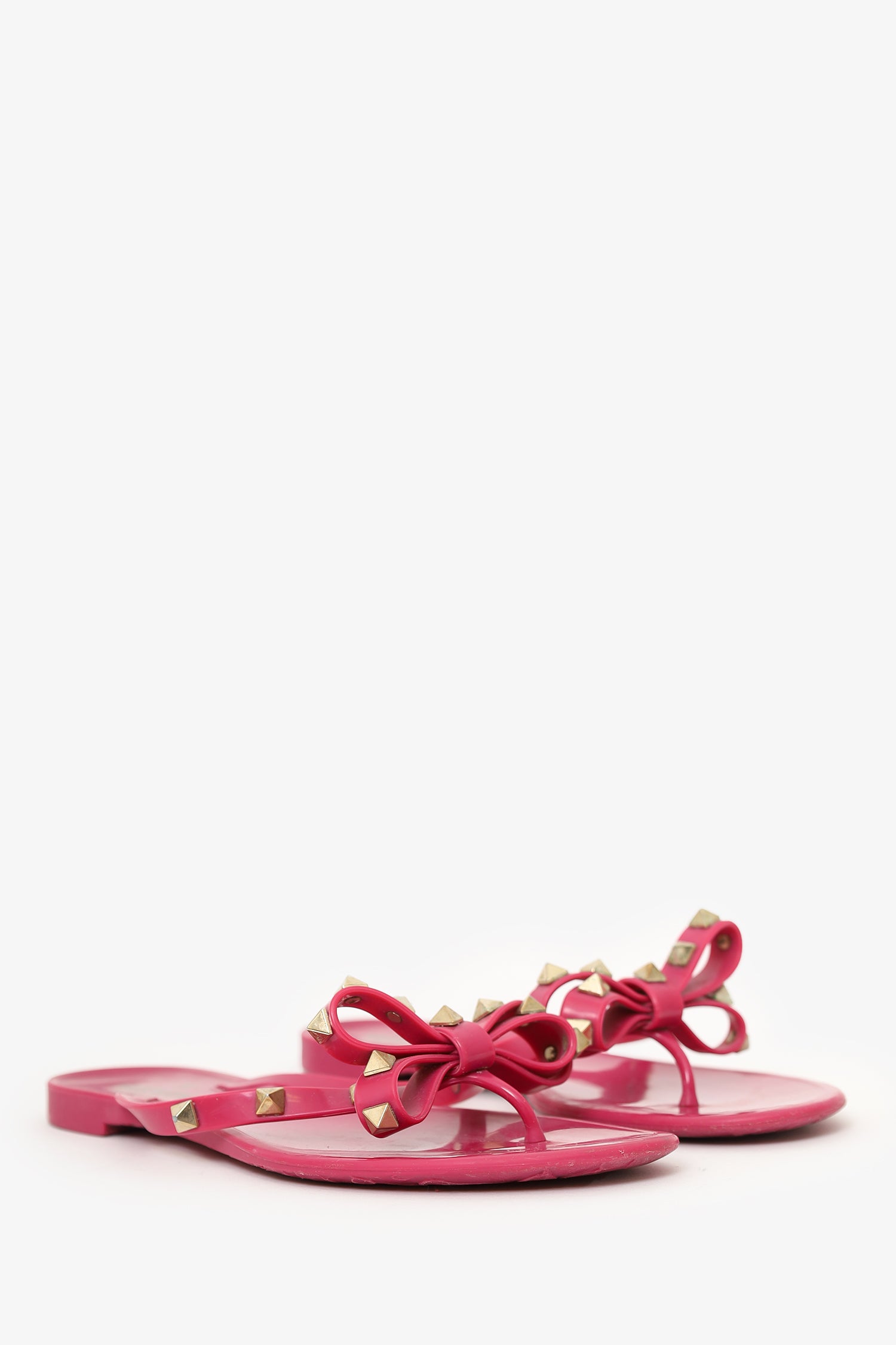 Refresh availabilityValentino Pink Rubber Rockstud Bow Thong Sandals. Slip-on. Open round-toe. Gold-tone hardware. Tonal stitching.