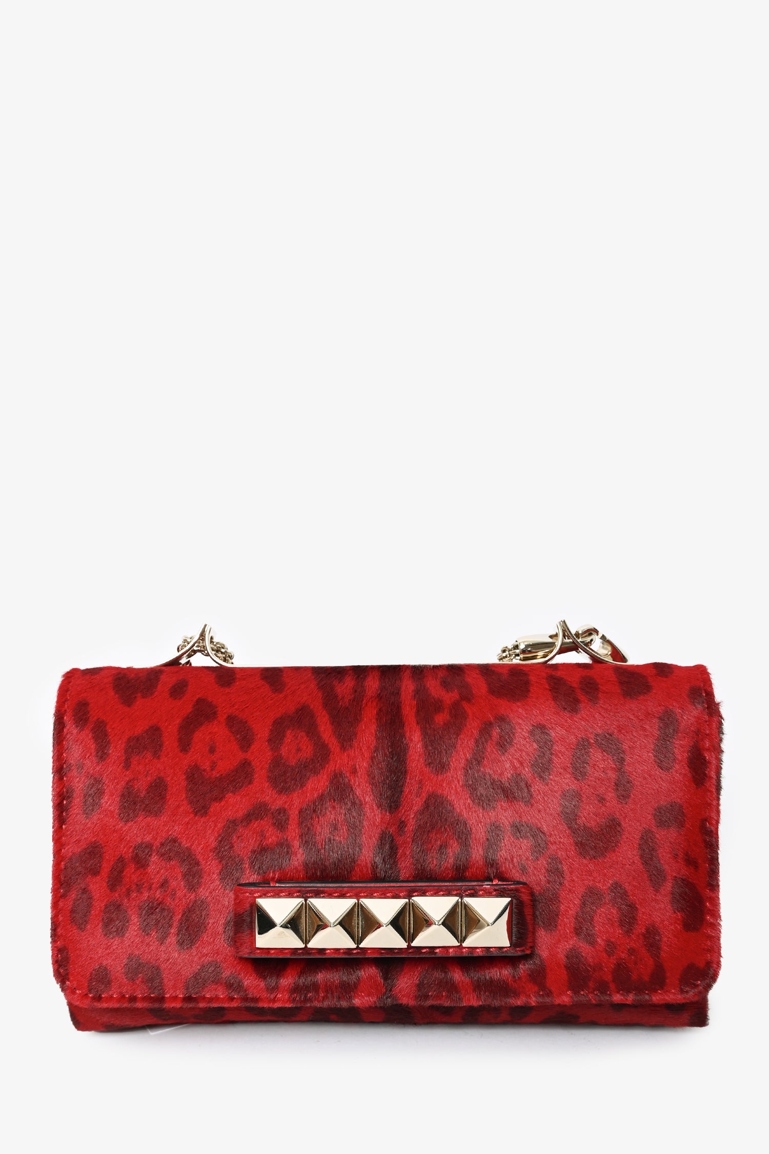 Refresh availabilityValentino Red Calf Hair Leopard Print 'Va Va Voom' Shoulder Bag. Gold-toned hardware. Tonal stitching. Chain-link shoulder strap. Dual magnetic snap closures. Canvas interior. 2 interior compartments and 1 wall pouch. Rockstud accents at centre.