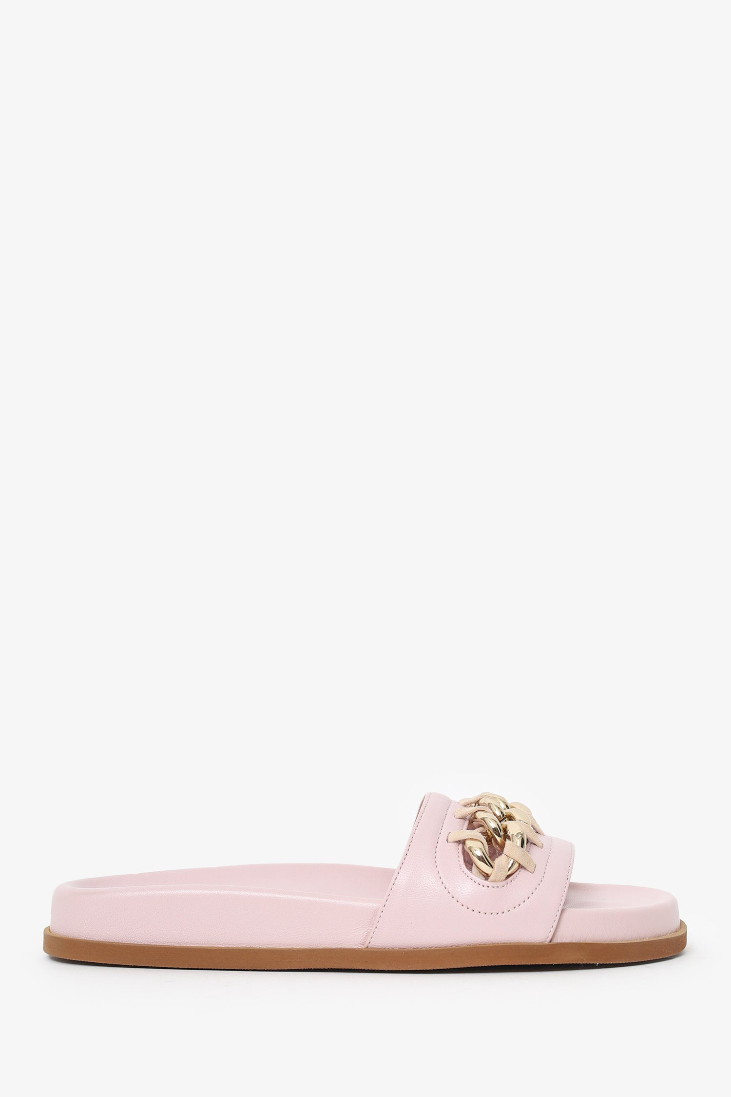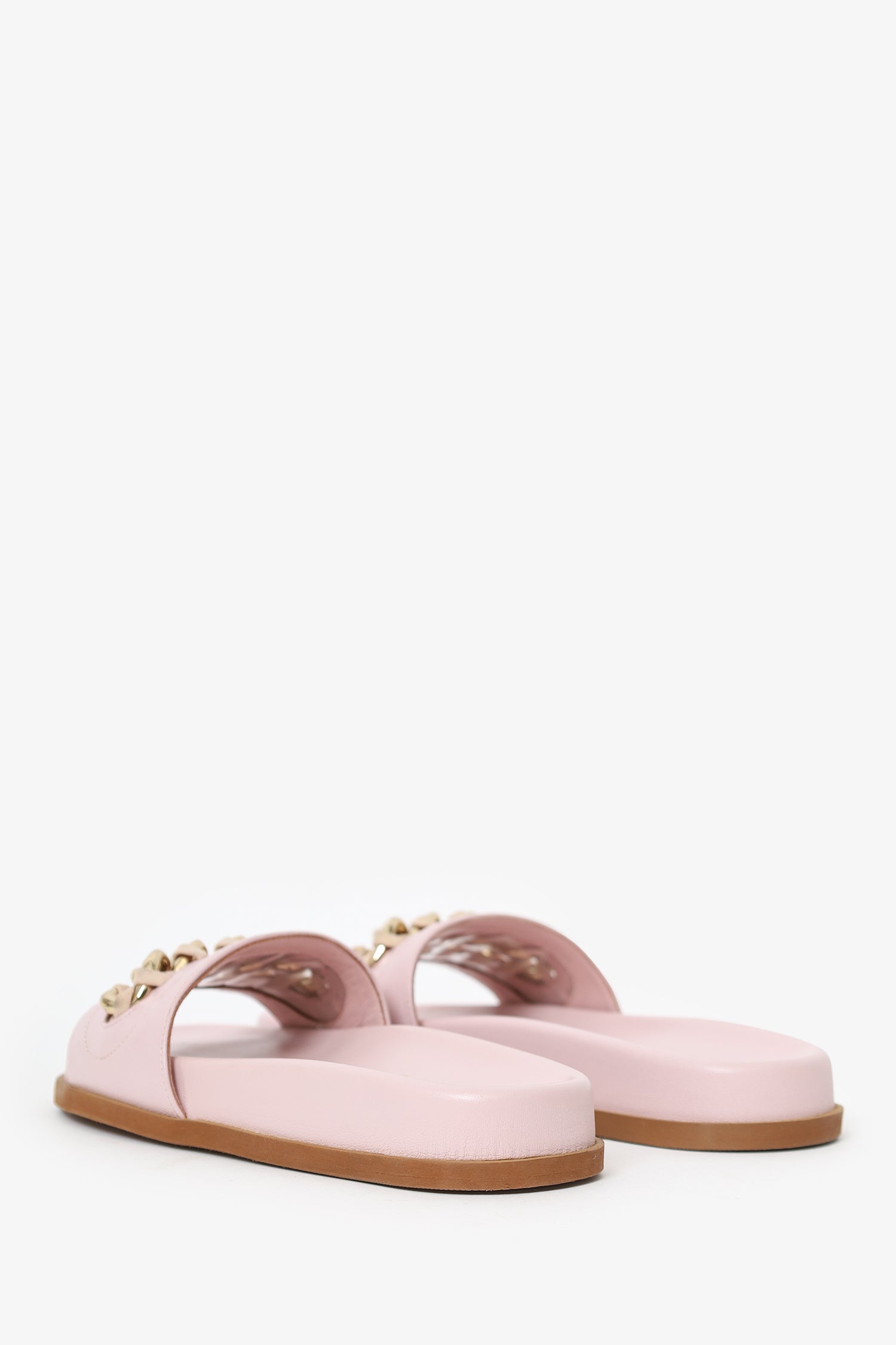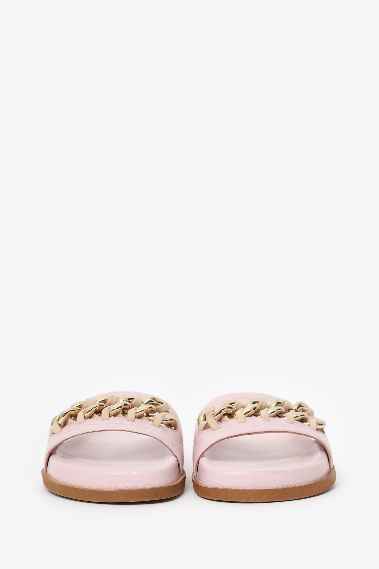 Refresh availabilityValentino Pink Leather Chain Slides. Slip-on. Round toe. Gold-tone hardware. Tonal stitching.