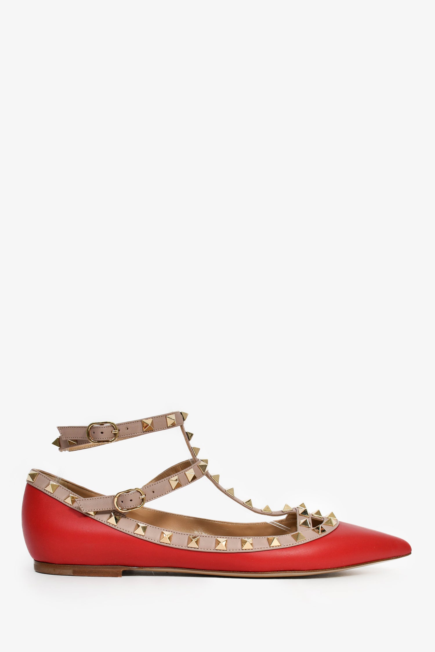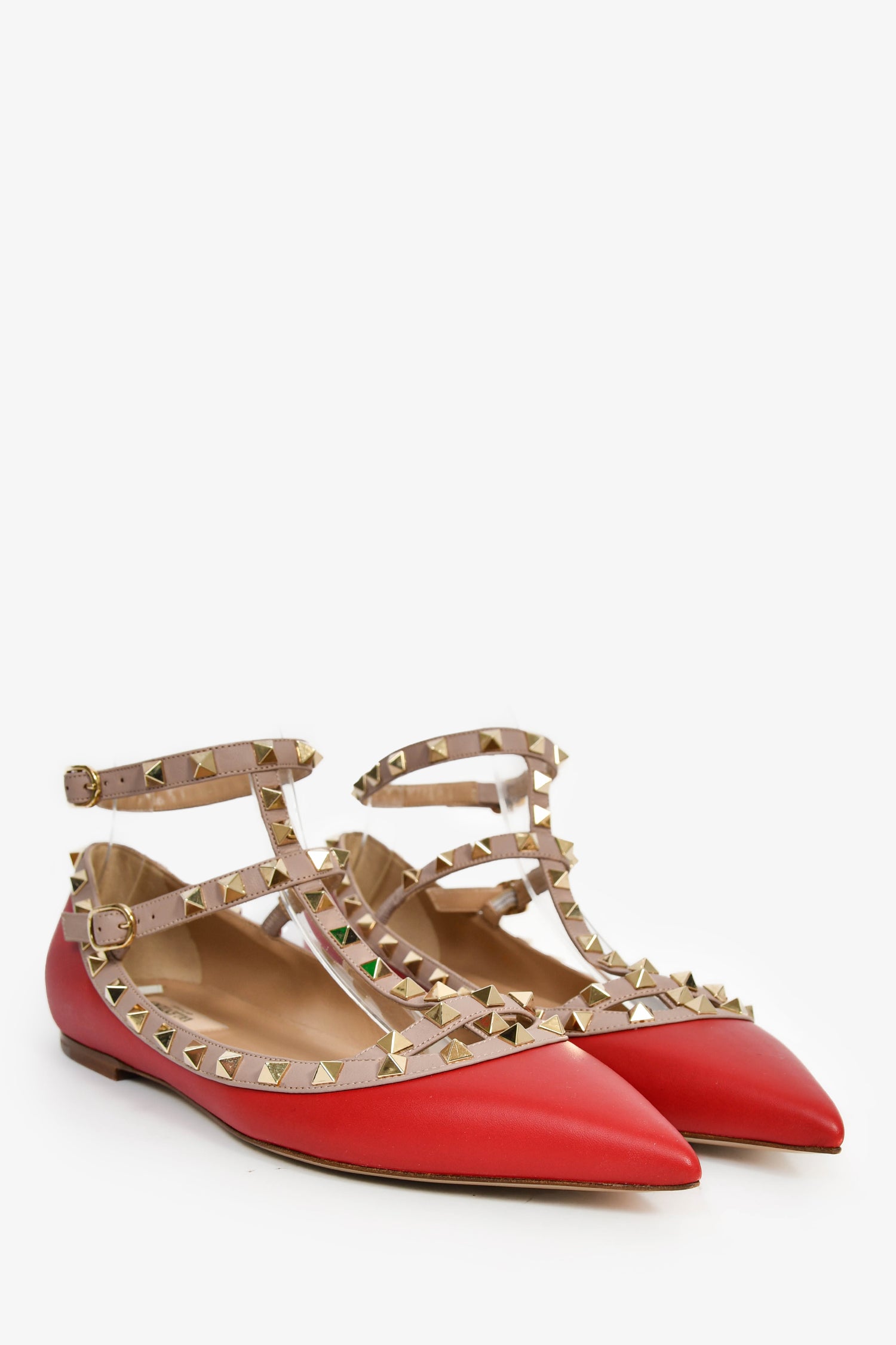 Refresh availabilityValentino Red Leather Rockstud Cage Pointed Toe Ballet Flats. Slip-on. Pointed-toe. Ankle straps with adjustable buckle closure. Leather insoles. Gold-tone hardware. Tonal stitching.