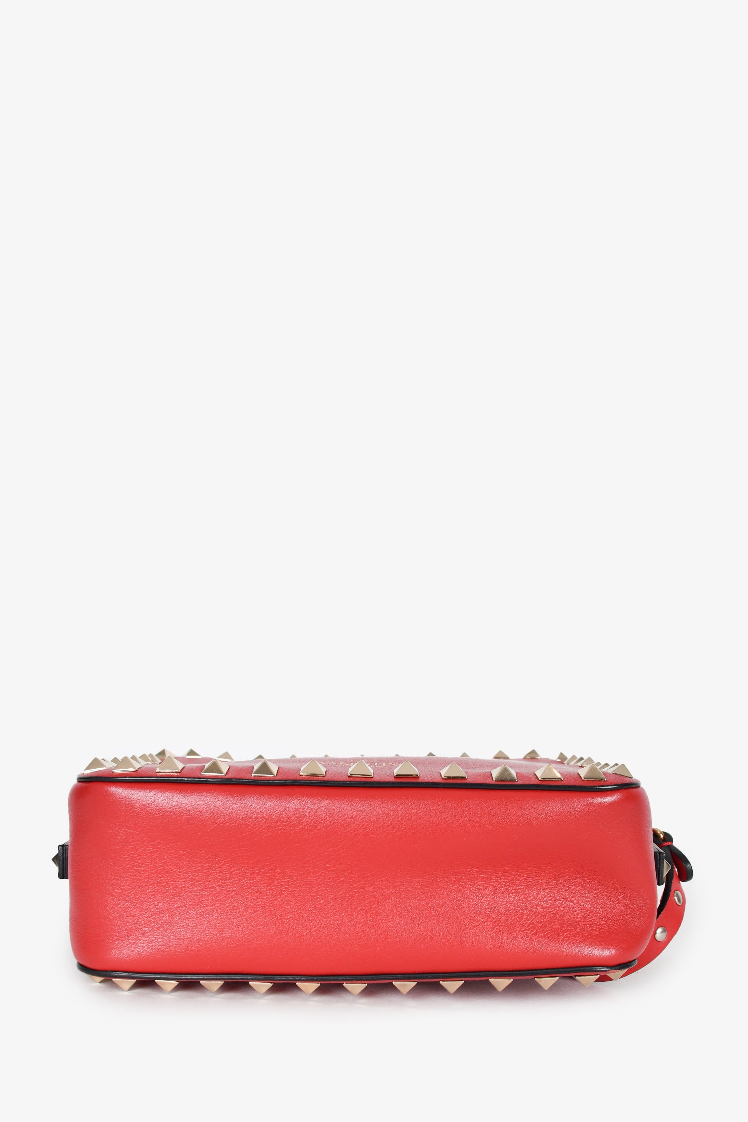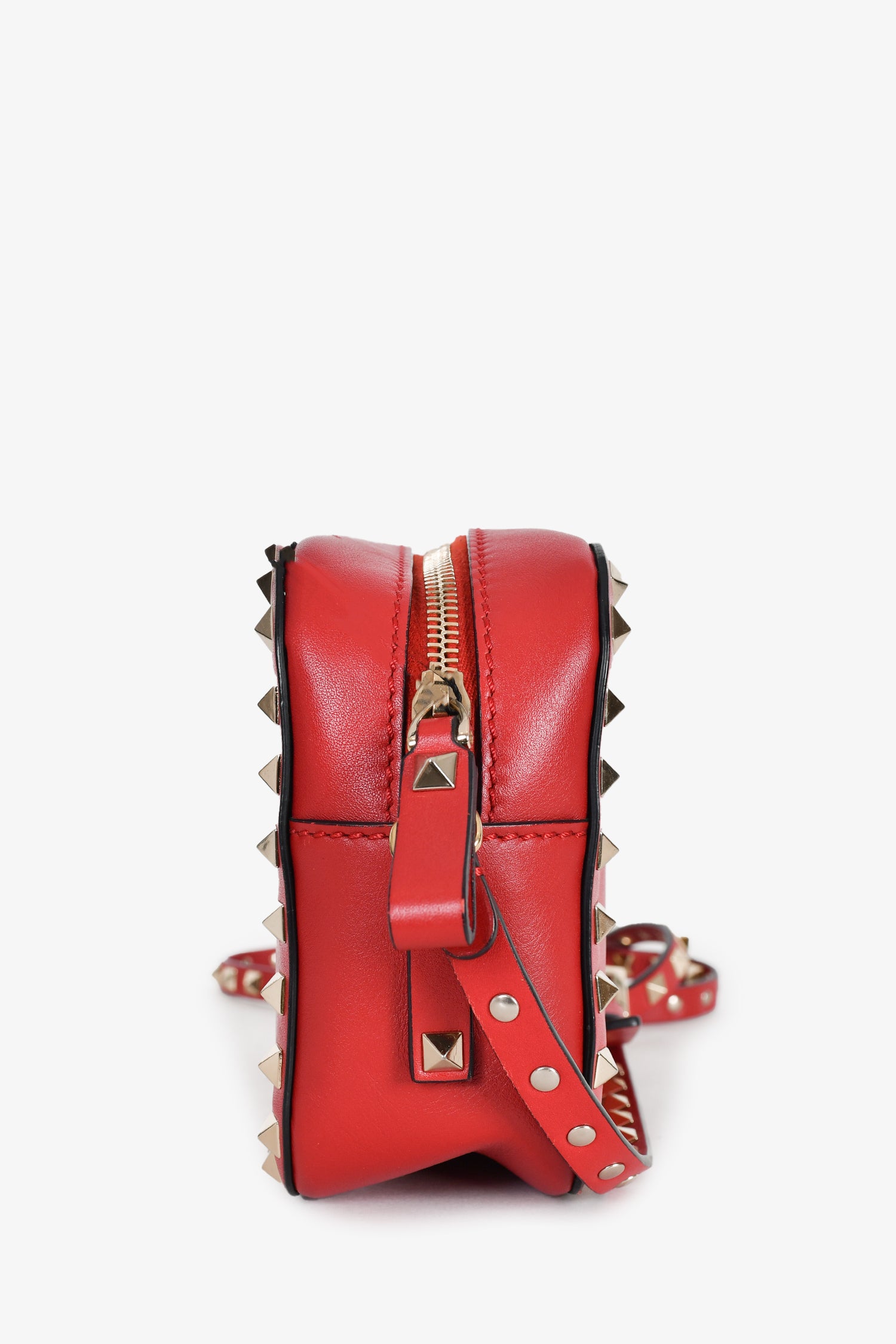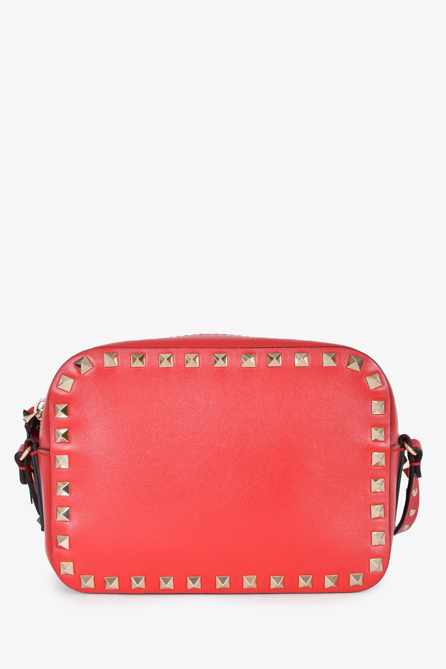 Refresh availabilityValentino Red Leather Rockstud Camera Bag. Gold-tone hardware. Stud detailing contours the bag along with the strap. Zipper closure. Card compartment inside. Tonal stitching.