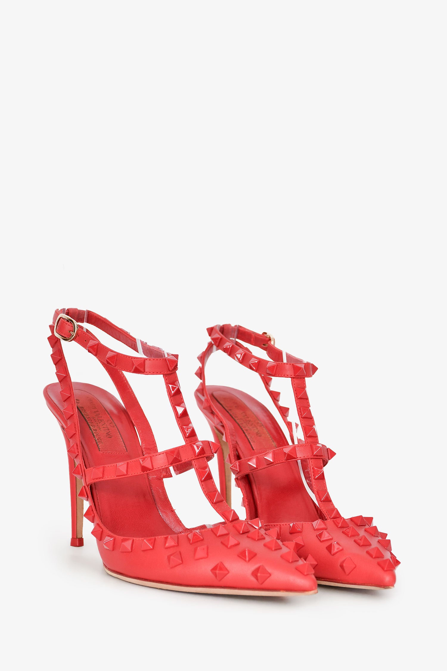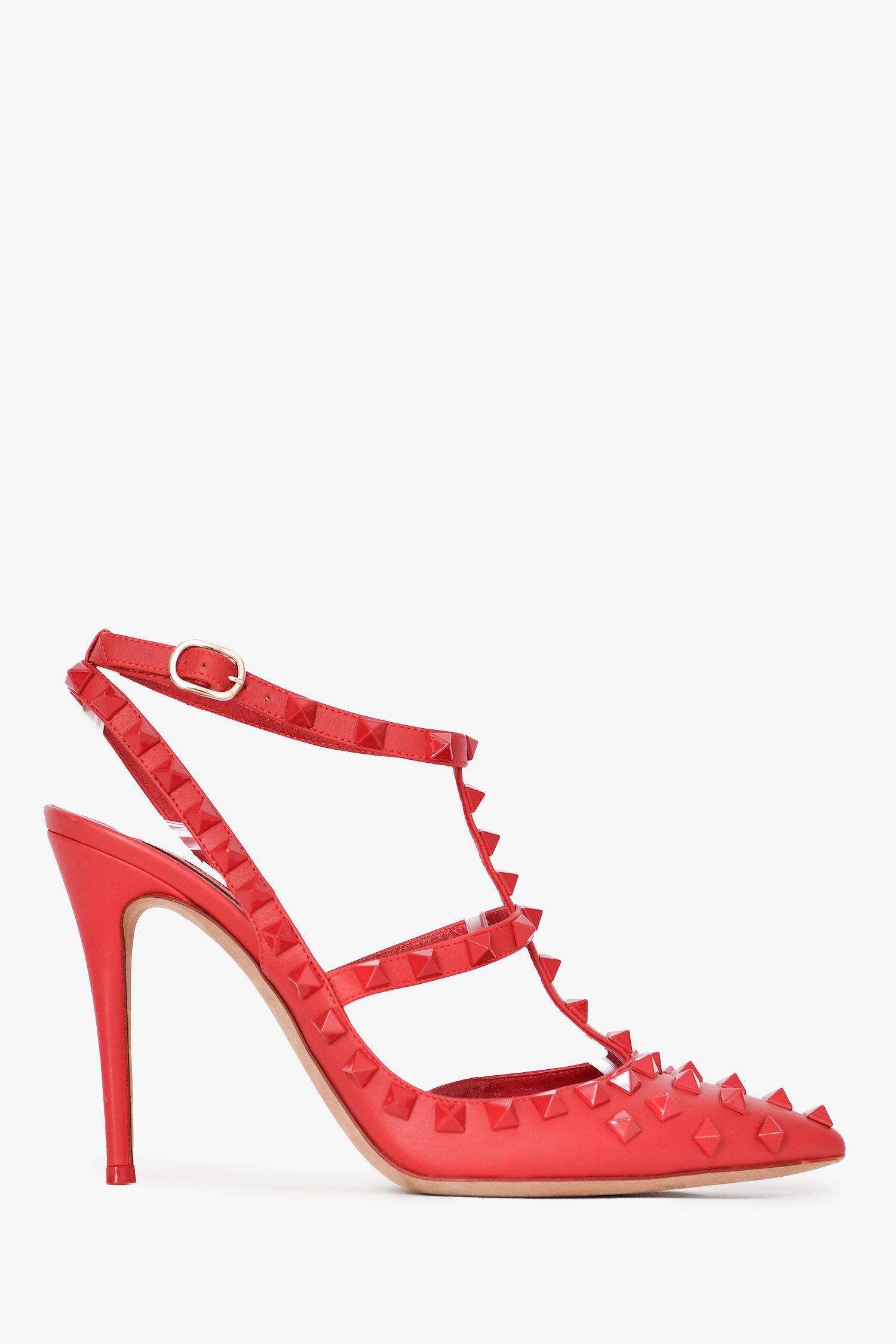 Refresh availabilityValentino Red Leather Rockstud Rouge Heels. Pointed toe front. Rockstuds. Stiletto heel. Gold-tone pin-buckle. Tonal stitching.