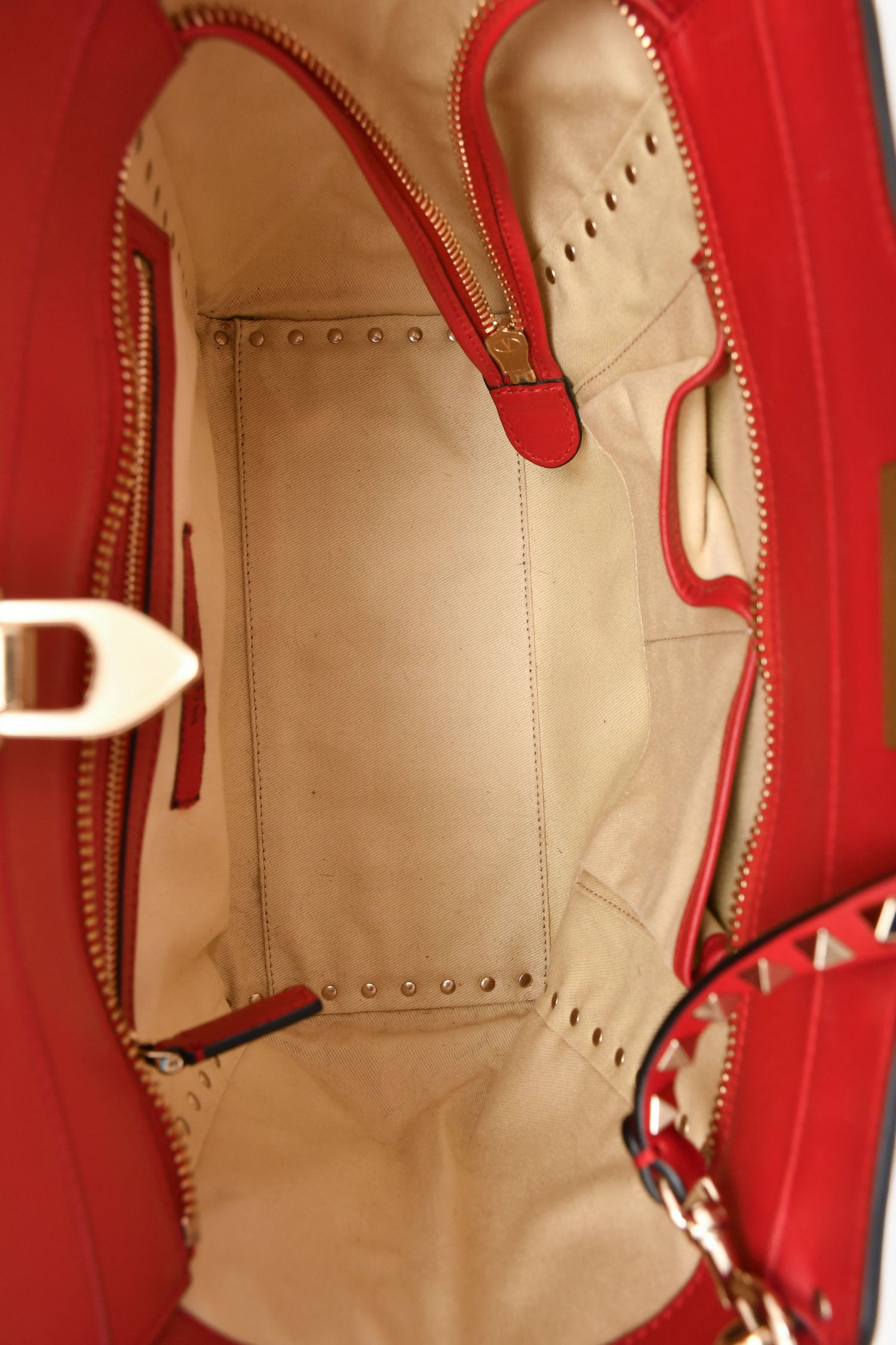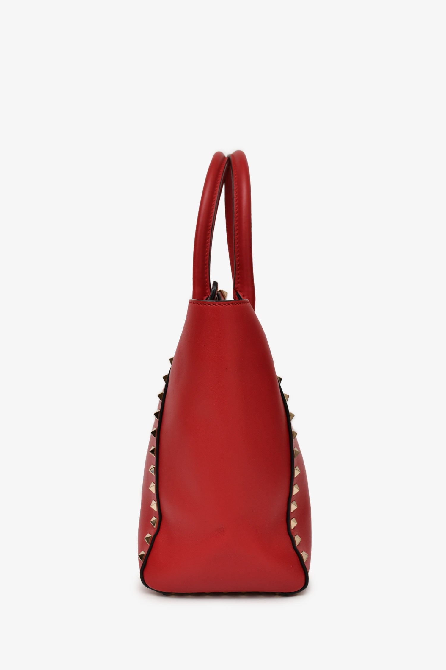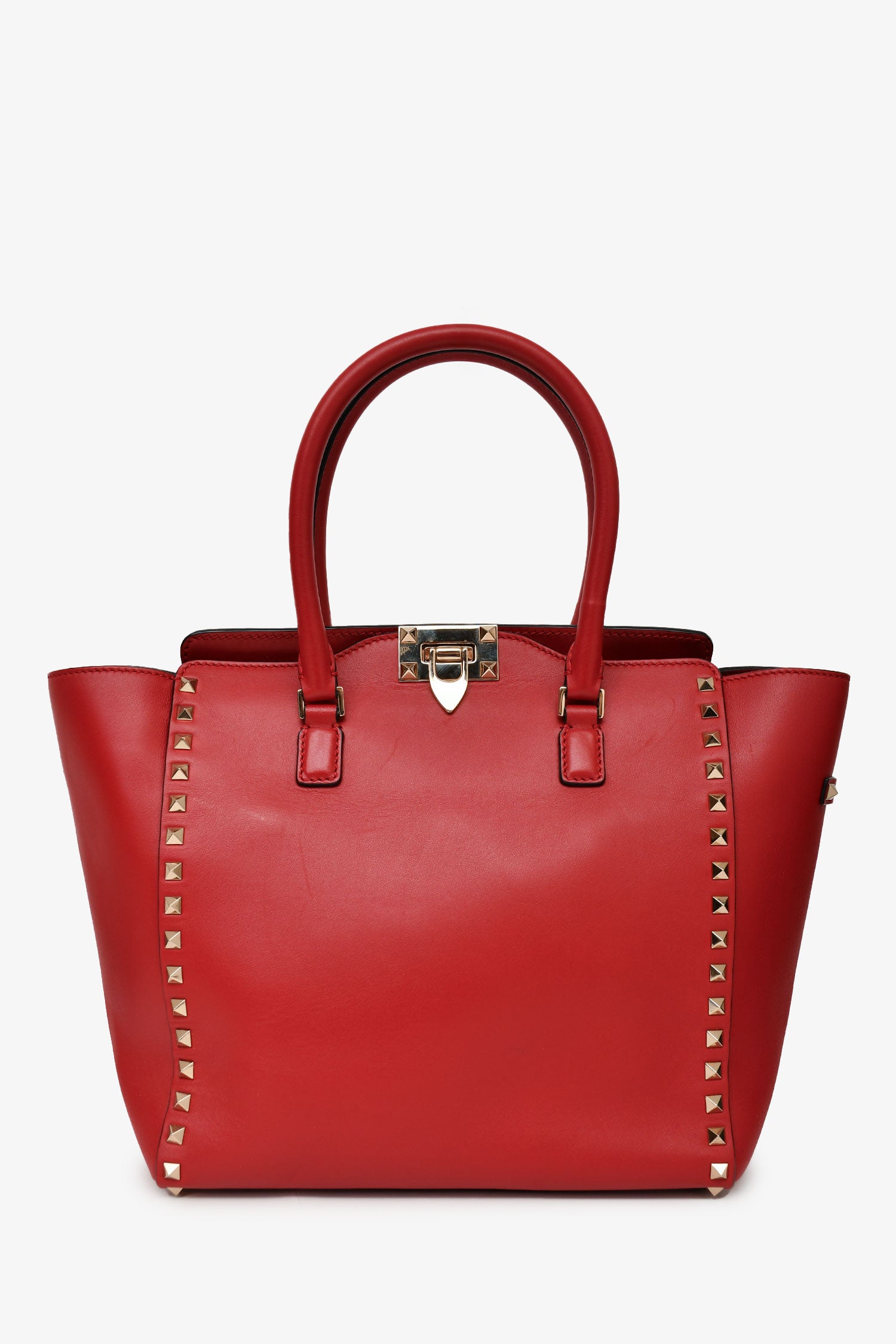 Refresh availabilityValentino Red Leather Rockstud Tote. Top flip-lock closure. Double top handles. Removable shoulder strap. Single interior zip pocket. 2 interior slip pockets. Beige textile interior lining. Gold-toned hardware. Tonal stitching.