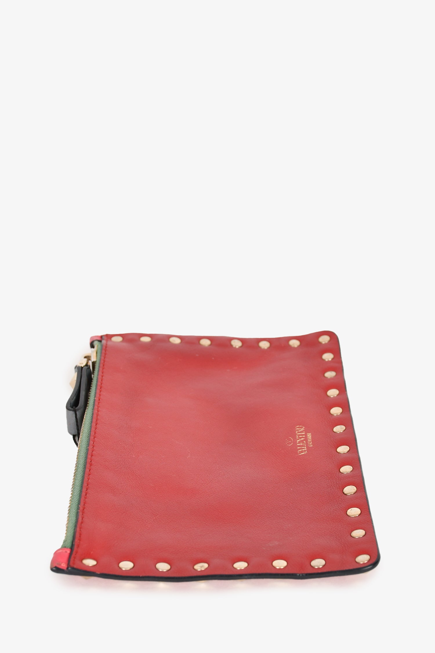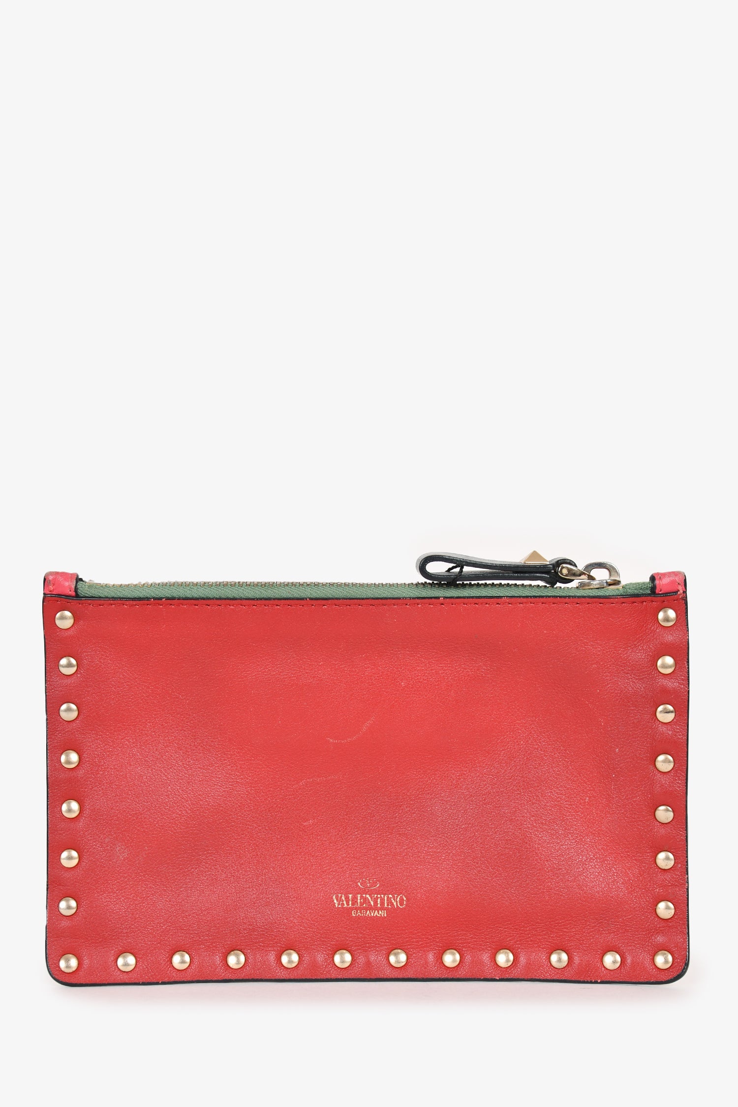 Refresh availabilityValentino Red/Pink Studded Zip Pouch. Top zip closure. Black textile interior lining. Open interior.