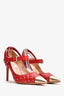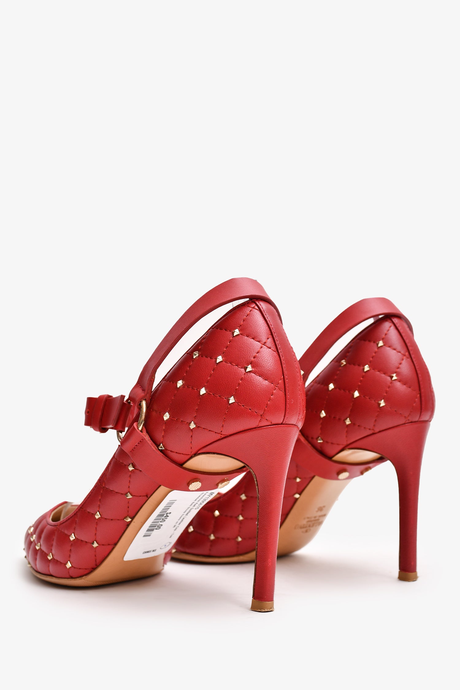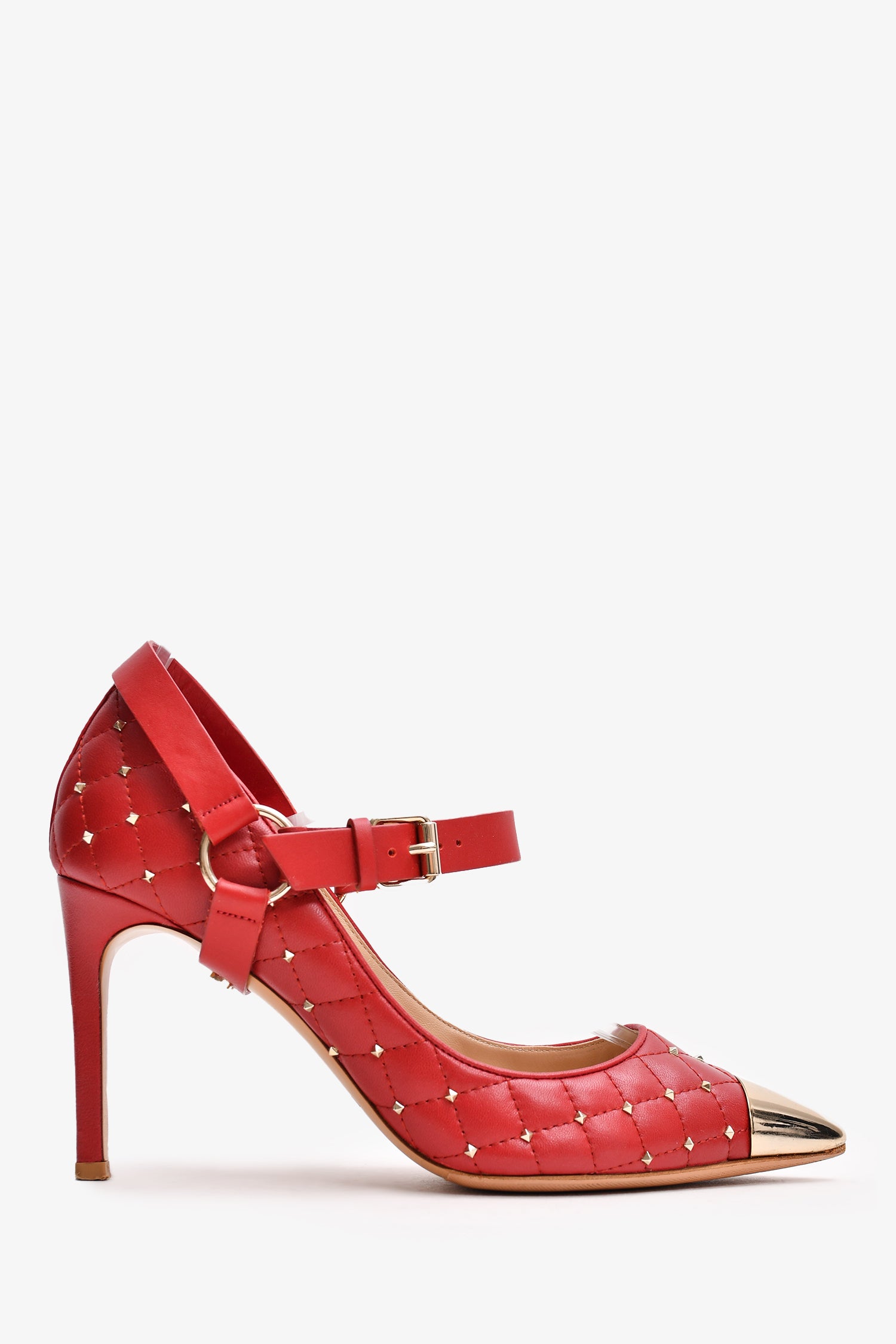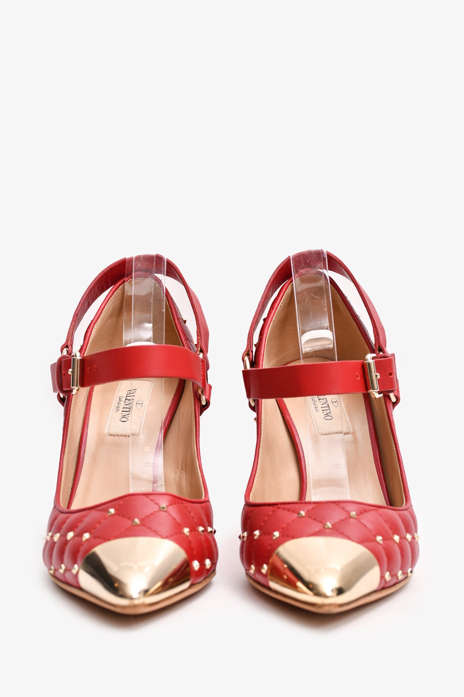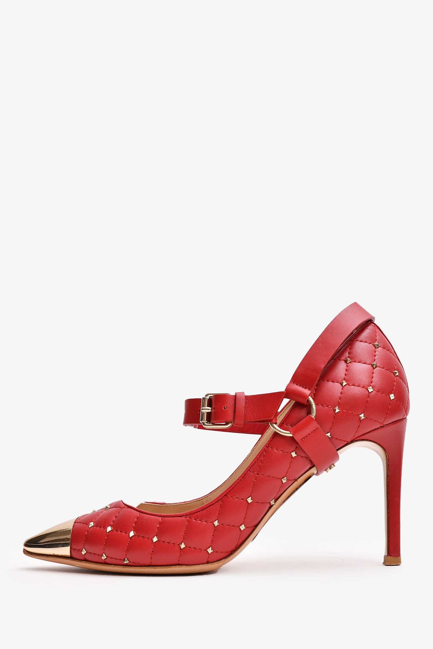 Valentino Red Quilted Leather Cap-Toe Studded Belt Strap Heels Size 36