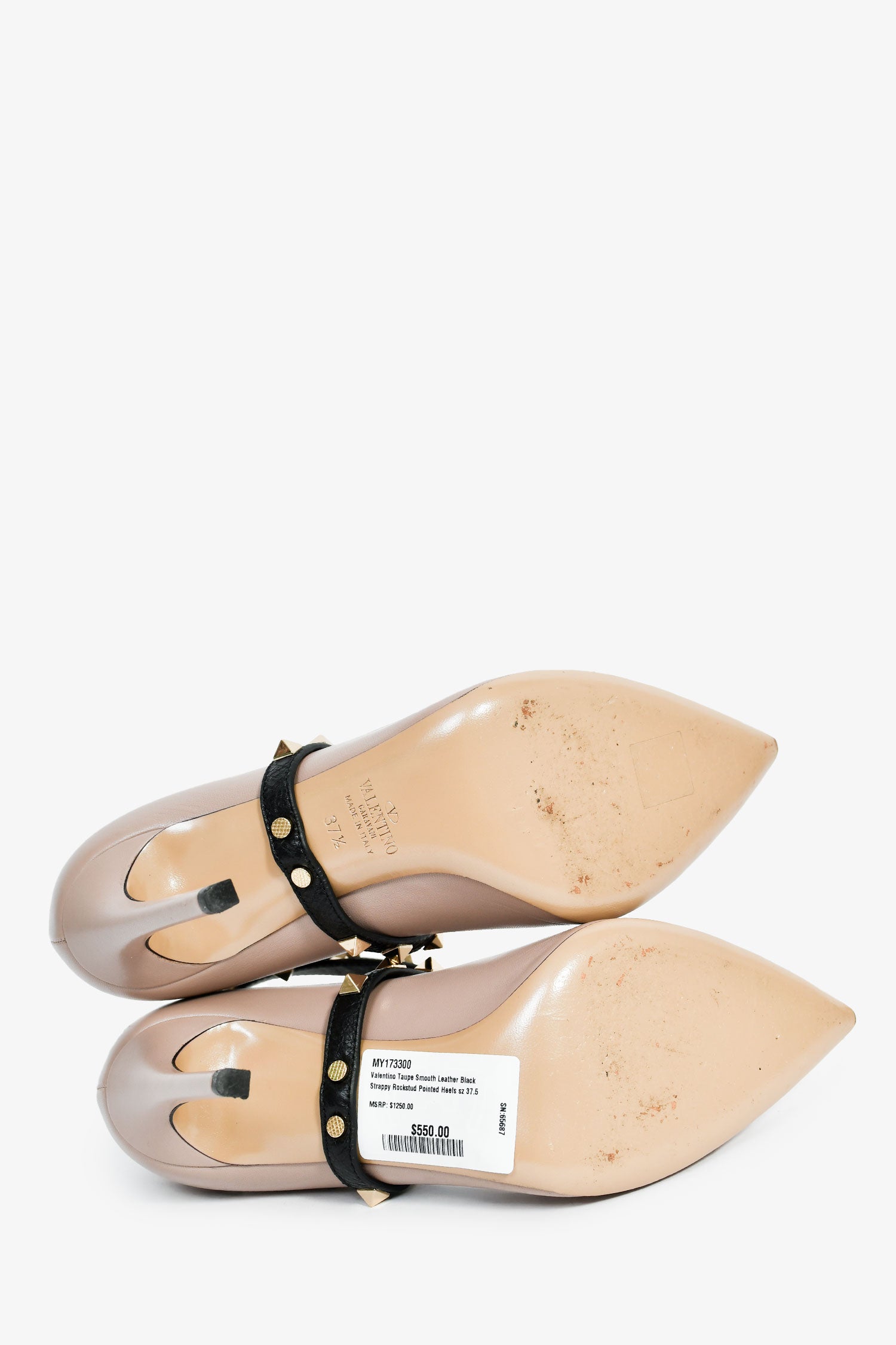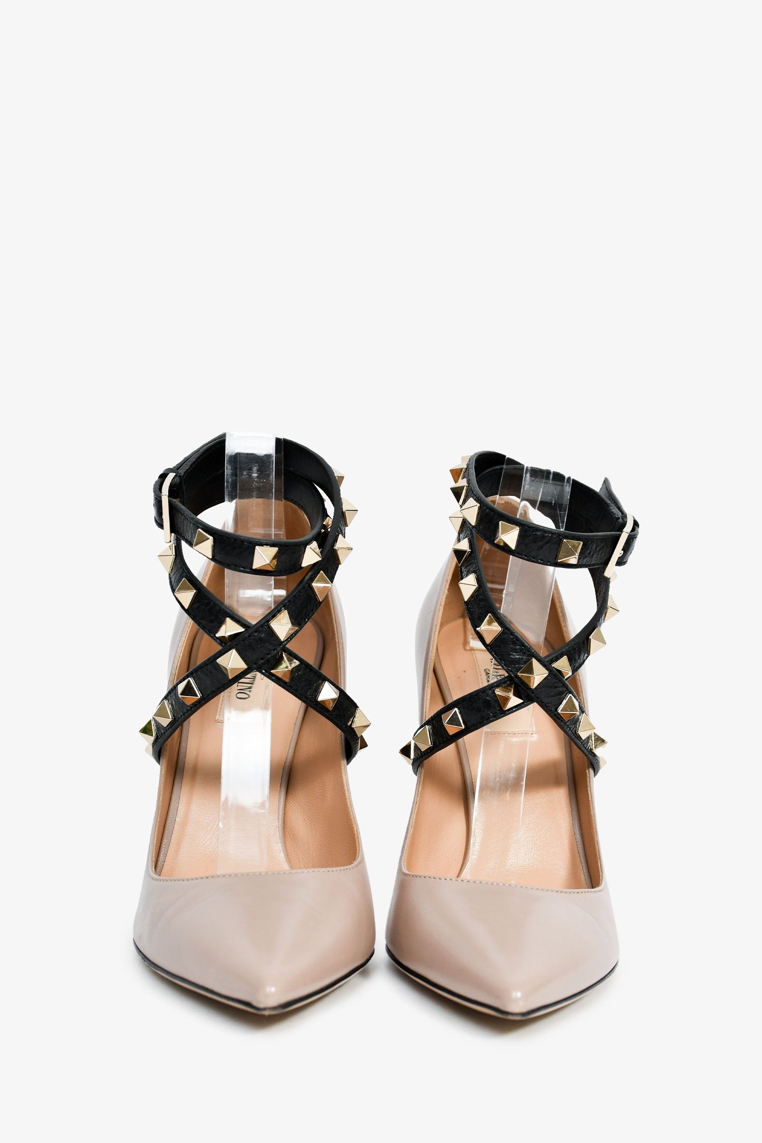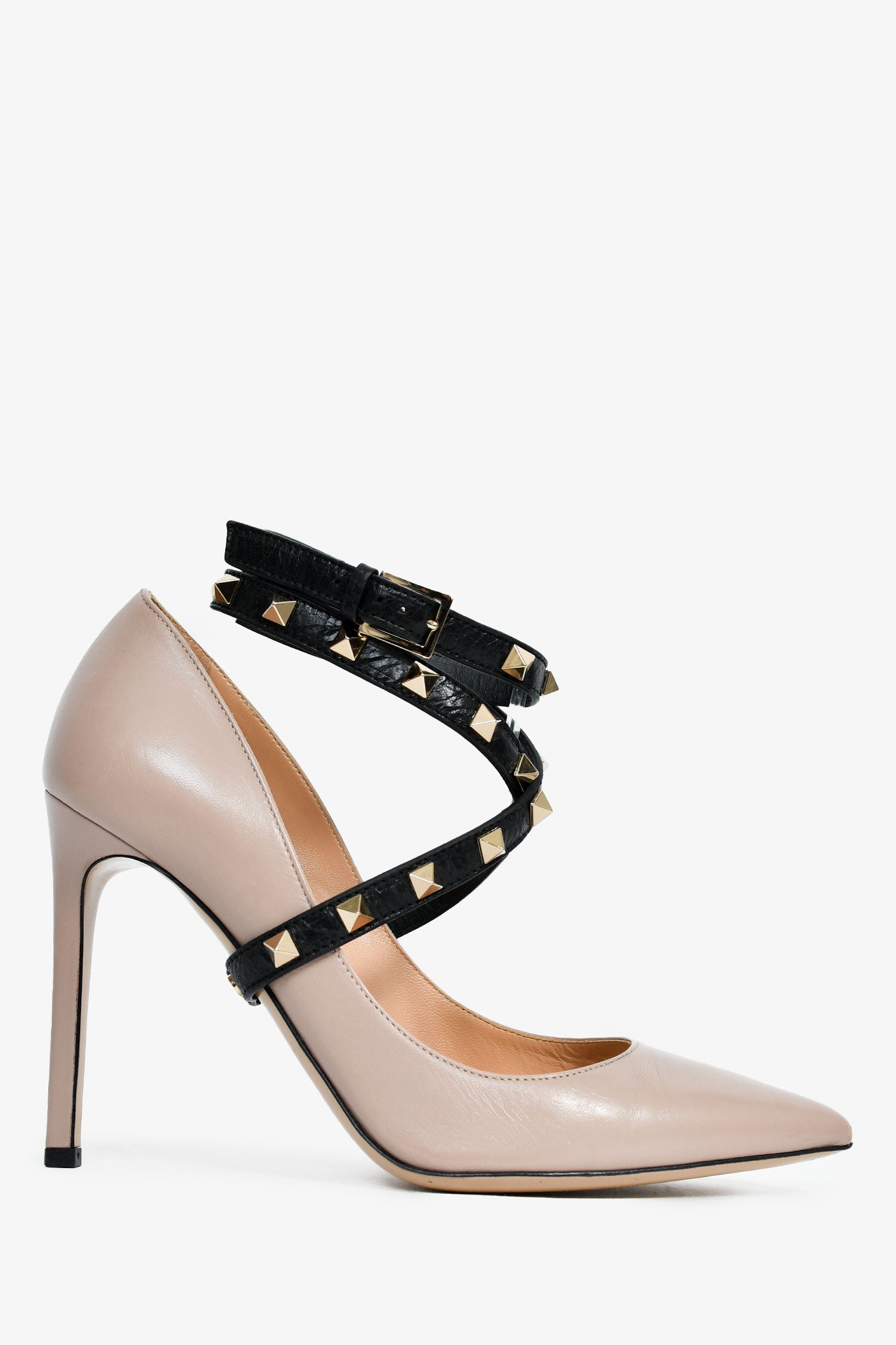 Refresh availabilityValentino Taupe Smooth Leather Black Strappy Rockstud Pointed Heels. Pointed toe. Wrap ankle straps with adjustable pull-through closure. Leather insoles. Gold-tone hardware. Tonal stitching.