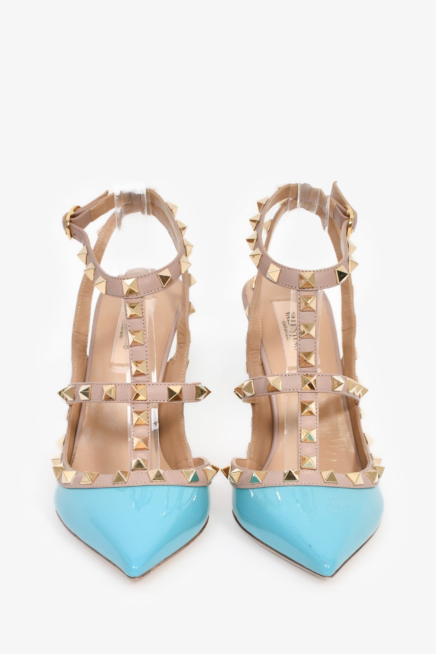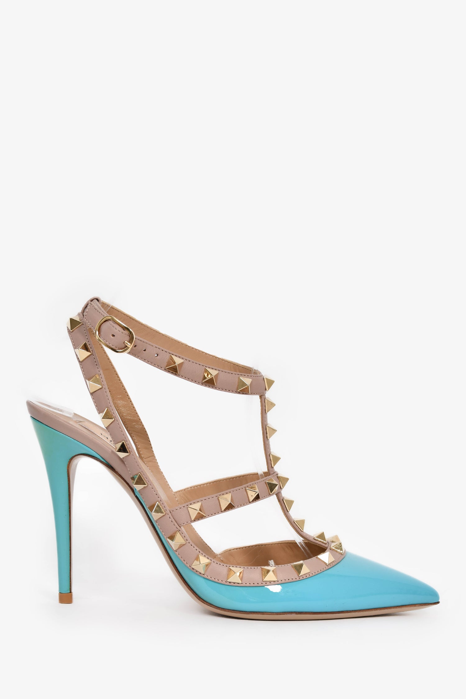 Refresh availabilityValentino Taupe/Blue Patent Cage Rockstud Heels. Slip-on. Pointed toe. Ankle strap with buckle closure. Gold-tone hardware. Tonal stitching.