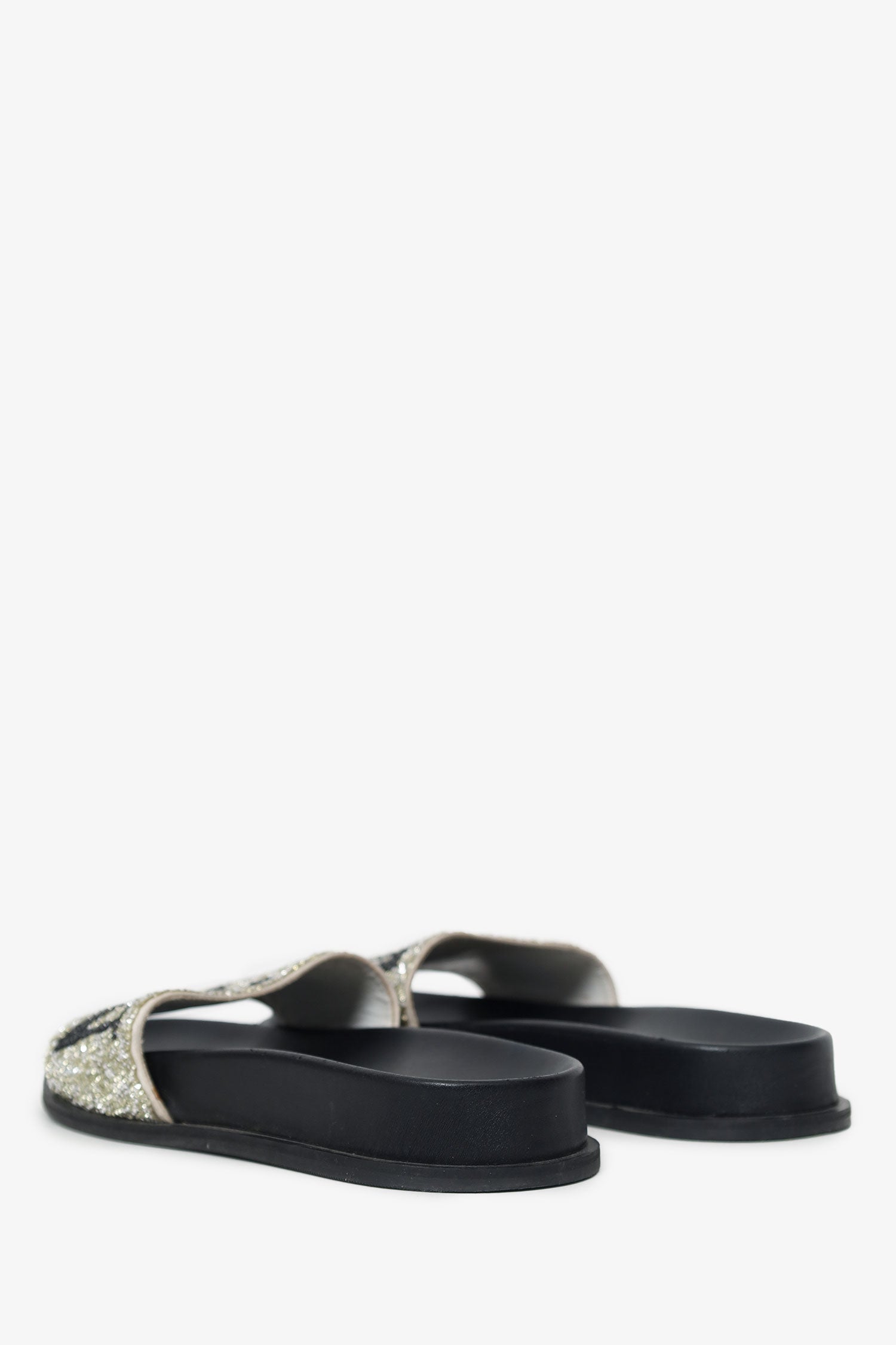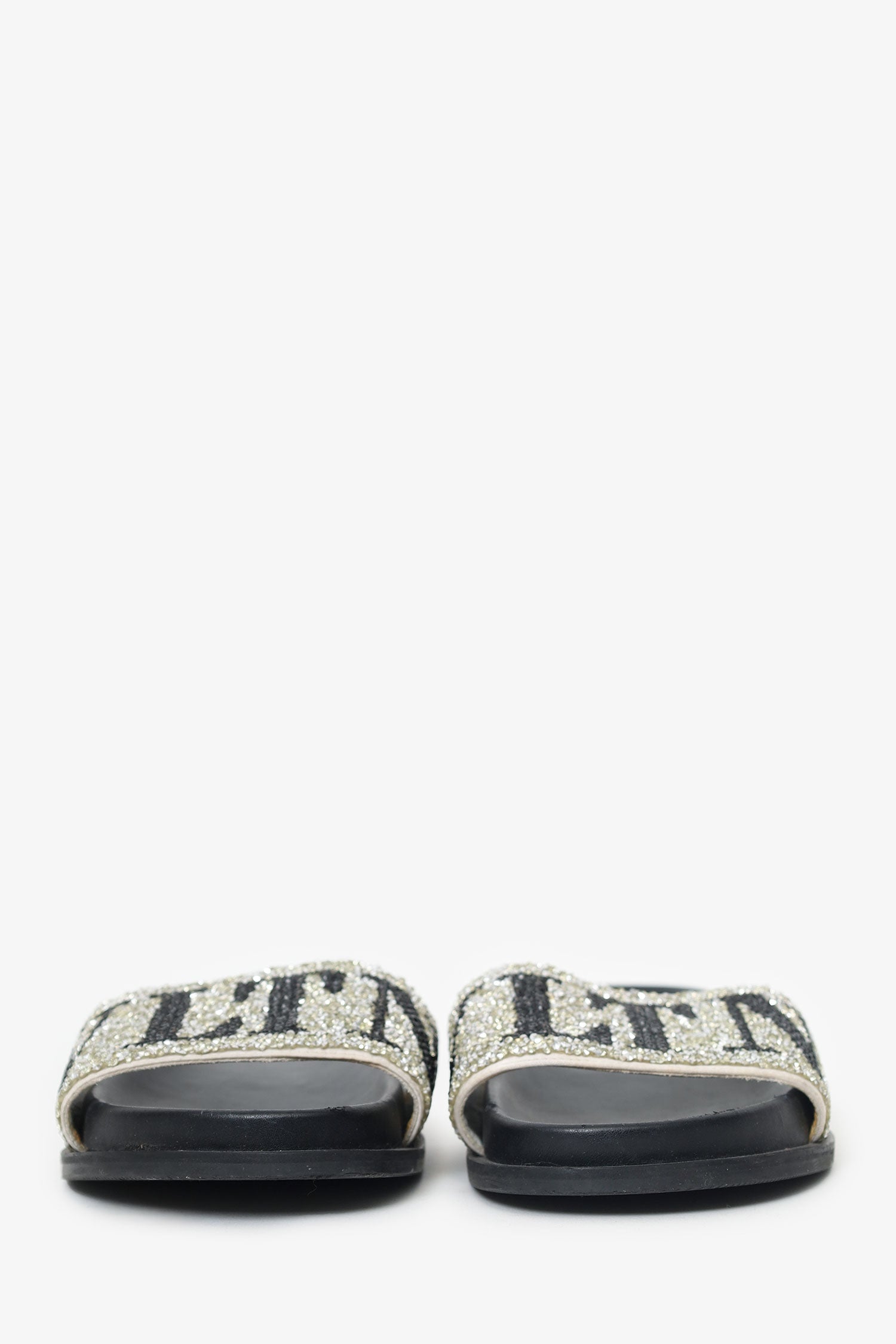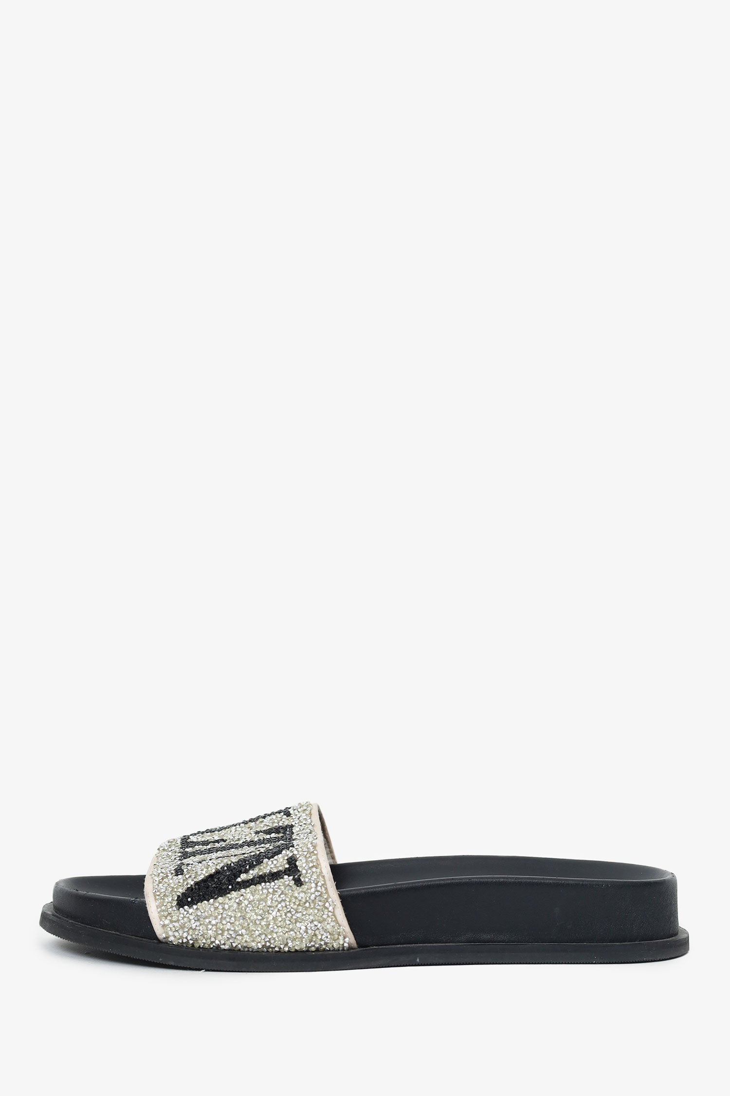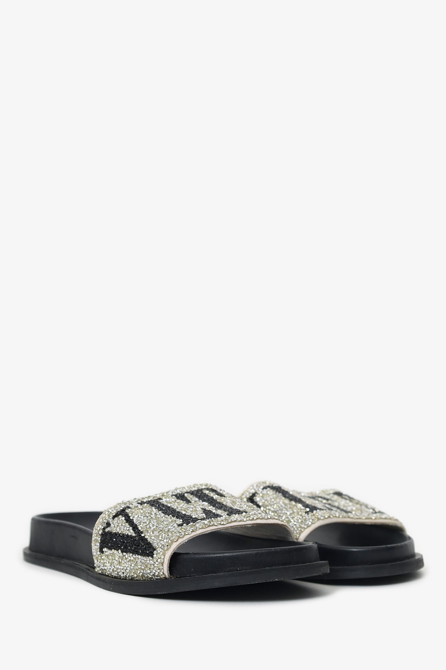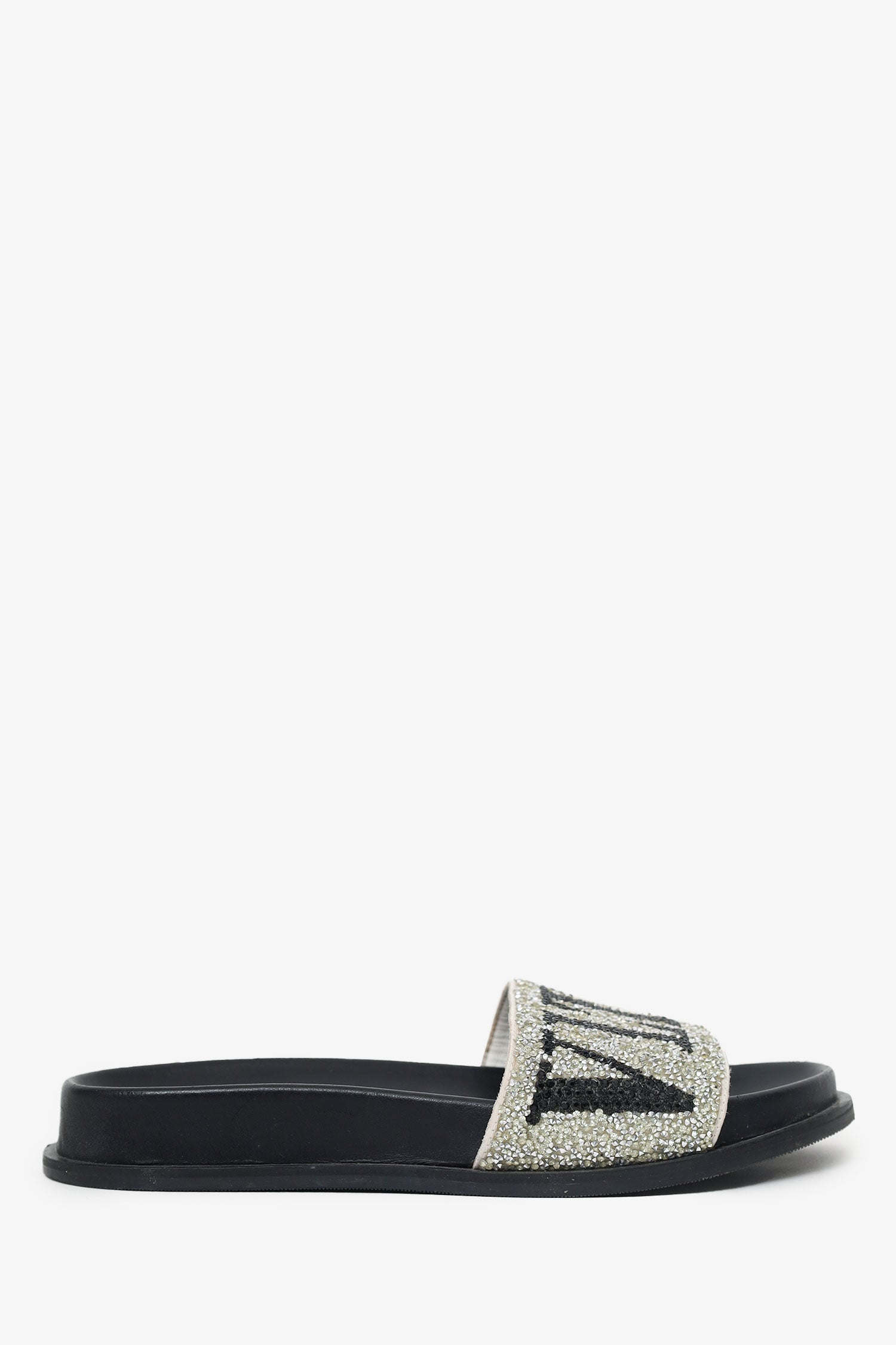 Refresh availabilityValentino VLTN Black Slide Sandals. Slip-on. Pointed round-toe. Crystal embellished vamp. Tonal stitching.